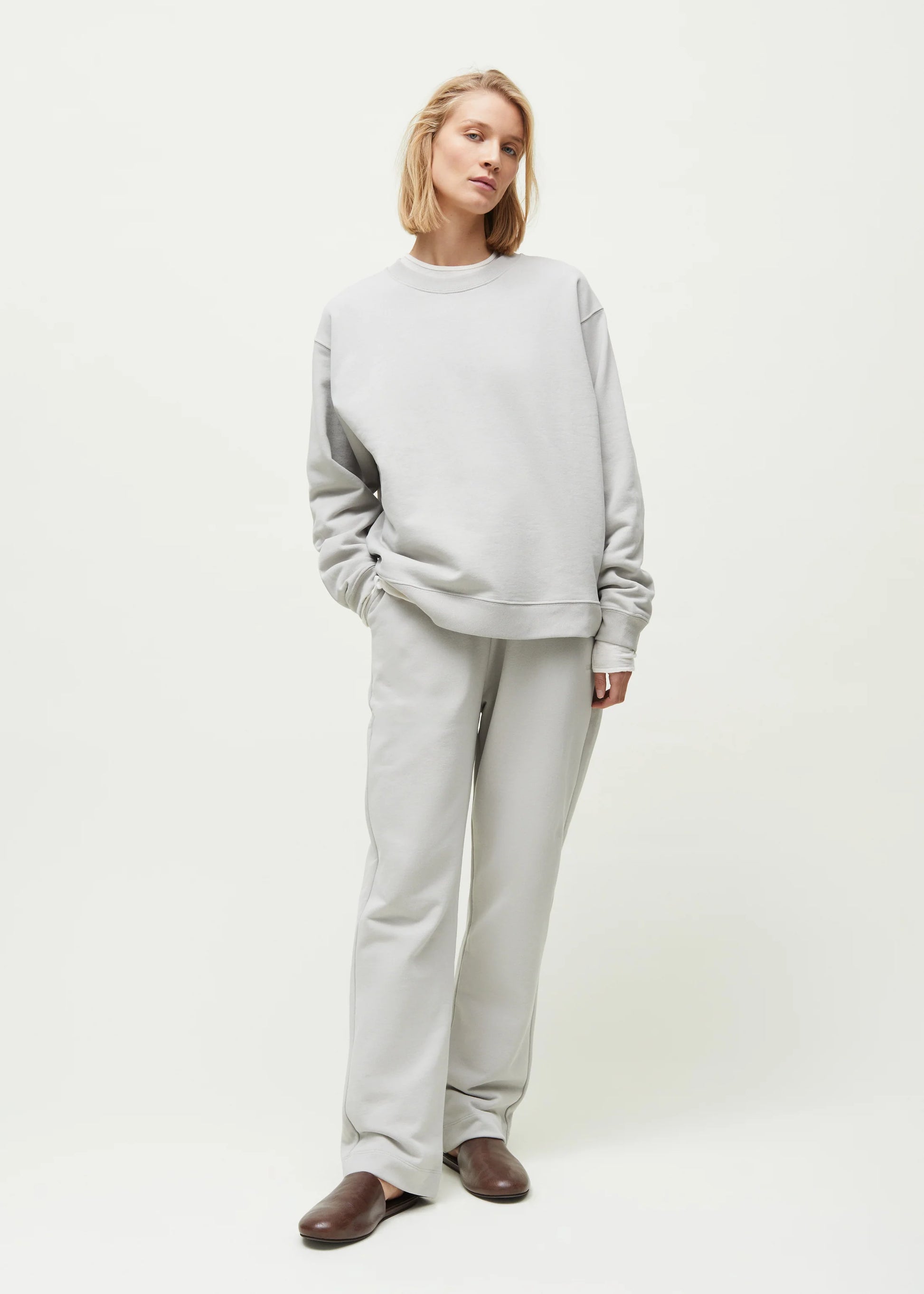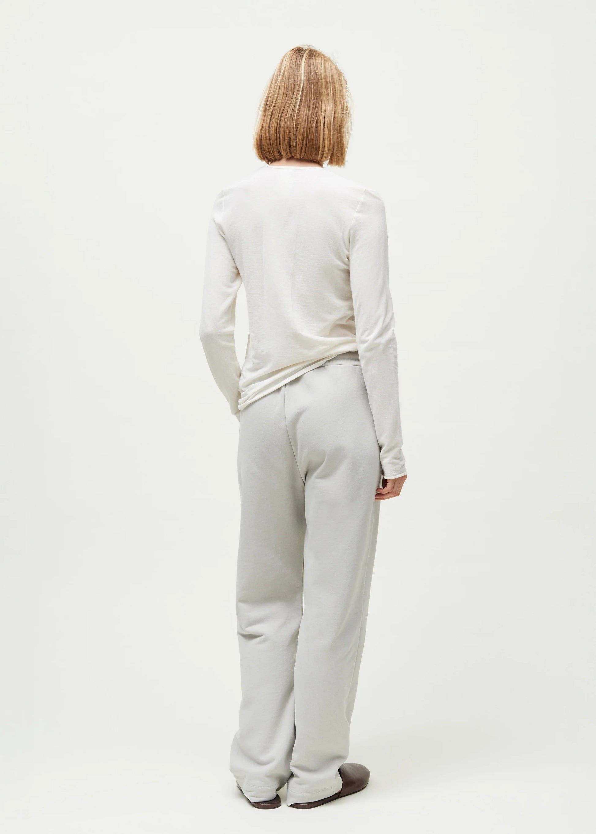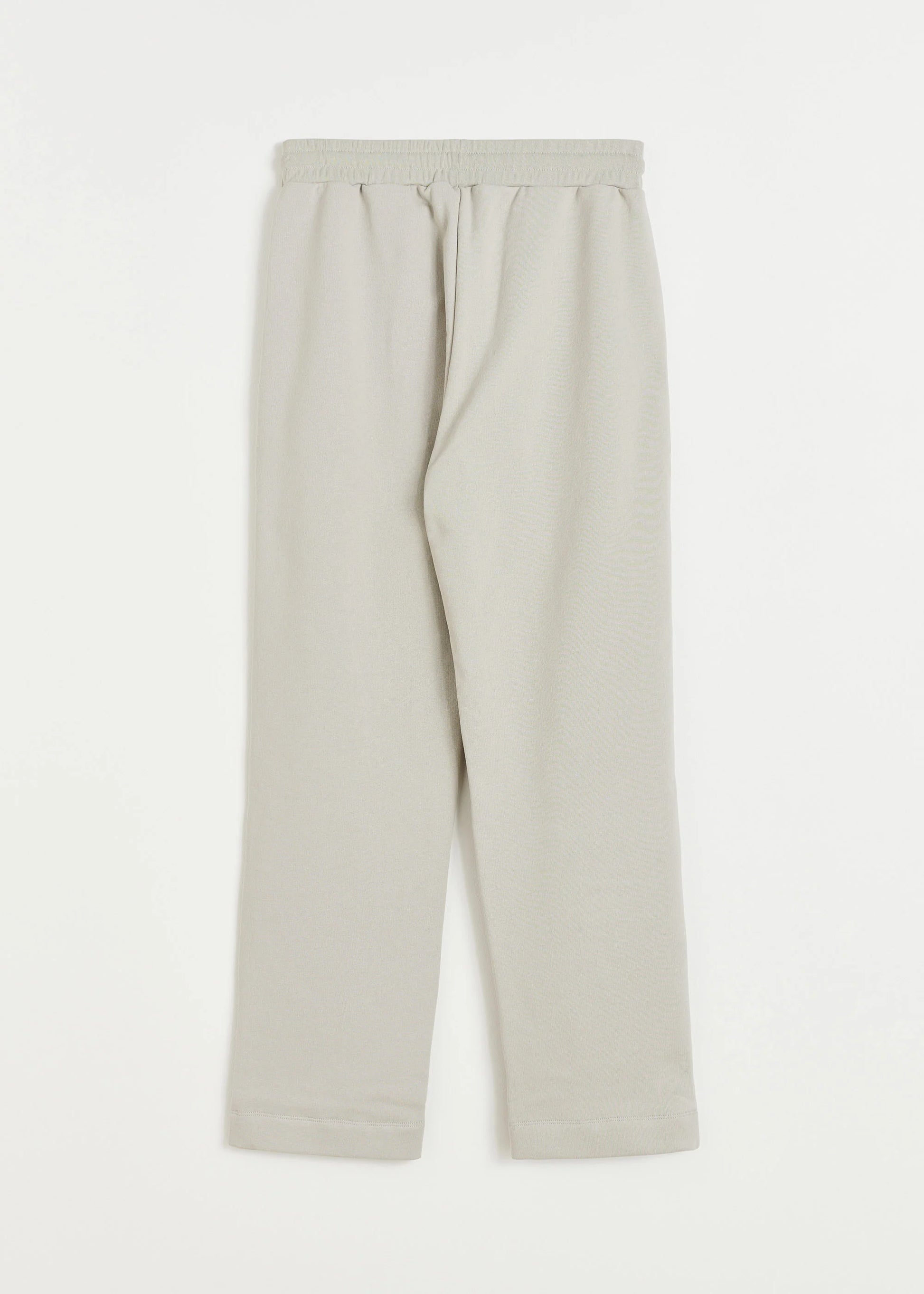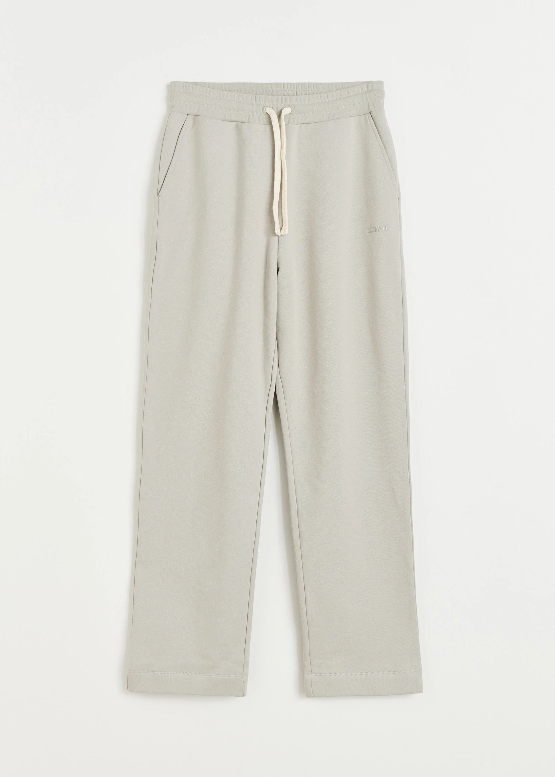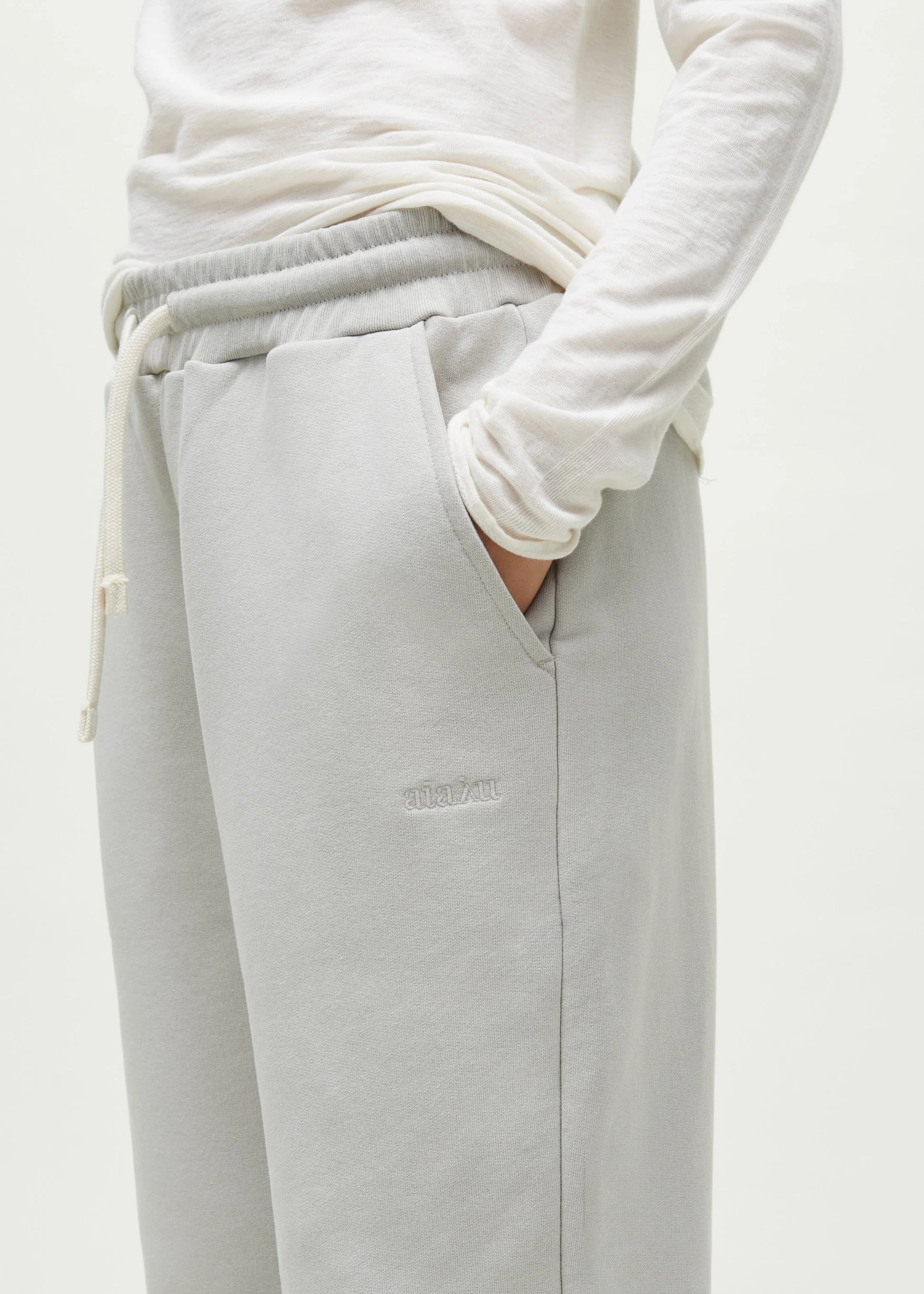 Aiayu skriver; A pair of classic sweatpants made from recycled organic cotton. Designed in a relaxed, comfortable fit with an elasticated waistband and drawstring, side pockets, wide ribbed cuffs, and a subtle tone-on-tone embroidered aiayu logo on the thigh.