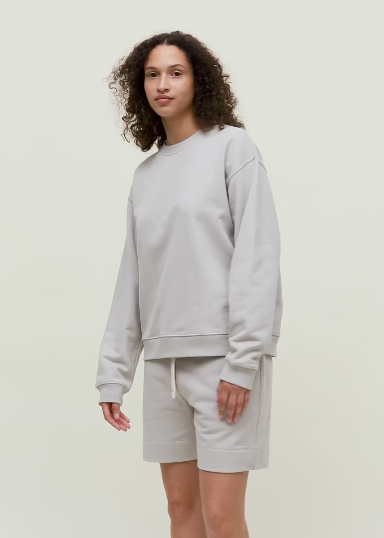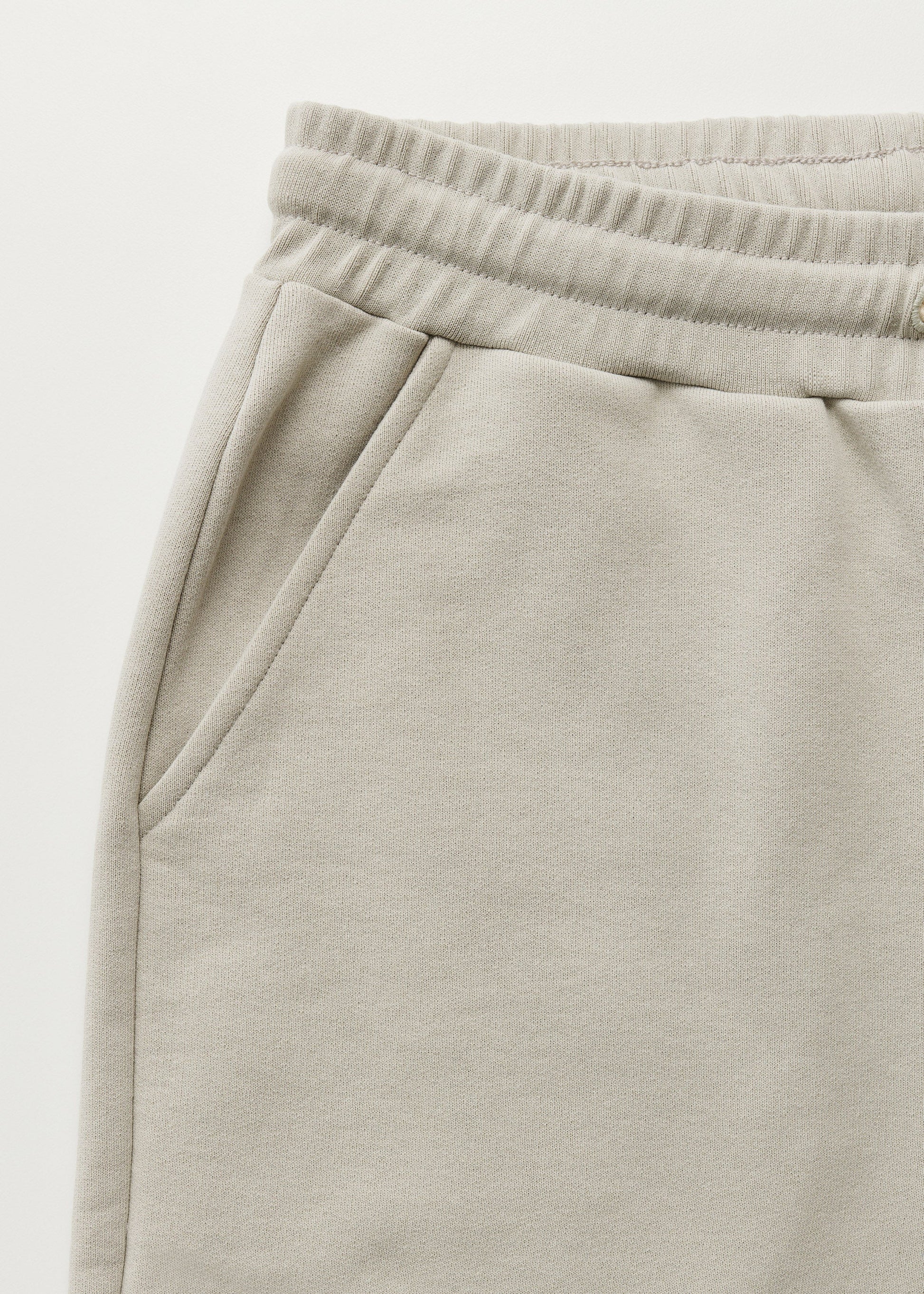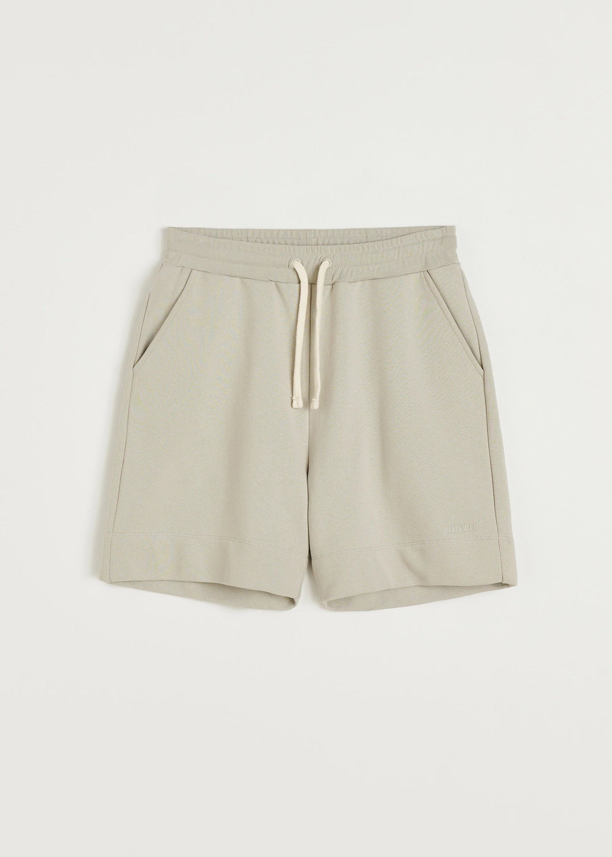 Aiayu skriver; A pair of classic sweatshorts made from recycled organic cotton. Designed in a relaxed, comfortable fit with an elasticated waistband and drawstrings, side pockets, wide ribbed cuffs, and a subtle tone-on-tone embroidered aiayu logo on the thigh.