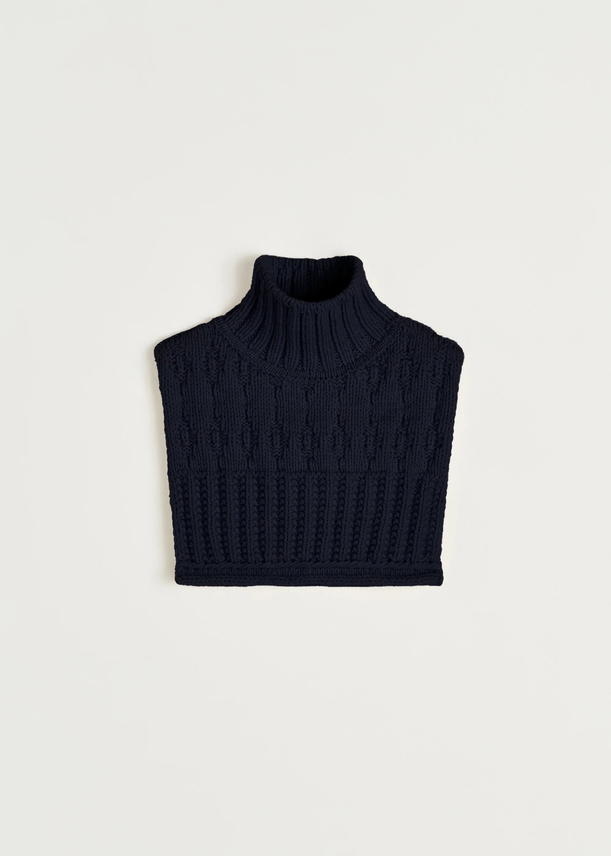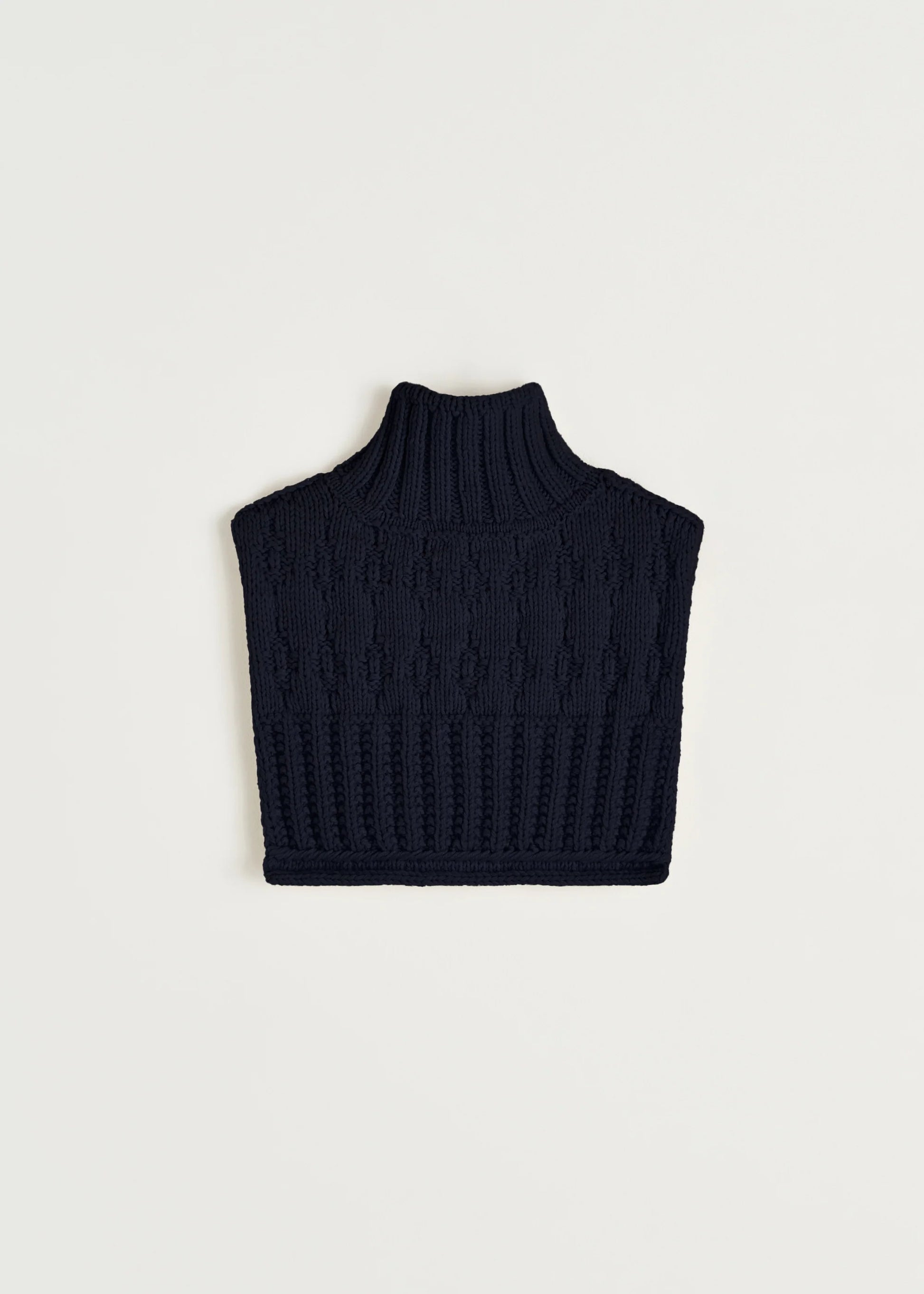 Aiayu skriver; A soft, hand-knitted neckwarmer in heavy highland wool. Designed with a square front- and back piece, high collar and delicate, hand-knitted details and patterns, adding an elegant and timeless touch