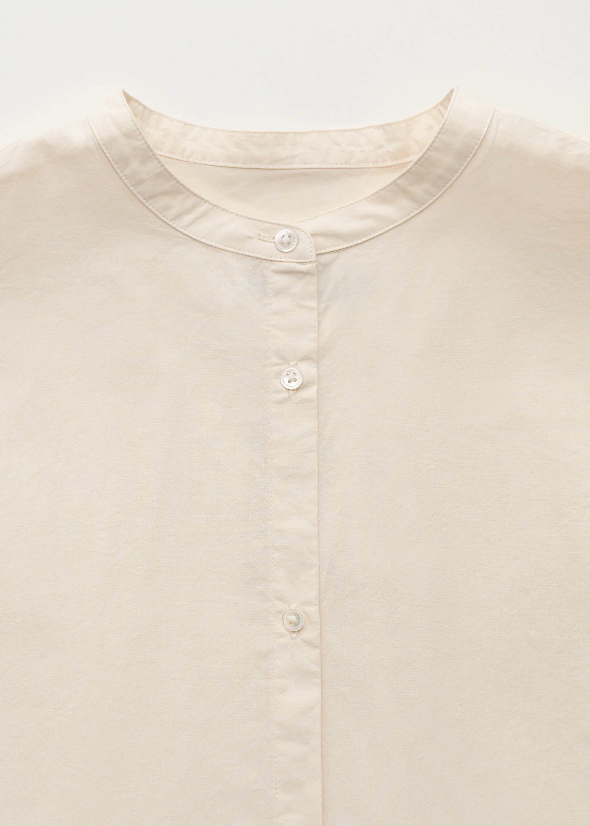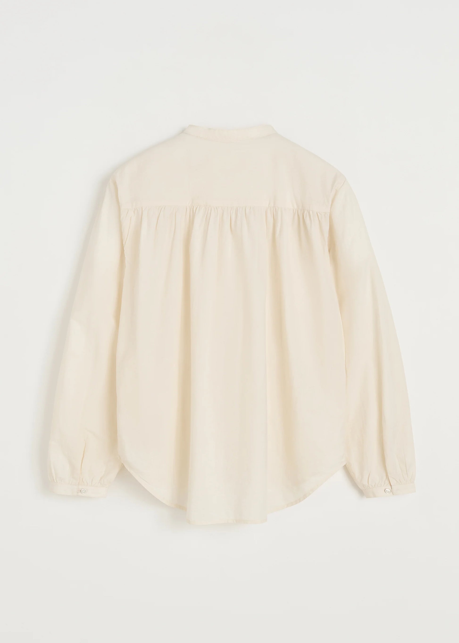 Aiayu skriver; A feminine, collarless shirt made from organic cotton poplin. Designed in a regular fit with delicate mother-of-pearl buttons, curved hemline and decorative pleat details at the yoke and sleeves, forming an elegant, voluminous silhouette.