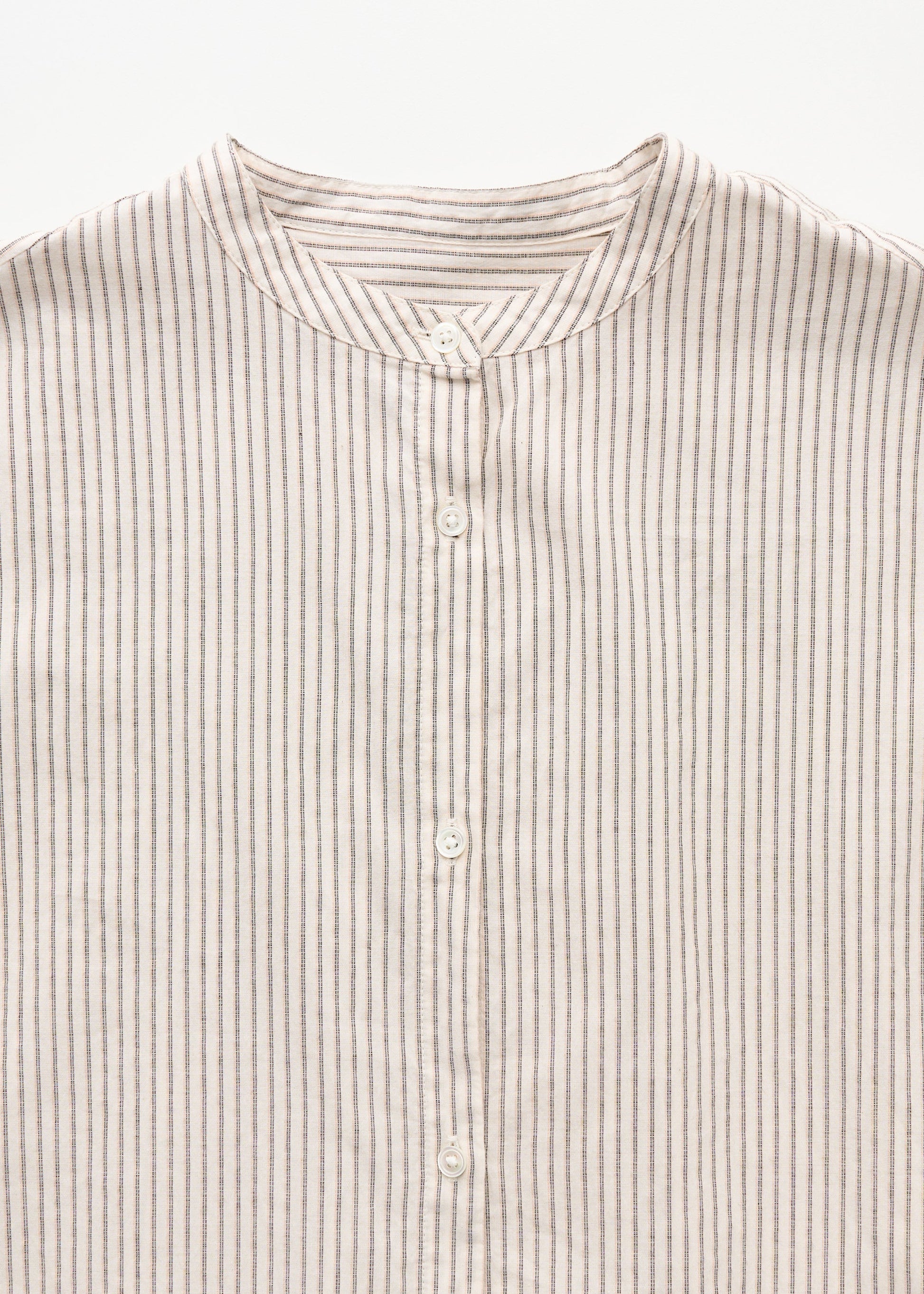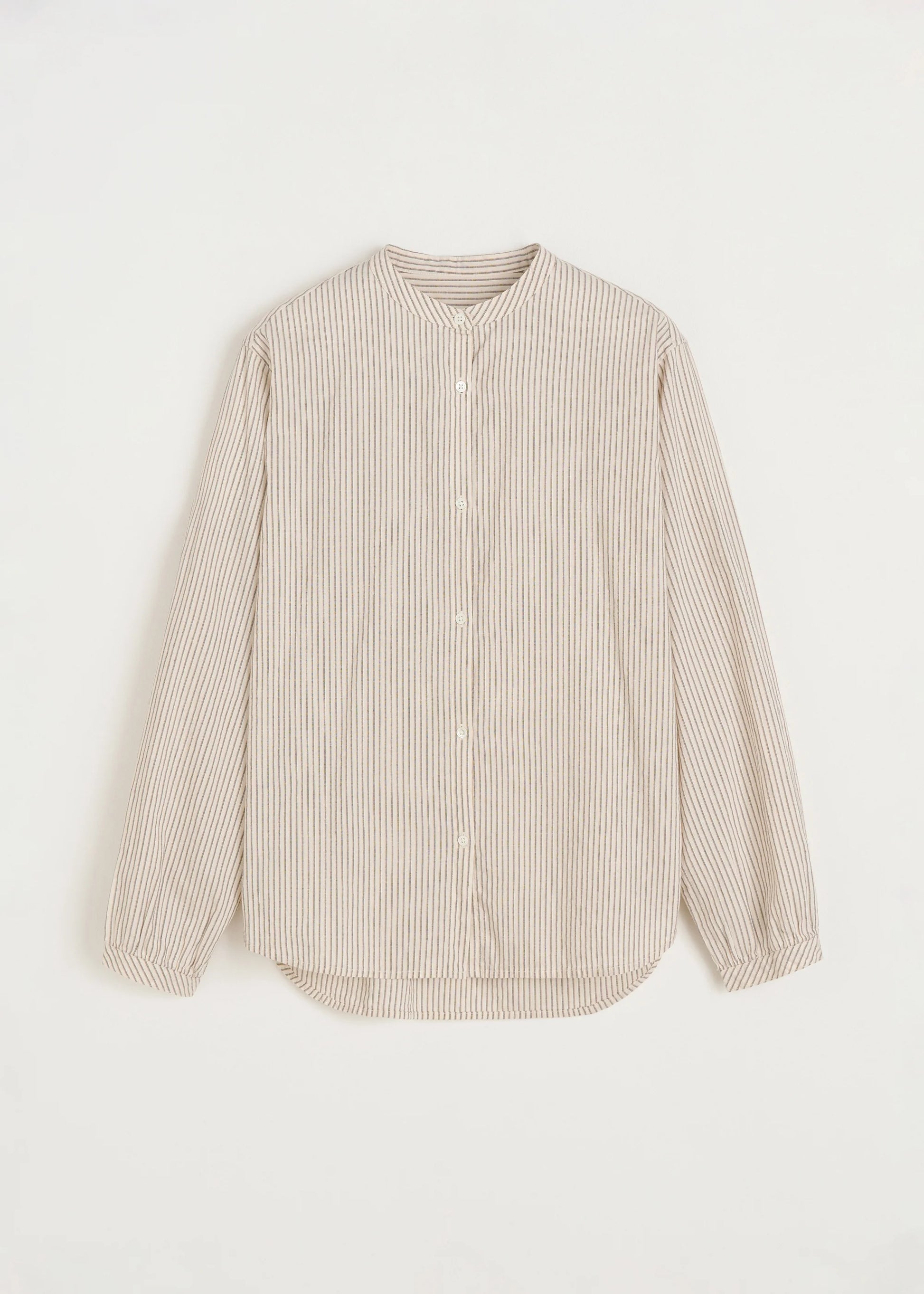 Aiayu skriver; A feminine, collarless shirt made from soft, undyed organic cotton, woven with contrast-coloured stripes. Regular fit with delicate mother-of-pearl buttons and decorative pleat details at the yoke and sleeves, forming an elegant, voluminous silhouette.
