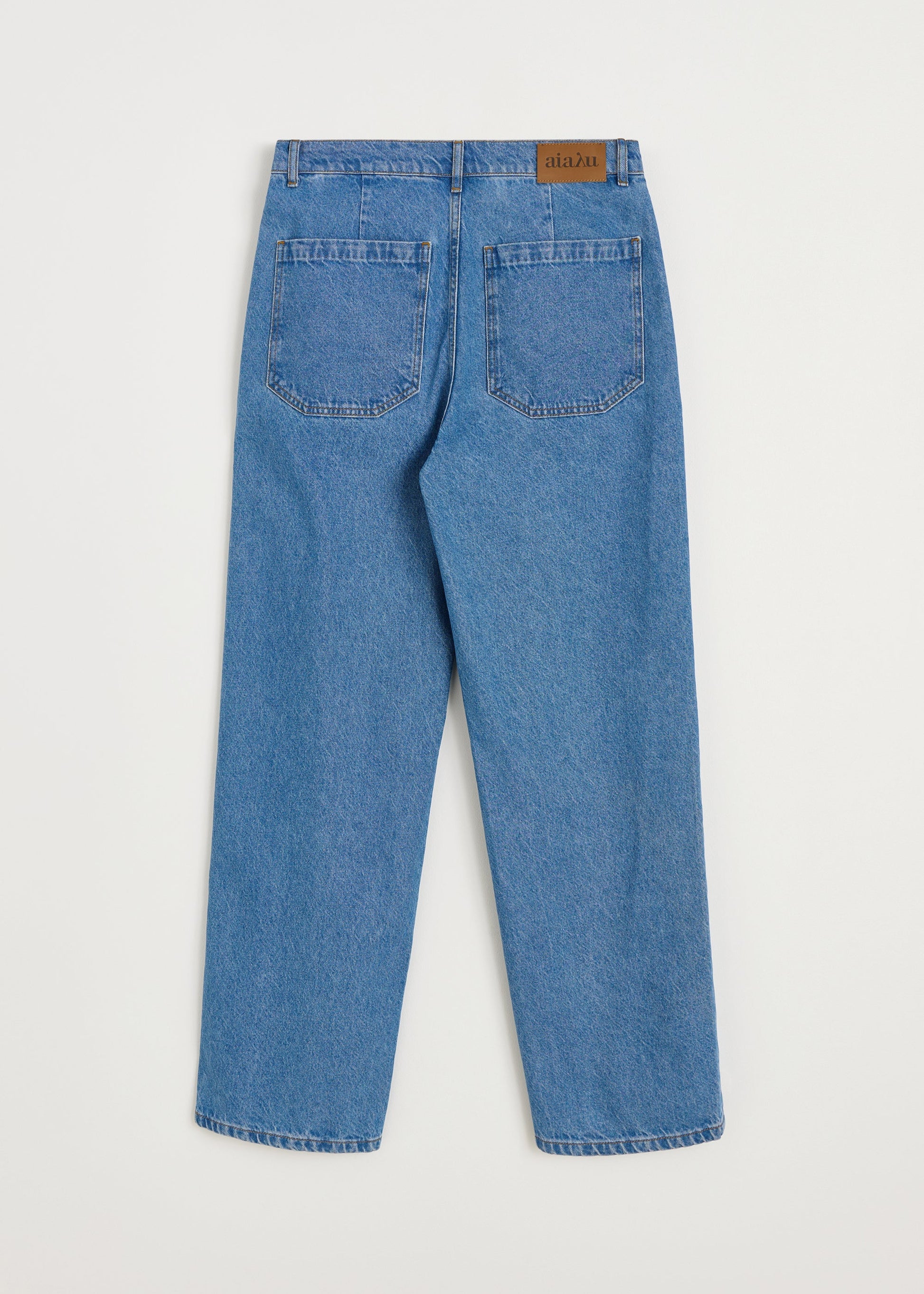 Aiayu skriver; A pair of classic, workwear-inspired jeans made from certified, organic cotton. Designed in a relaxed fit with a mid-rise waist and delicate details such as spacious slant pockets, hand-stitched seams on the back pockets, a signature strap, and an aiayu logo patch.