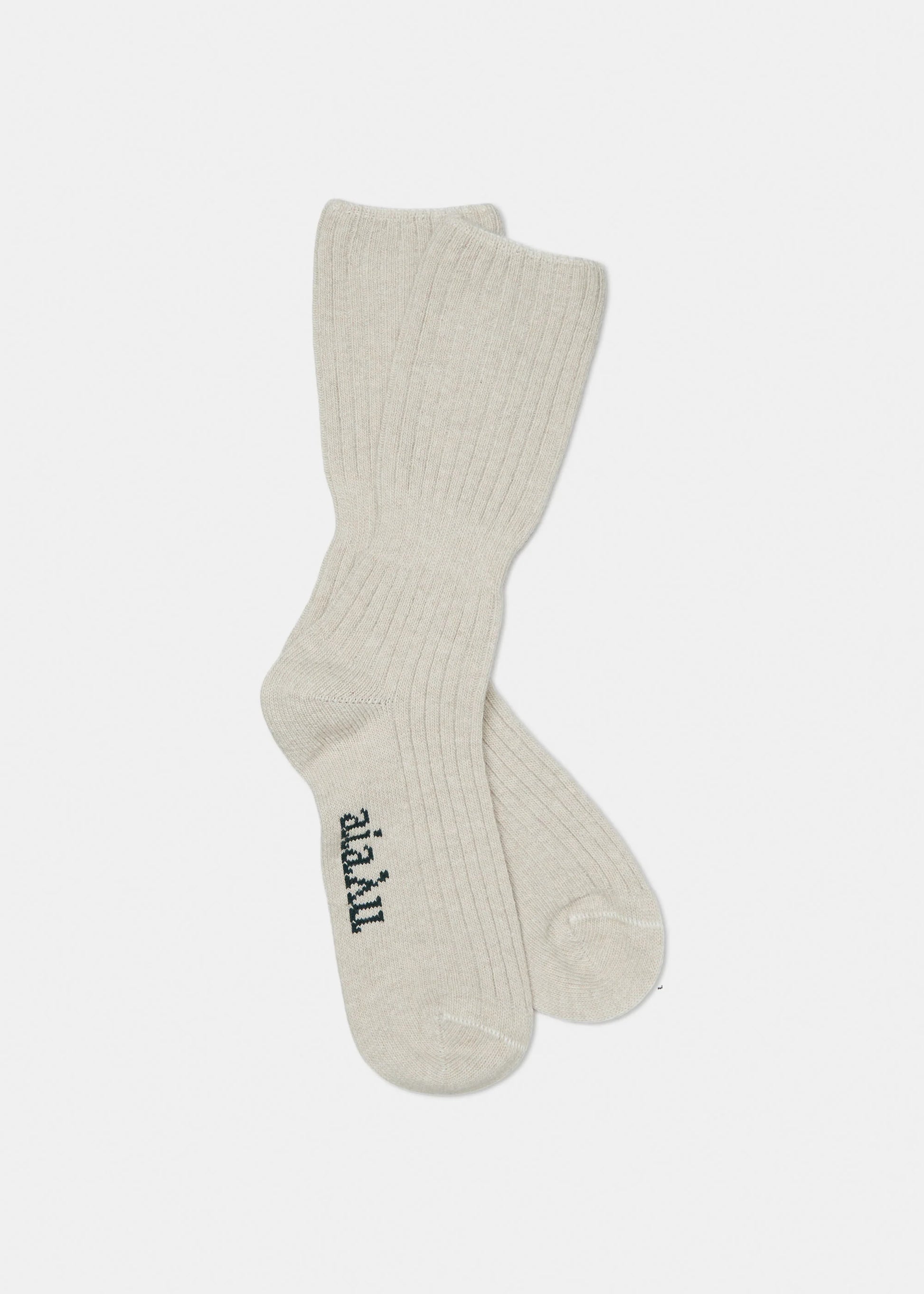 Aiayu skriver; Exclusive cashmere socks in a very special blend made from Italian post-consumer, GRS-certified cashmere. The wool comes from old sweaters collected around Italy that are shredded and made into new yarns, ensuring a high level of circularity.Thermoregulating, soft, and luxurious, our cashmere socks come with a practical rib detail for a flexible fit, and a decorative aiayu pad print underneath. Reinforced heel and toe.Produced in Portugal.