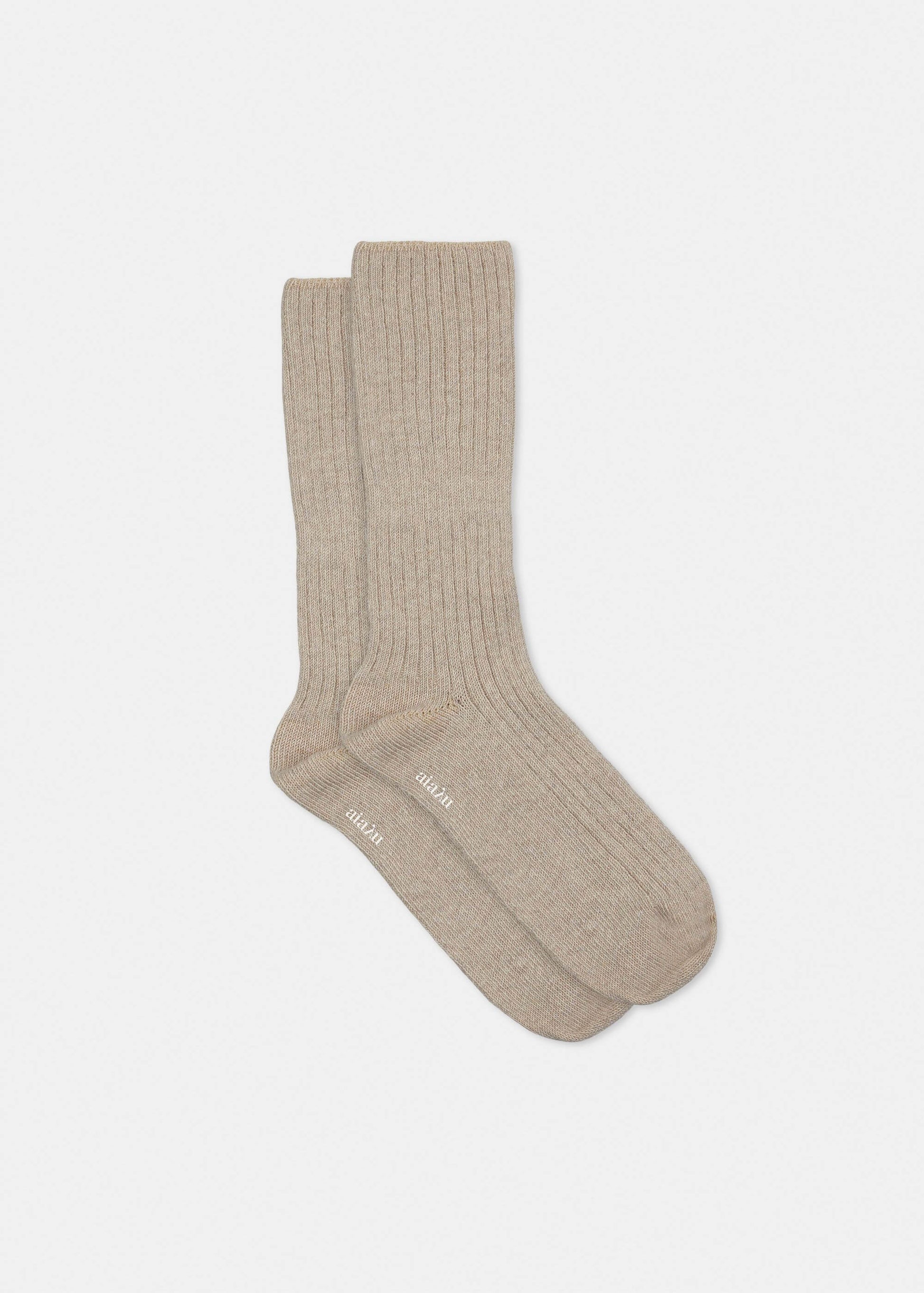 Aiayu skriver; Exclusive cashmere socks in a very special blend made from Italian post-consumer, GRS-certified cashmere. The wool comes from old sweaters collected around Italy that are shredded and made into new yarns, ensuring a high level of circularity.