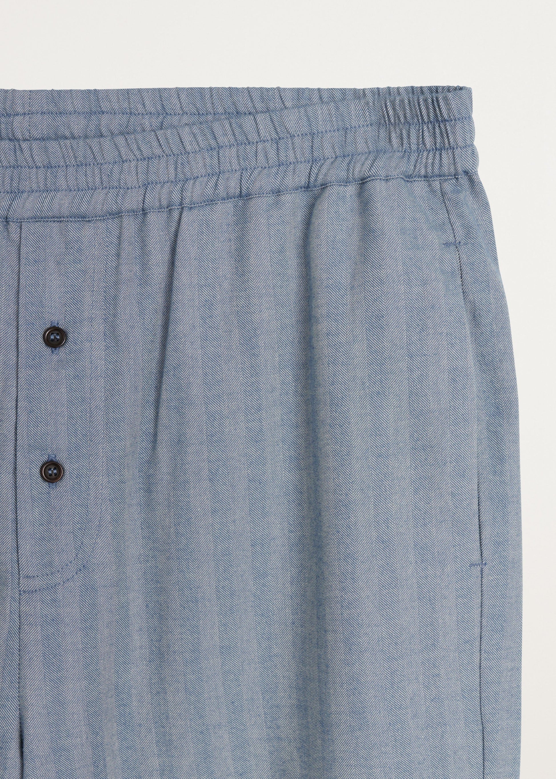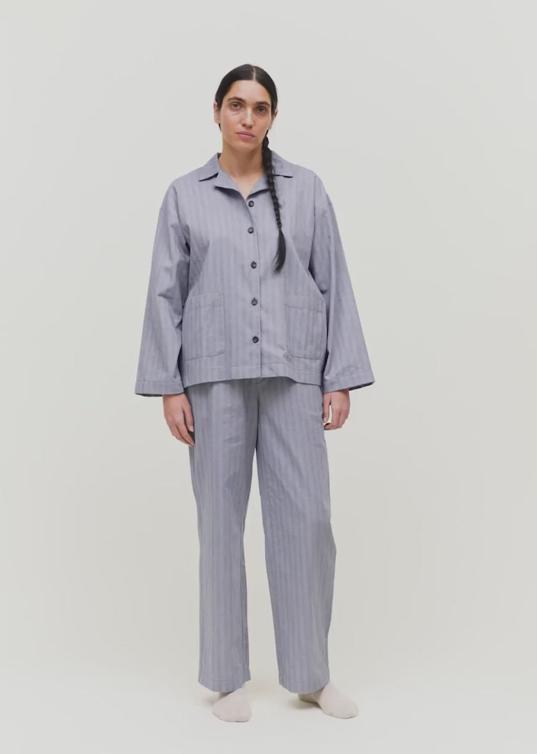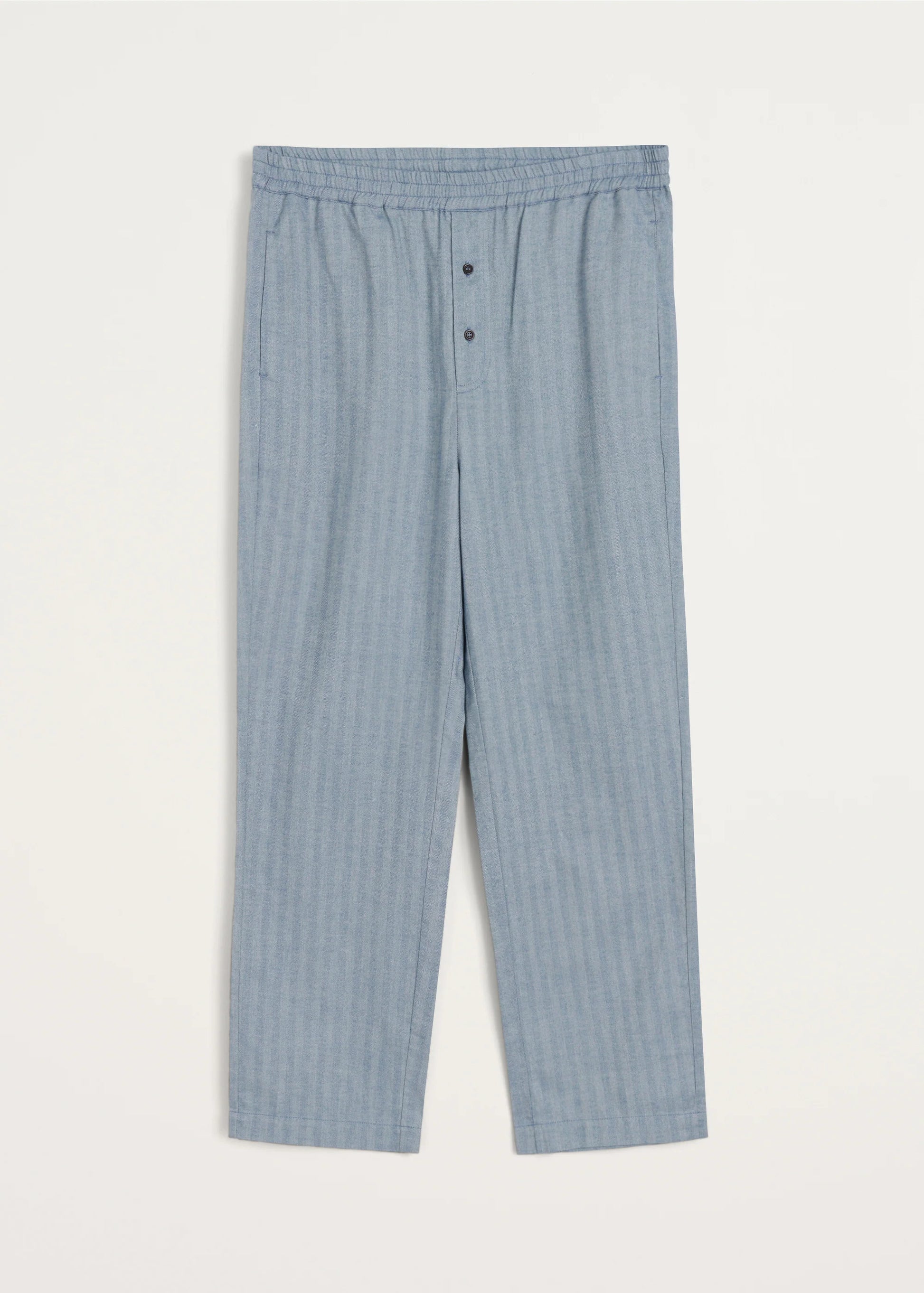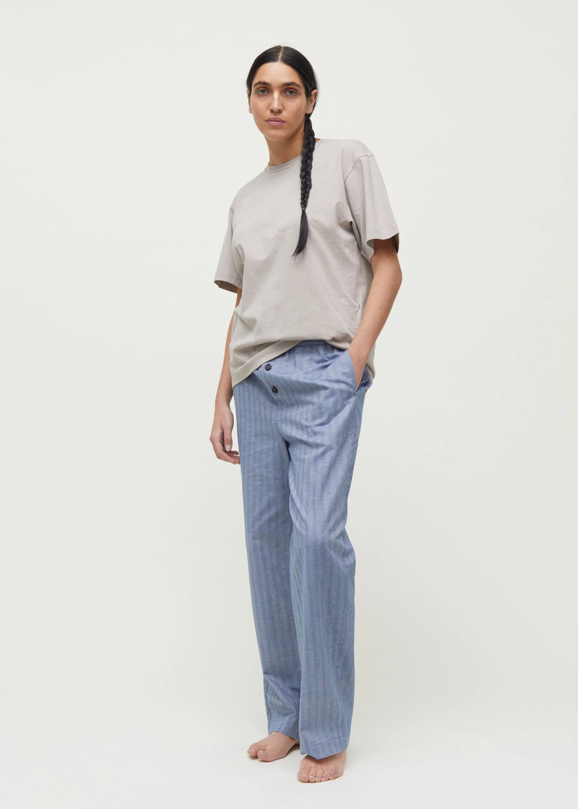 Aiayu skriver; A relaxed pyjama pant designed in a menswear inspired look with a button front fly and a classic straight, full-length legs. The look is balanced with detailed, ladder stitch side seams. The pants feature side pockets and an elastic waist.