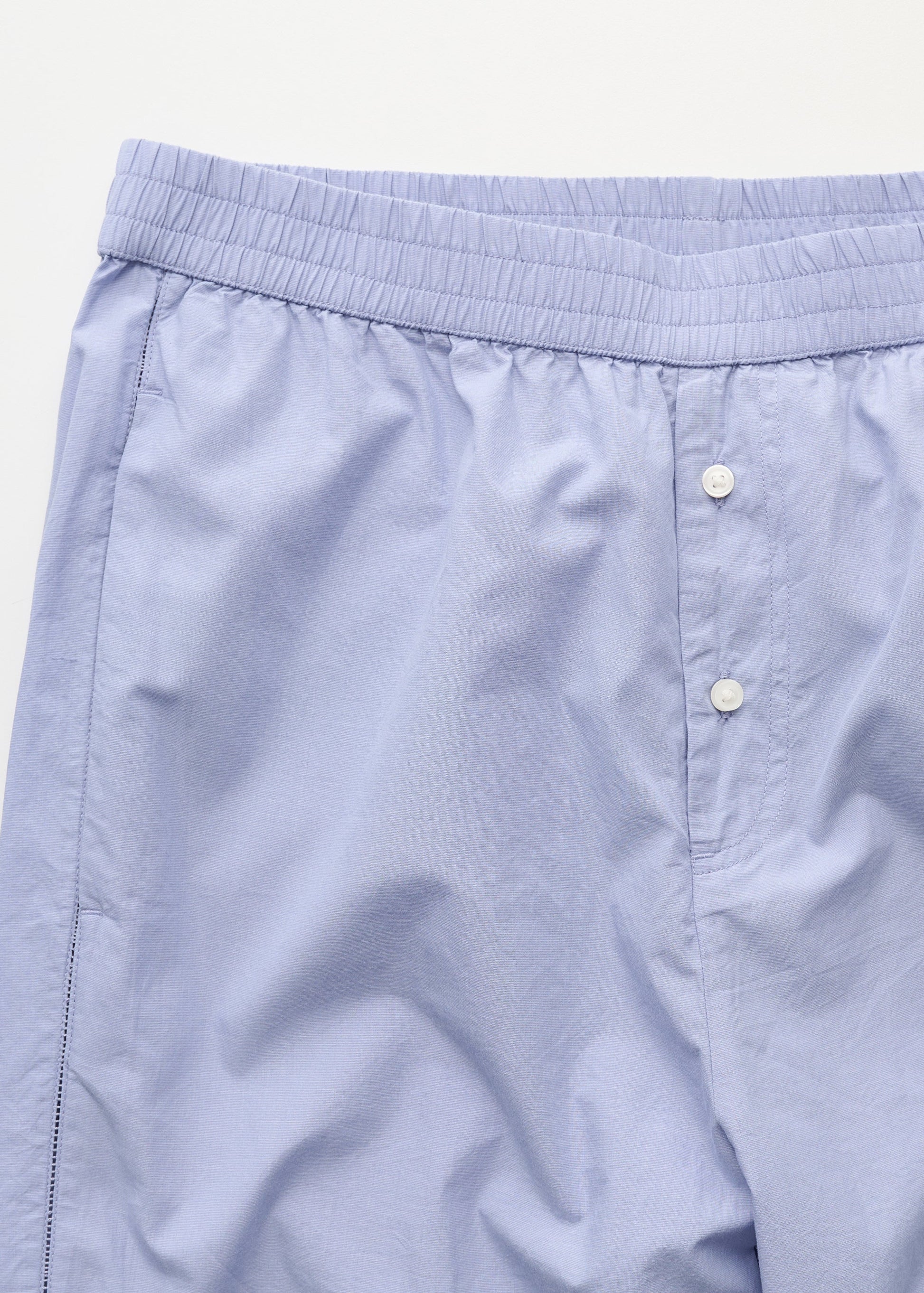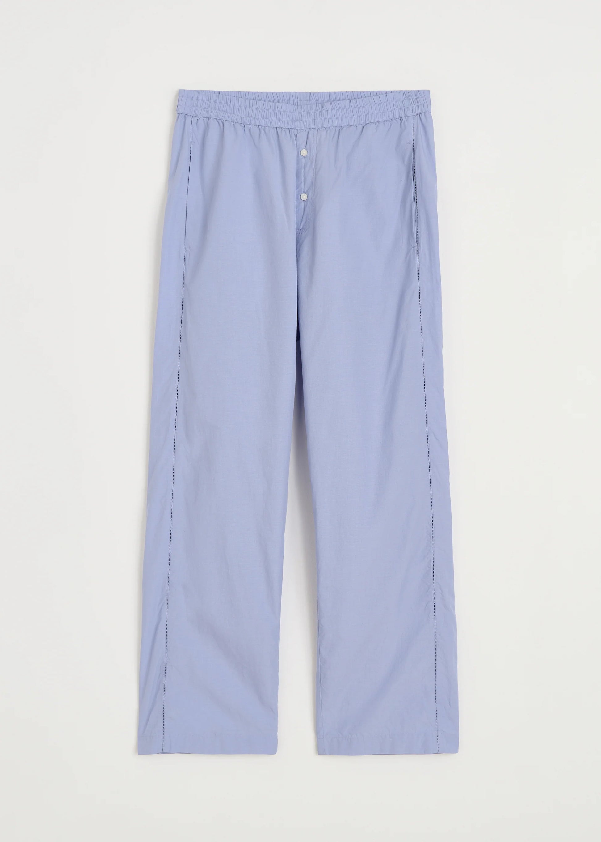 Aiayu skriver; A relaxed pair of pyjama pants made from soft, organic cotton poplin. Designed in a menswear-inspired silhouette with a visible button closure and straight-leg fit. Finished with embroidered side seams, practical side pockets, and an elasticated waistband for optimal comfort.