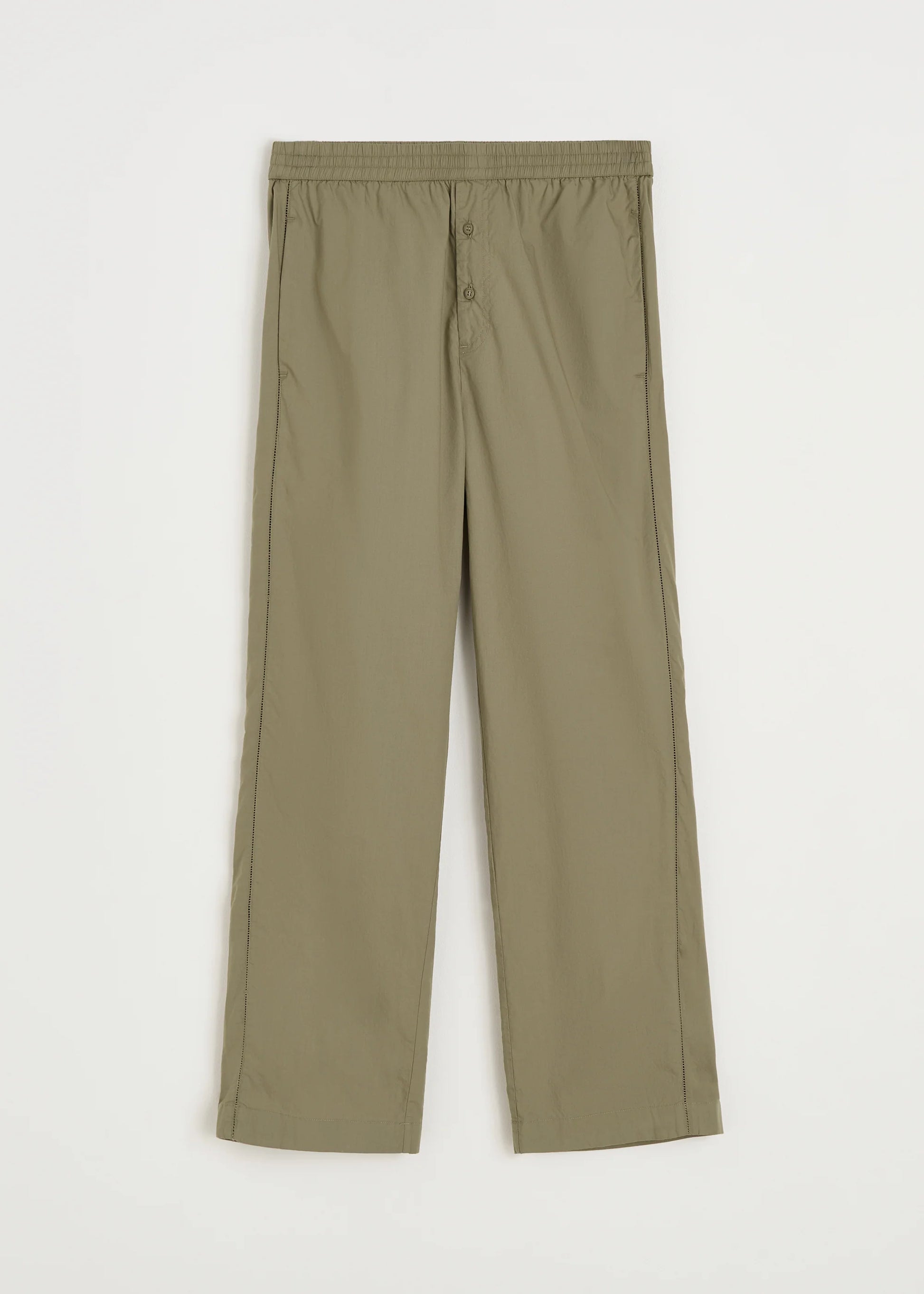 Aiayu skriver; A relaxed pair of pyjama pants made from soft, organic cotton poplin. Designed in a menswear-inspired silhouette with a visible button closure and straight-leg fit. Finished with embroidered side seams, practical side pockets, and an elasticated waistband for optimal comfort.
