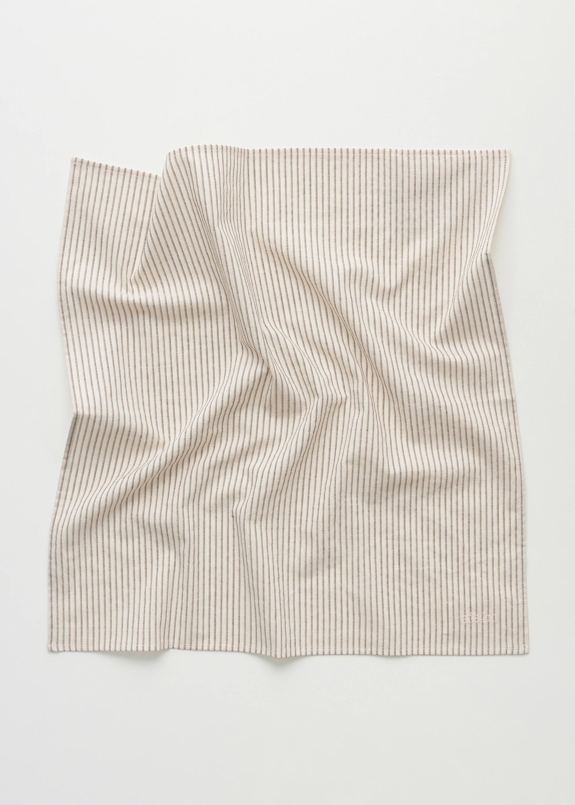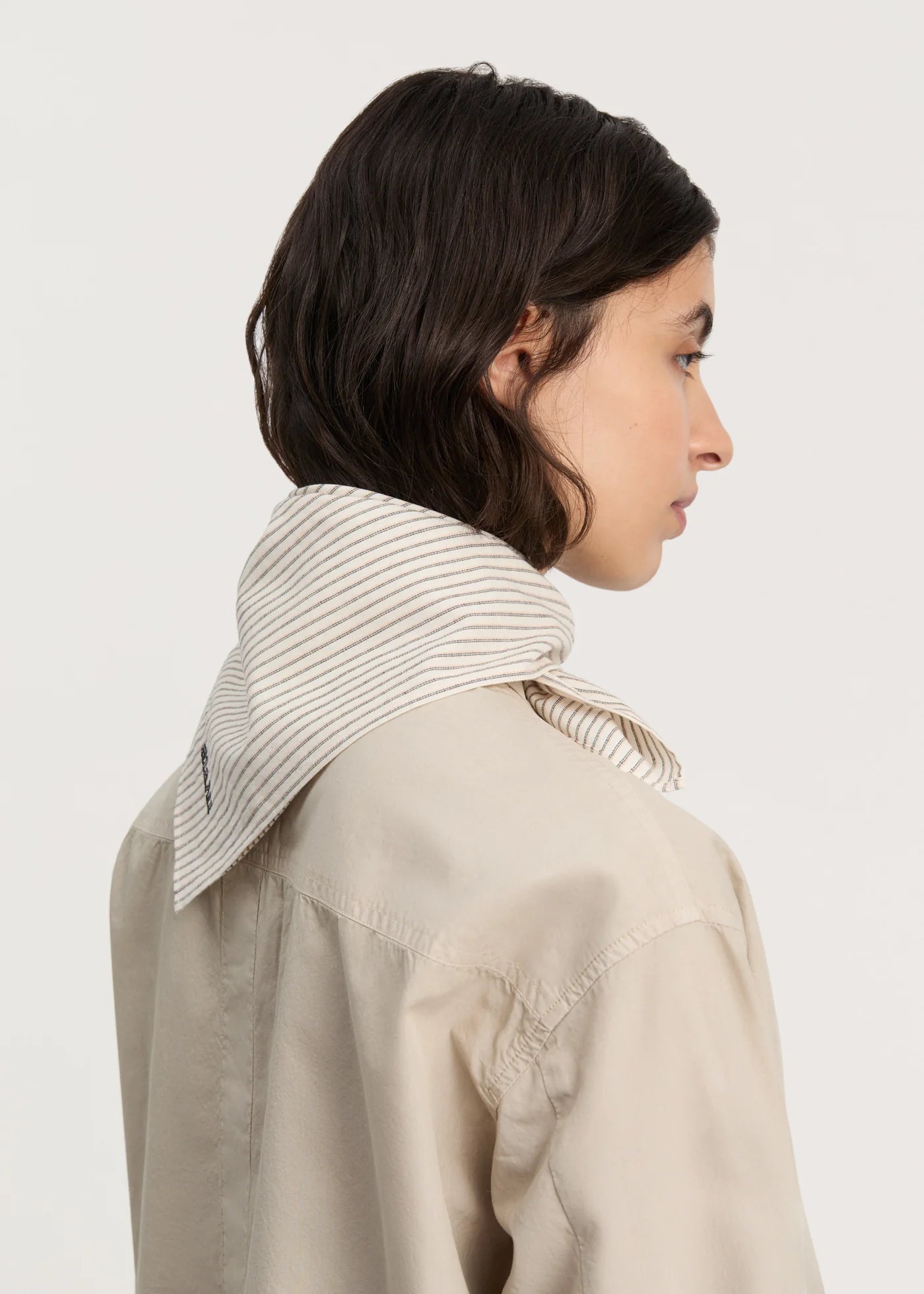 Aiayu skriver; A mini scarf made from soft, undyed organic cotton and woven with contrast-coloured stripes. Designed in a square shape and intended to wrap once around the neck.