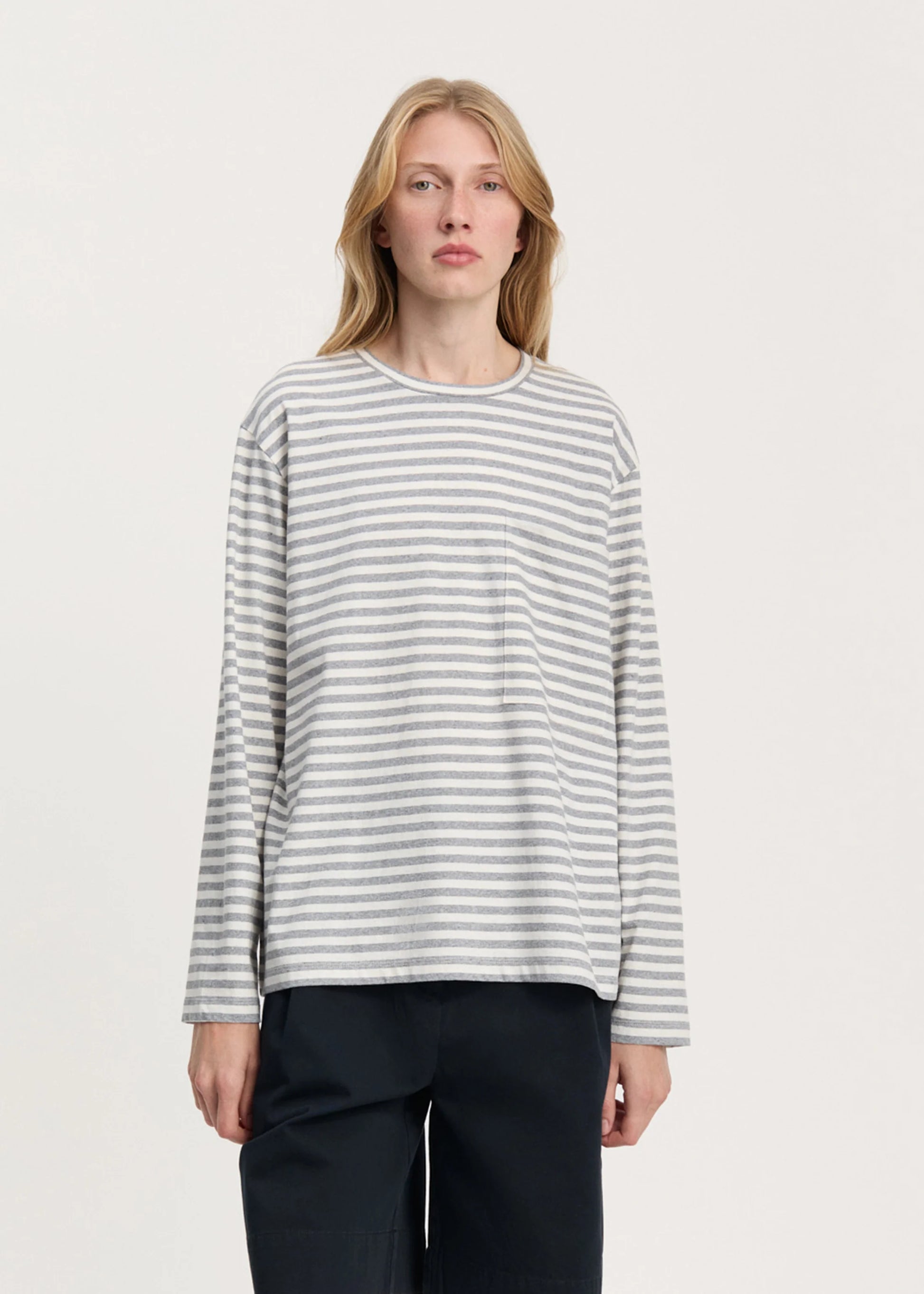 Aiayu skriver; A classic long-sleeve t-shirt made from a blend of soft, recycled and organic cotton jersey. Designed with a relaxed, regular silhouette, featuring a round neckline, dropped shoulders and a chest pocket. The t-shirt is unique with contrasting signature stitching on the side.