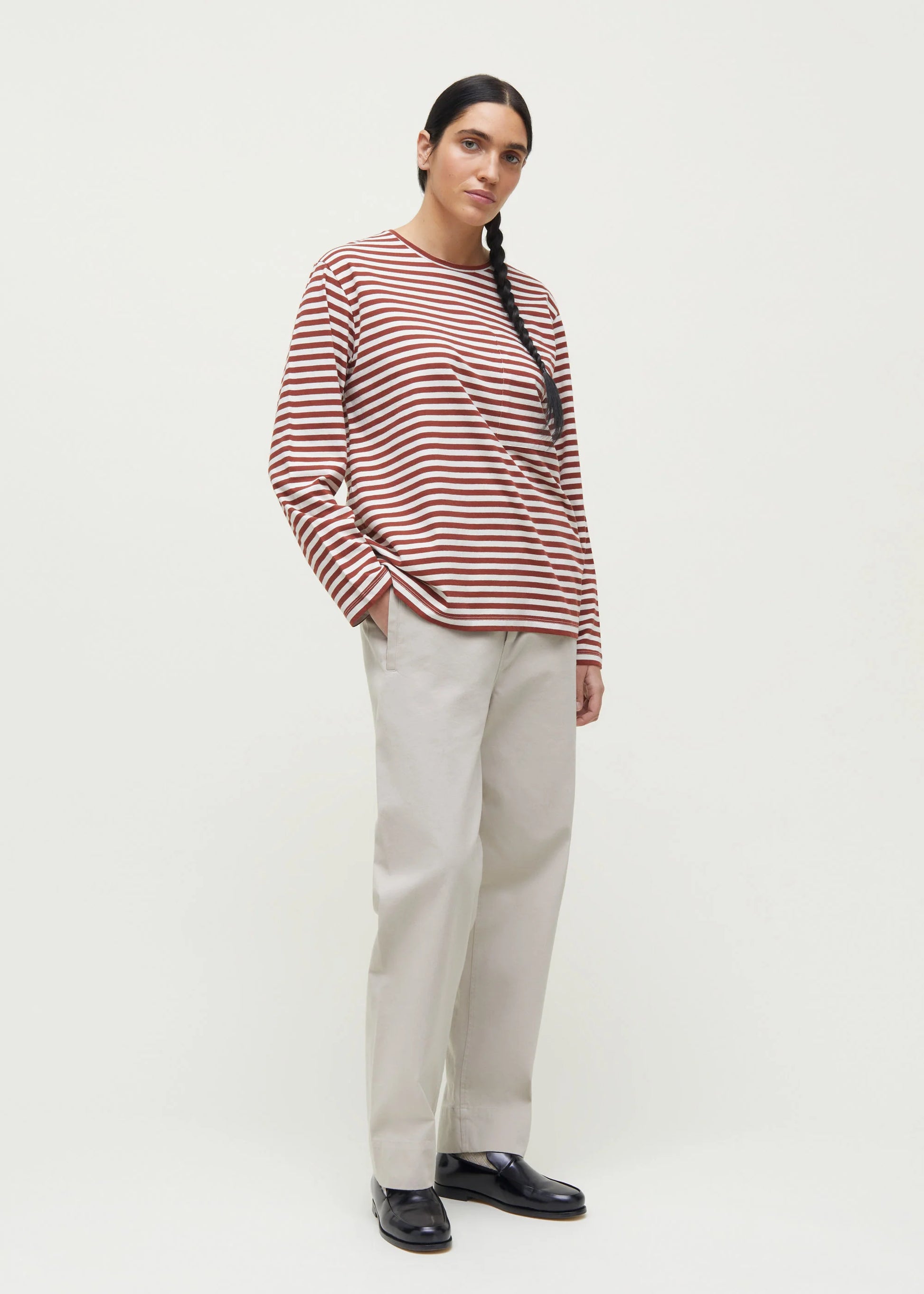 Aiayu skriver; A basic long sleeve tee with classic details such as a flattering front pocket, dropped shoulders, and a loose, comfy silhouette.