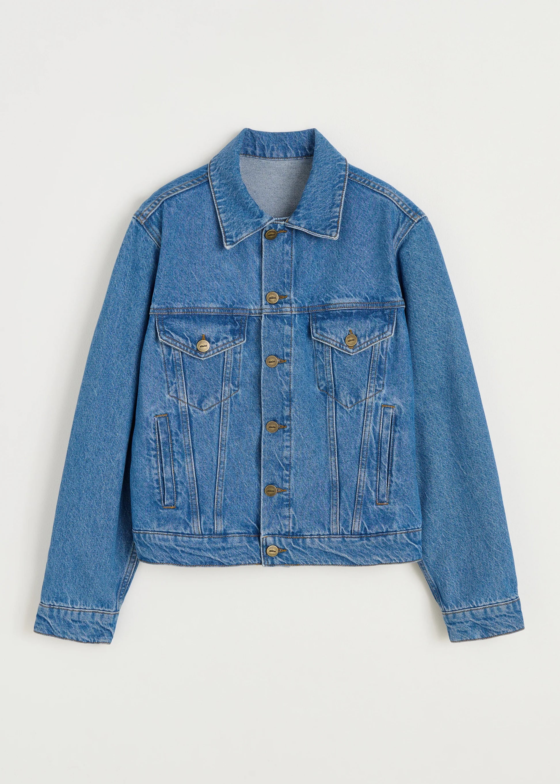 Aiayu skriver; A classic denim jacket made from organic cotton. Designed in a regular fit with distinctive details such as a collar, chest pockets, long sleeves with buttoned cuffs, aiayu logo buttons, and a decorative logo patch at the back.