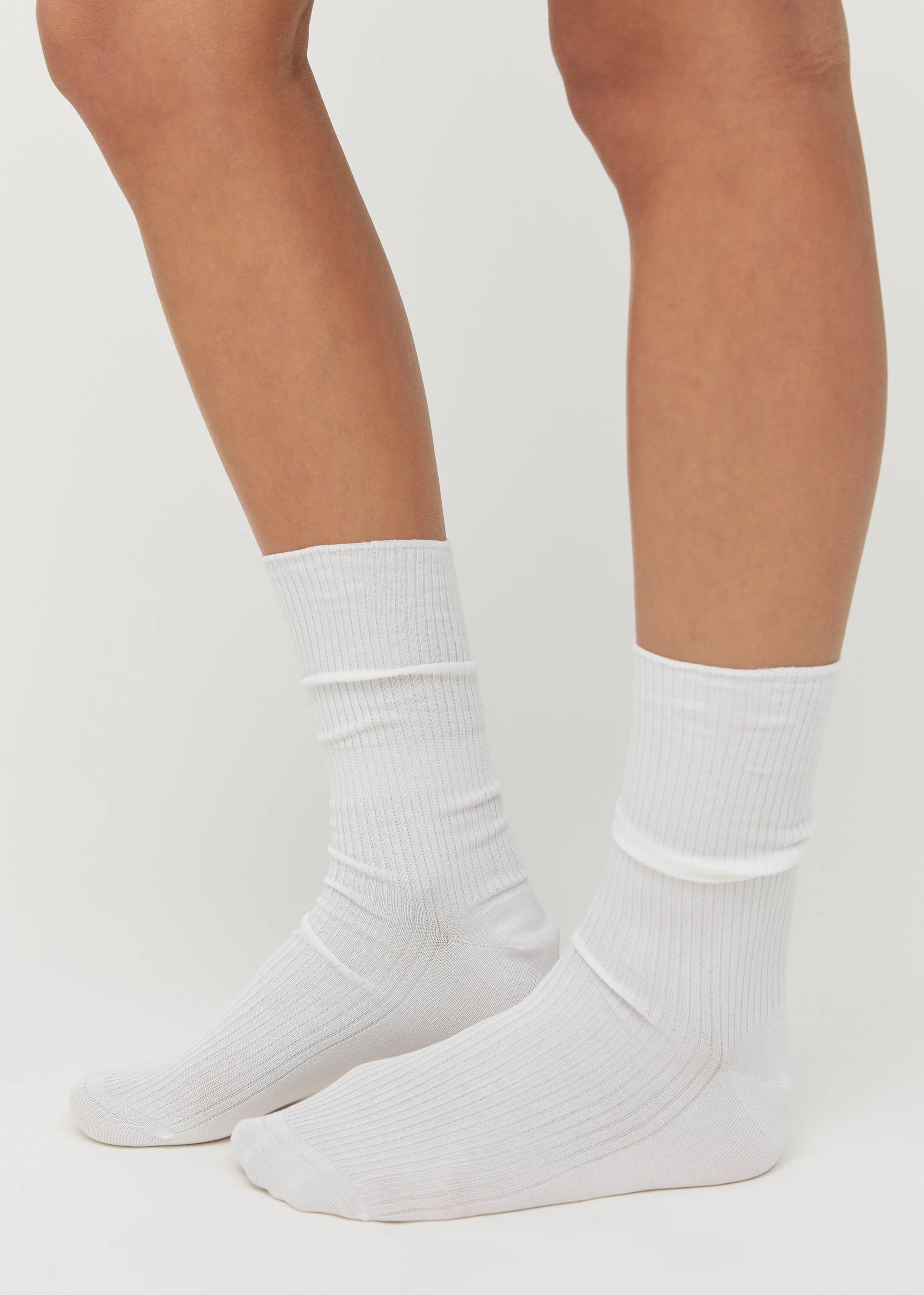 Aiayu skriver; Exclusive socks in a flexible rib knit made from GOTS-certified organic cotton and recycled polyamide for durability. Soft and luxurious with a refined fit that is underlined by the thoughtful tigthening detail around the ankle, ensuring a snug fit. Decorative aiayu pad print underneath. Reinforced heel and toe.
