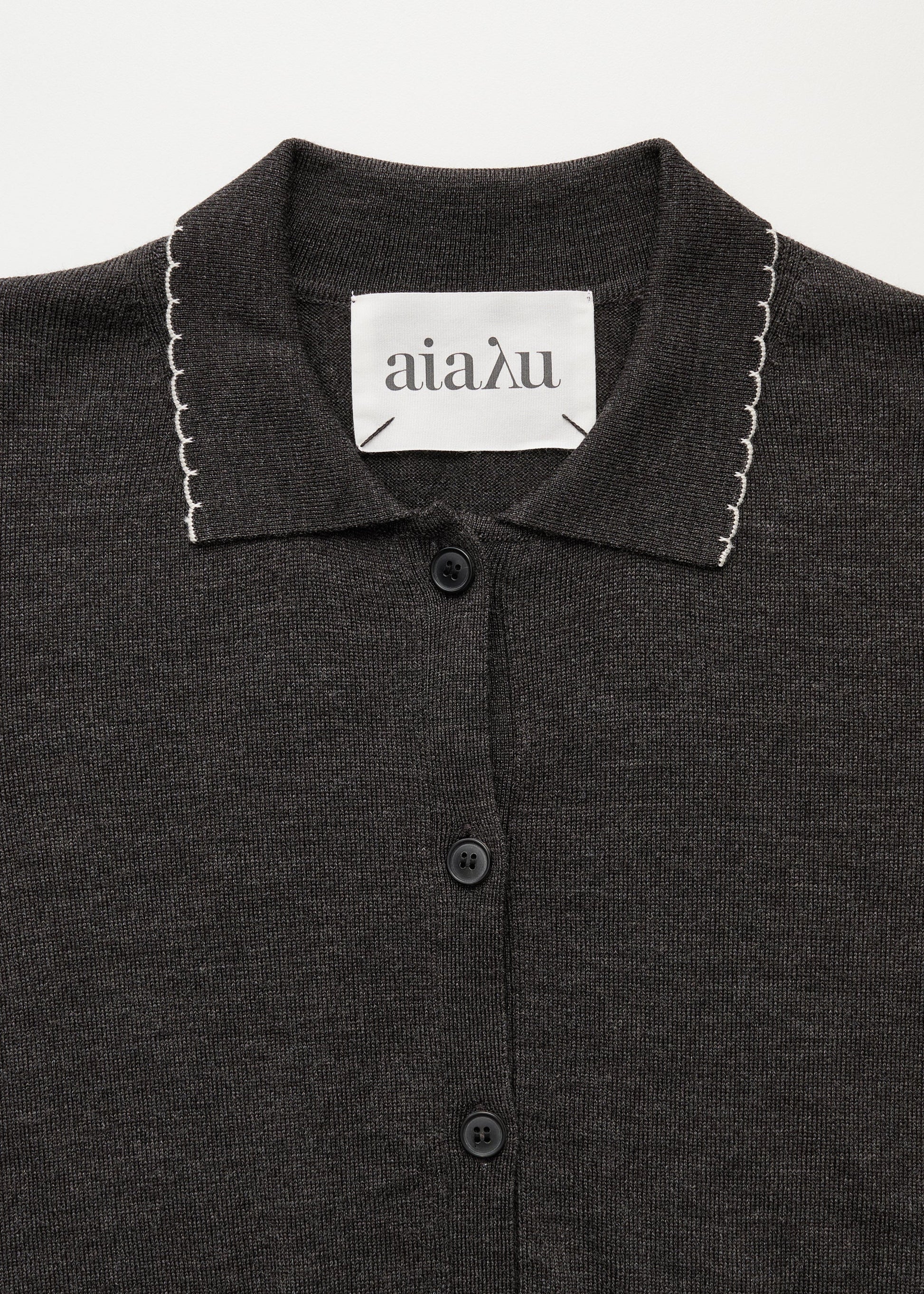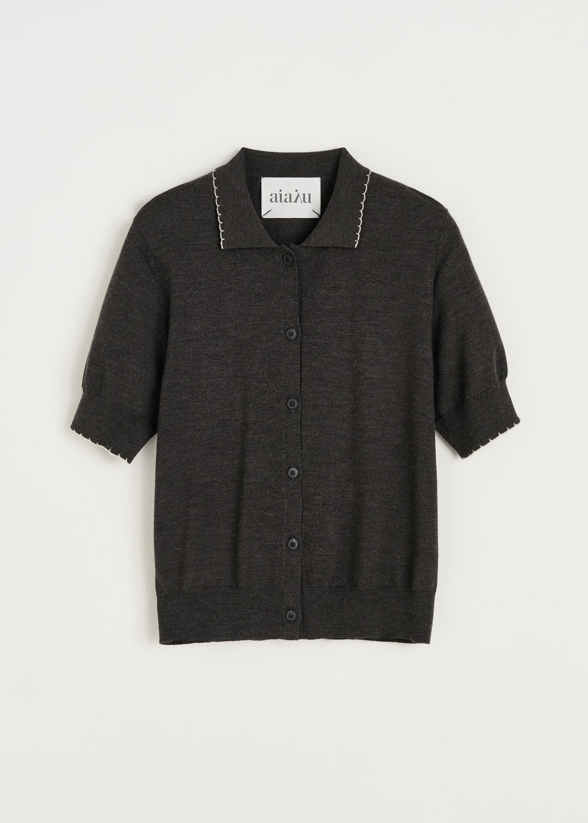Aiayu skriver; An elegant, short-sleeved cardigan made from fine, soft, smooth-knitted merino wool. Designed in a slim fit with a dainty, detailed collar, button closure, and contrast-coloured scalloped edges.