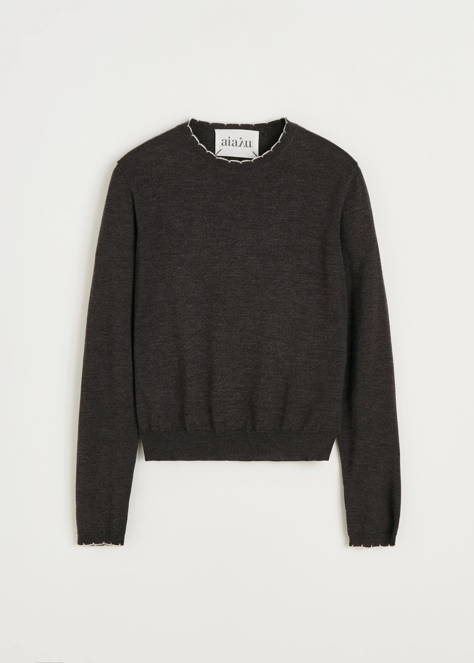 Aiayu skriver; An elegant sweater made from fine, soft, smooth-knit merino wool. Designed in a regular fit with a delicate, detailed round neckline and contrast-coloured scalloped edges.