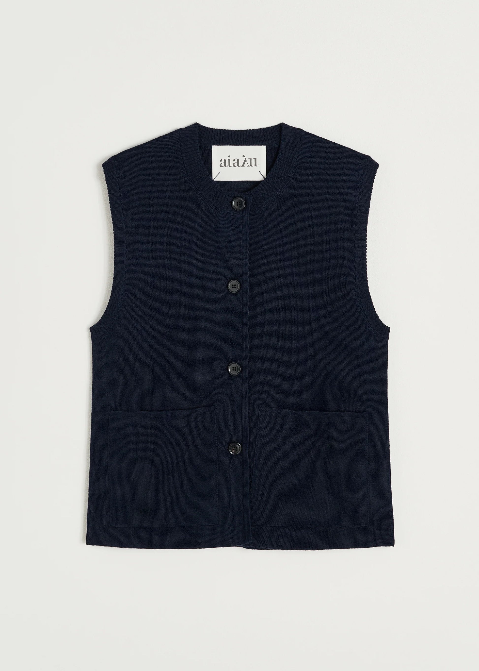 Aiayu skriver; A refined vest made from mulesing free merino wool, knitted after the Milano technique - a detalied process creating a dense, unique material. Designed in a boxy fit with knitted tubular trims at the button closure and the sleeve opening.