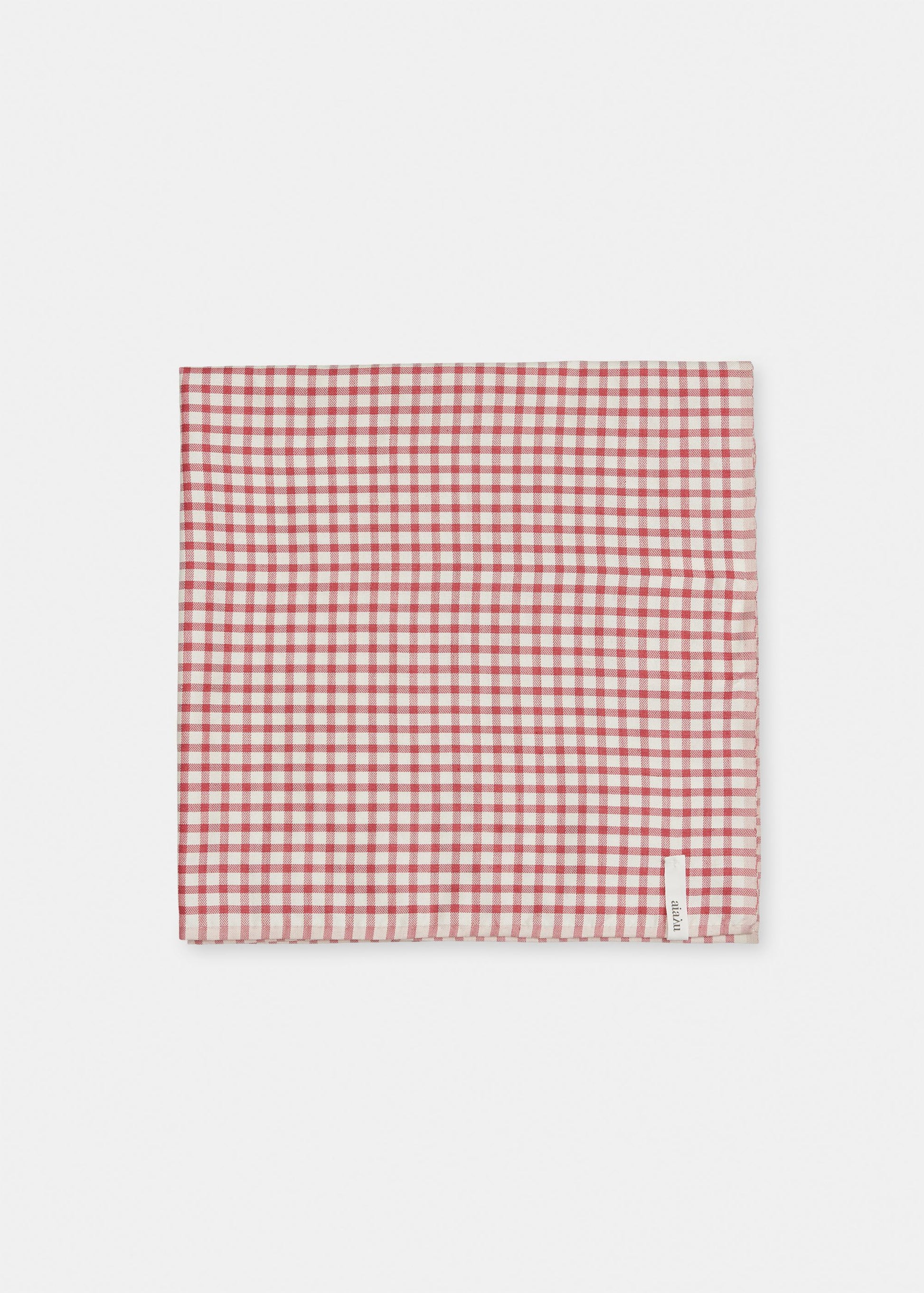 Aiayu skriver; Familia is a delicate, hand-loomed scarf made of 100% silk. It features small check artwork, two raw edges, and two edges folded and hand-stitched in place. The scarf is 65 x 65 centimetres and can be worn single or double-folded around the neck.