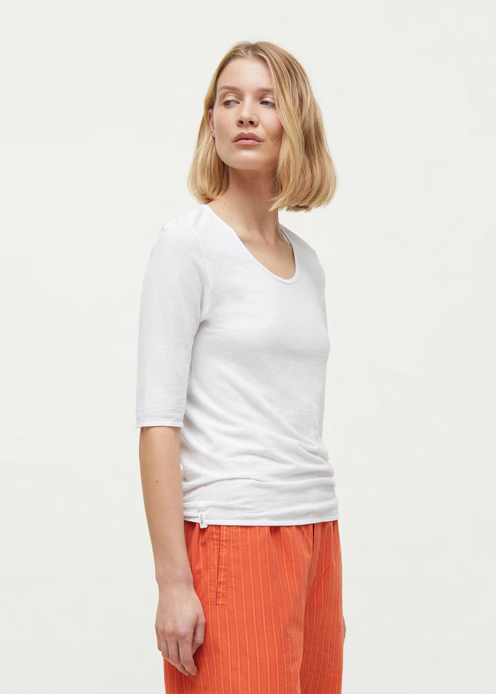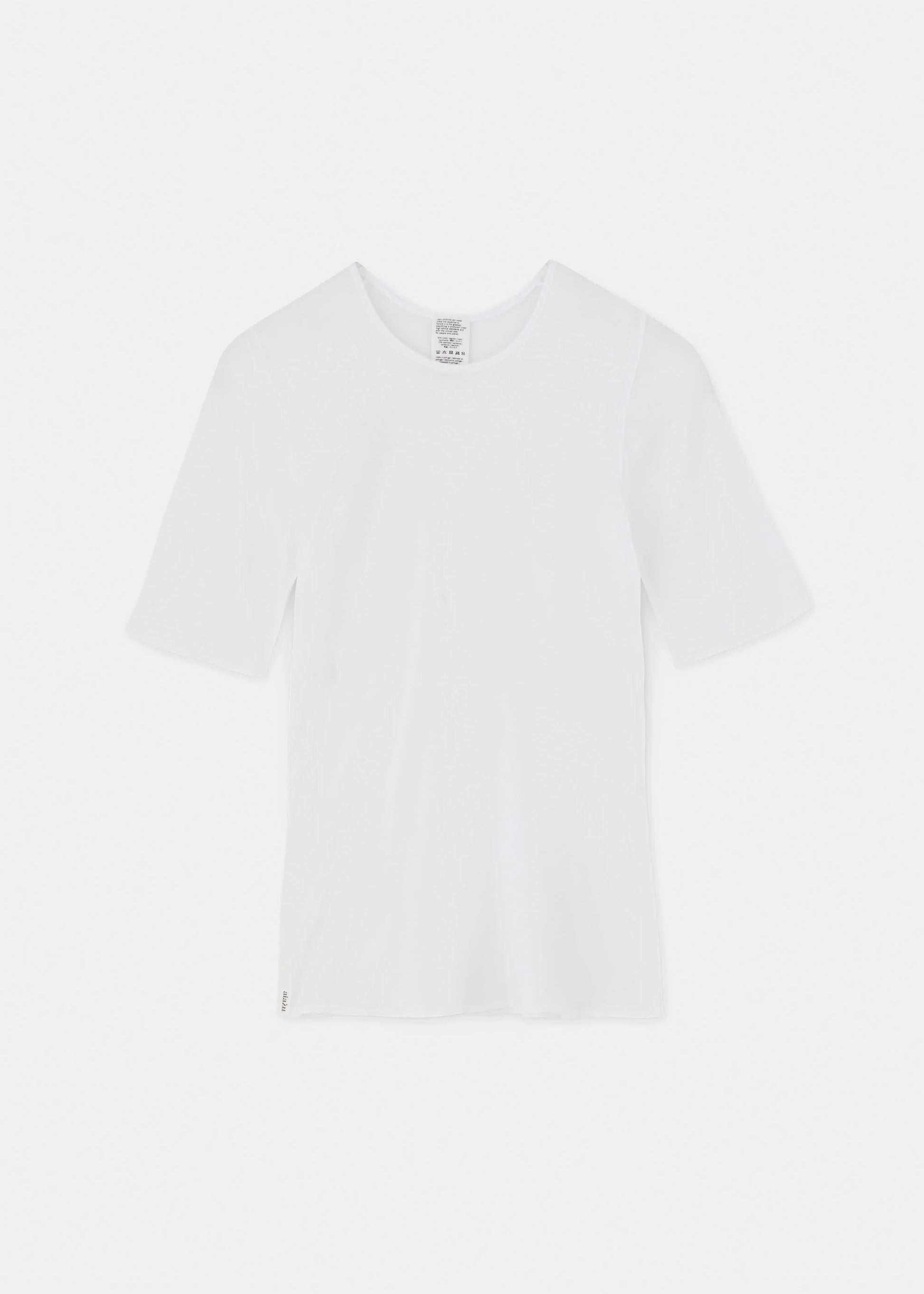 Aiayu skriver; Gentle Tee is the perfect item for layering due to its light, semi-sheer, and super soft qualities. Our Gentle styles are made of a premium blend of 10% cashmere and 90 % organic cotton, and designed without side seams. The Gentle Tee has rib knit details in the back, an open round neckline, and sleeves that stop just above the elbow..