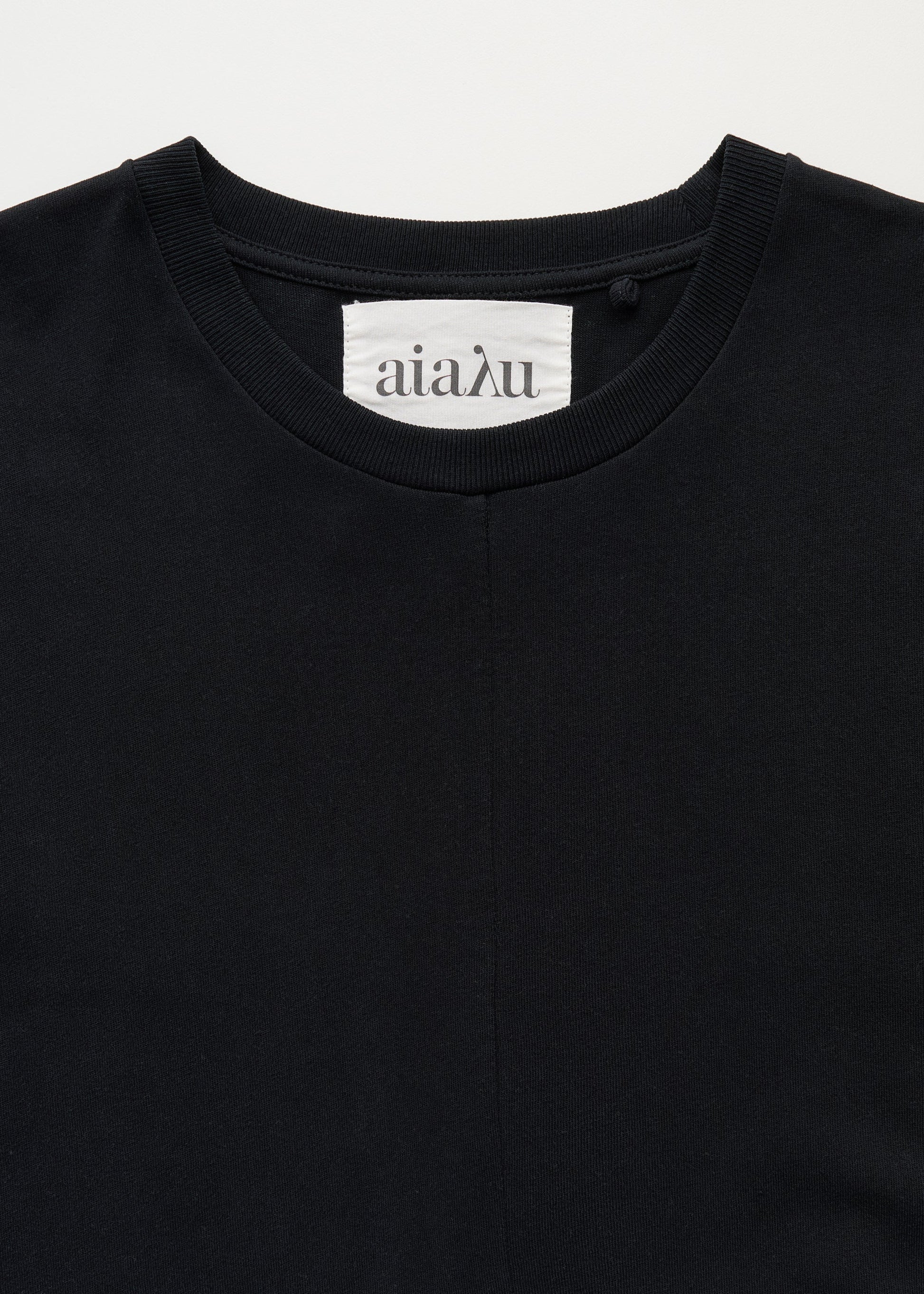 Aiayu skriver; A t-shirt dress in a heavy blend of as soft recycled and organic cotton jersey. Designed in a relaxed fit with a subtle A-line silhouette at ankle length. Detailed with an embroidered aiayu logo, high side slits, and structured seams creating a sculptural drape.