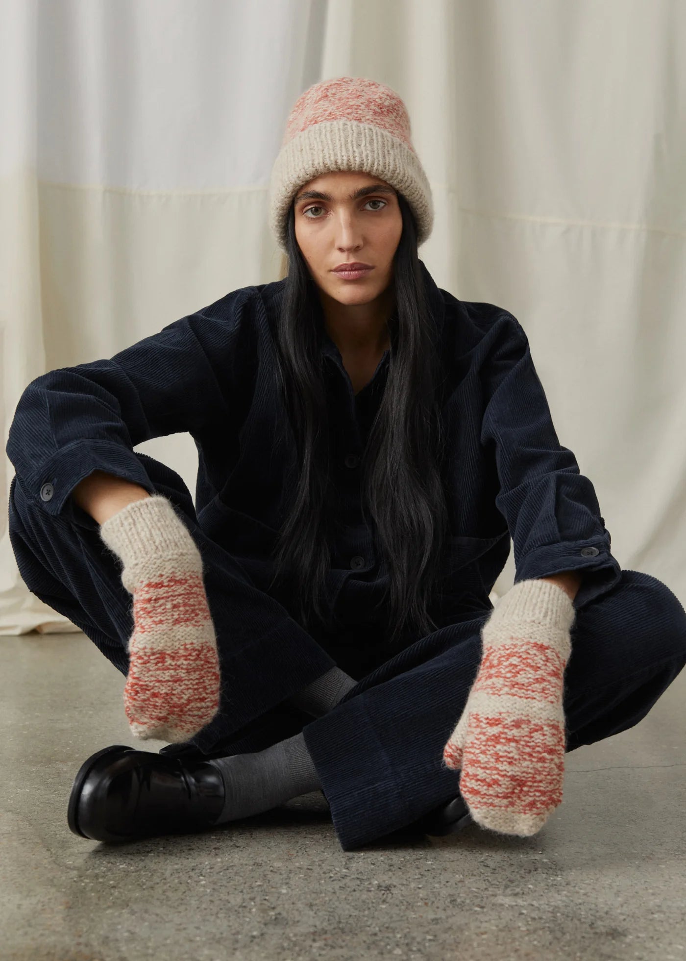 Aiayu skriver; Classic, soft hand-knitted mittens in a fluffy quality of premium mélange llama wool. The ribbed edges are flexible with a tighten effect around the wrist for a snug fit.