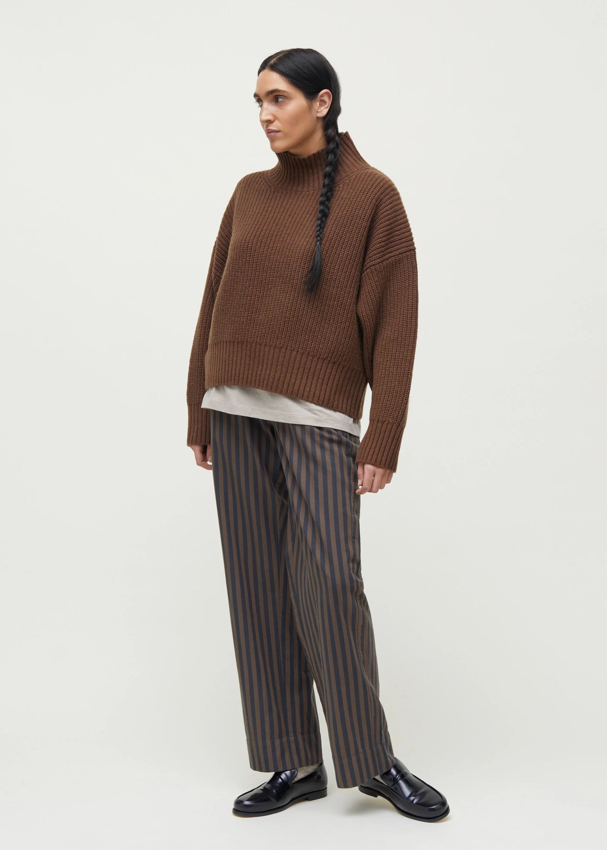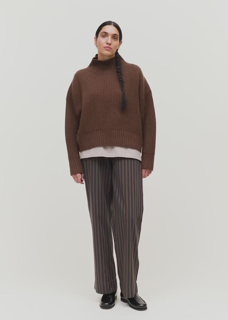 Aiayu skriver; HERA is a classic rib sweater with a standing collar and boxy, cropped silhouette. Made from 100% Sartuul wool that comes from the downy coat of a rare nomadic Mongolian sheep, making it both extremely durable and breathable at the same time. It will readily soften after a few days of wear, so after buying it we recommend giving it a few wears to help this process.