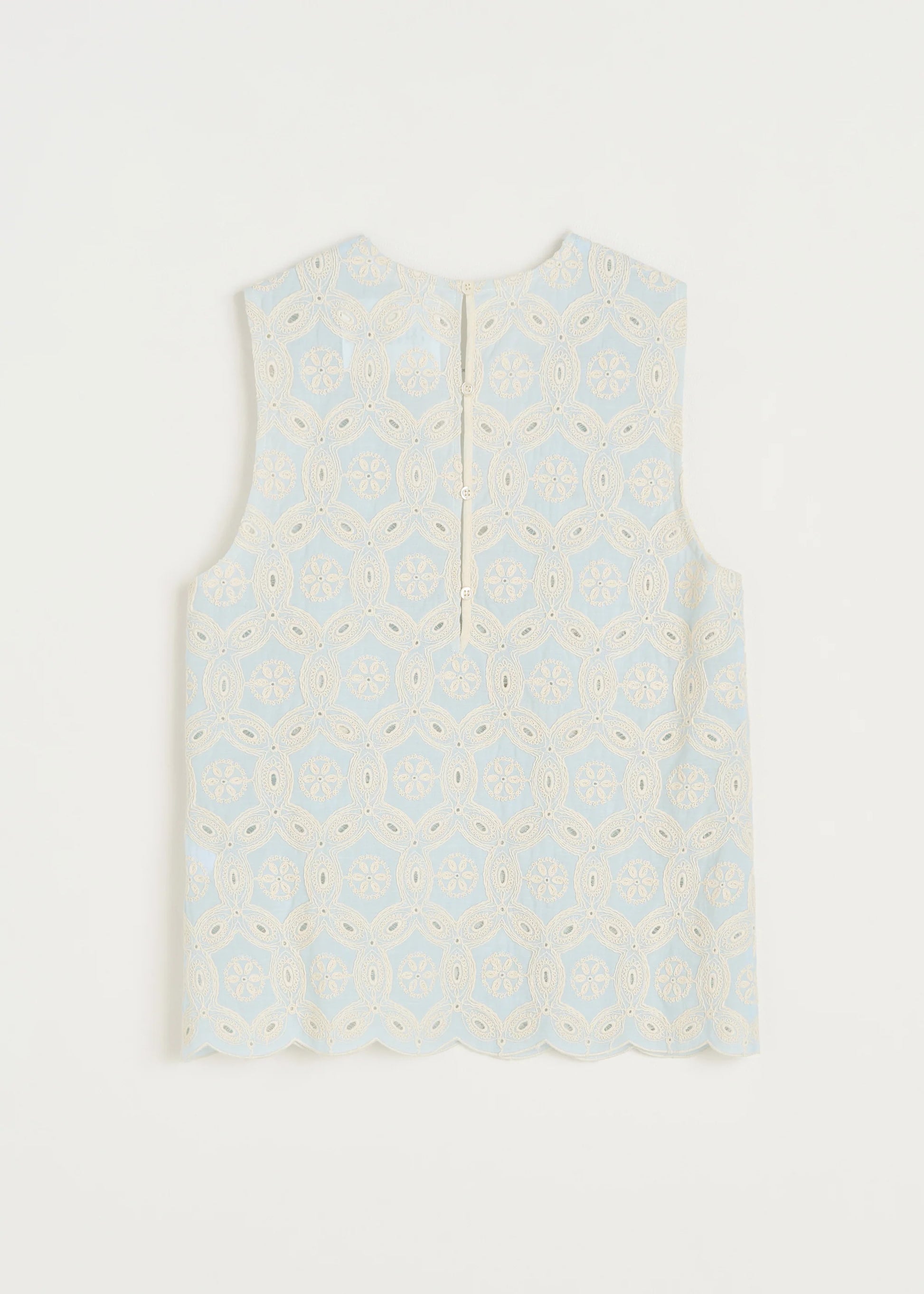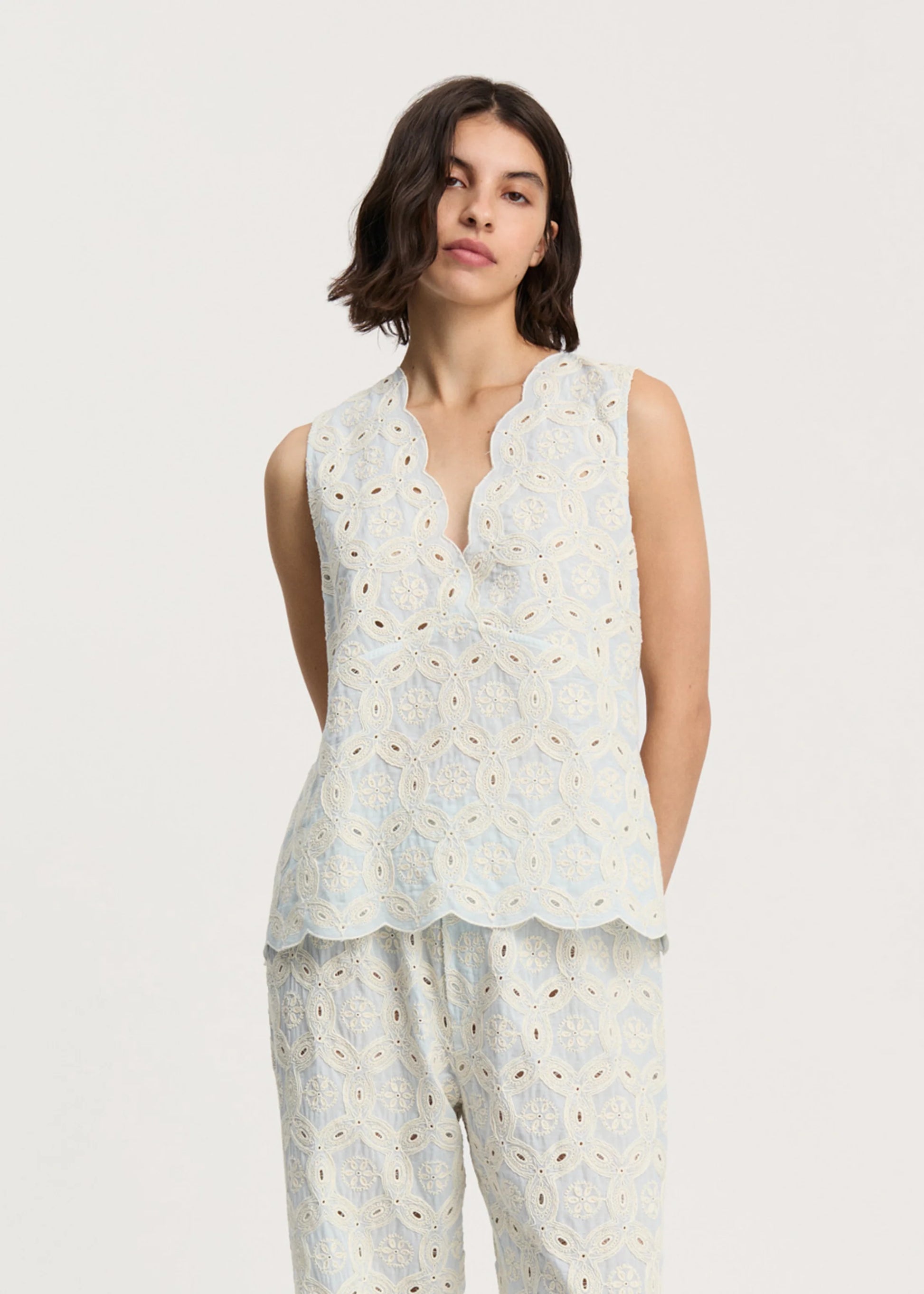 Aiayu skriver; An elegant, broderie anglaise top made from heavy, organic cotton. Designed in aregular fit with a unique pattern, creating a transparent look. The top is detailed with a V-neckline, button closure at the back and a refined, wavy hemline.