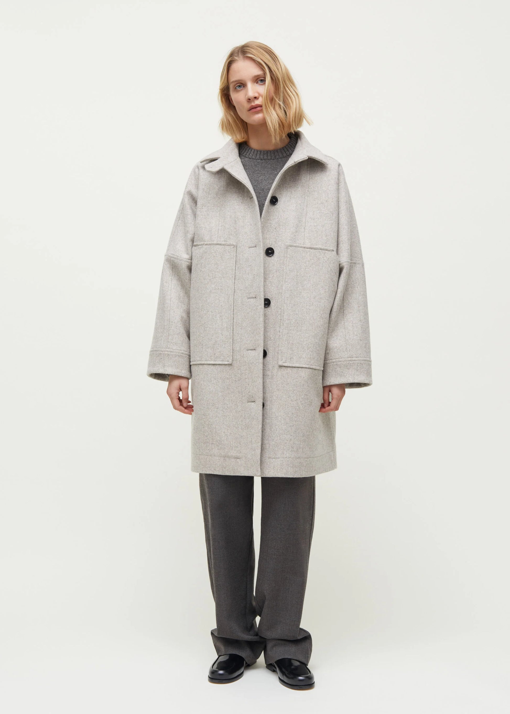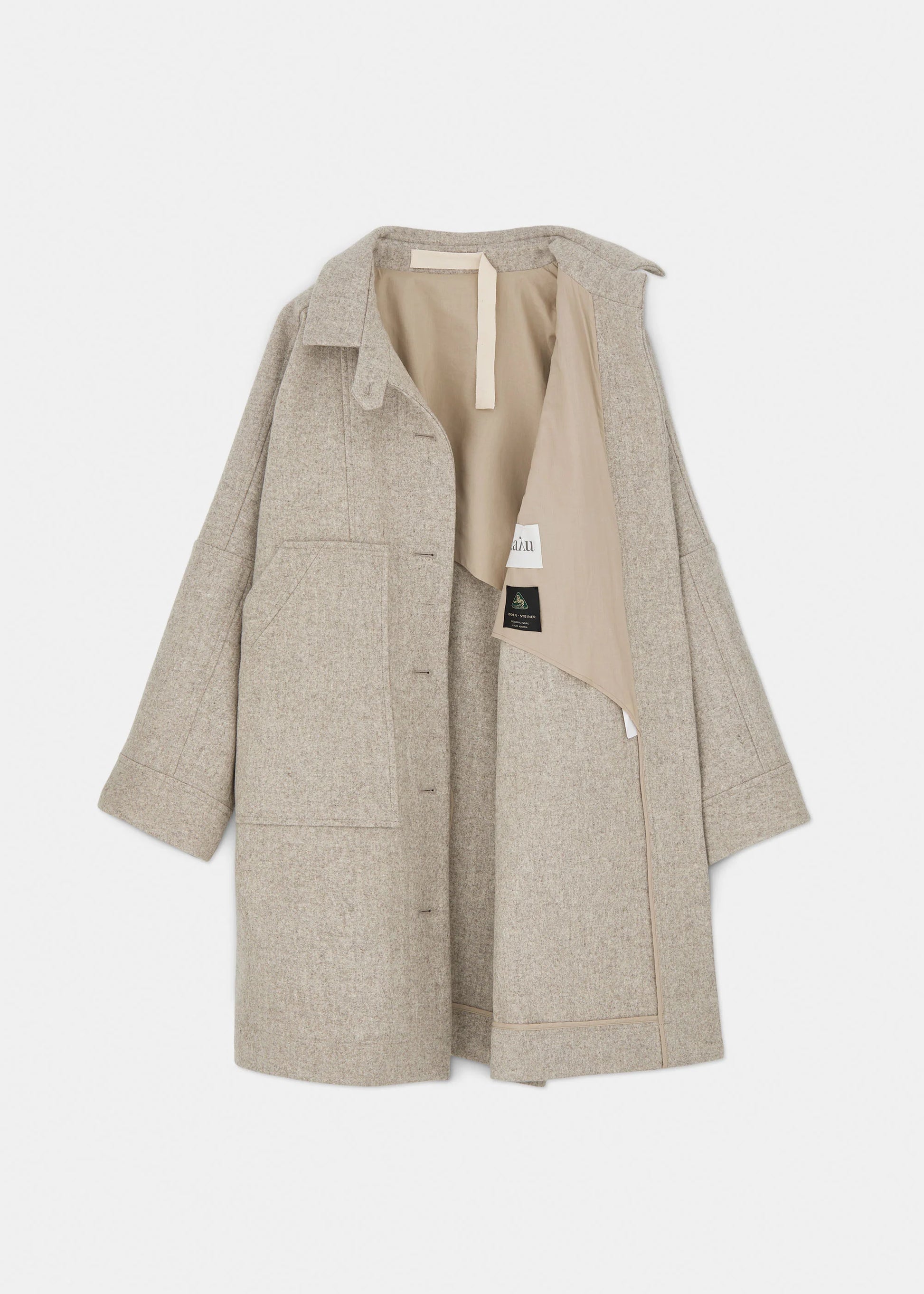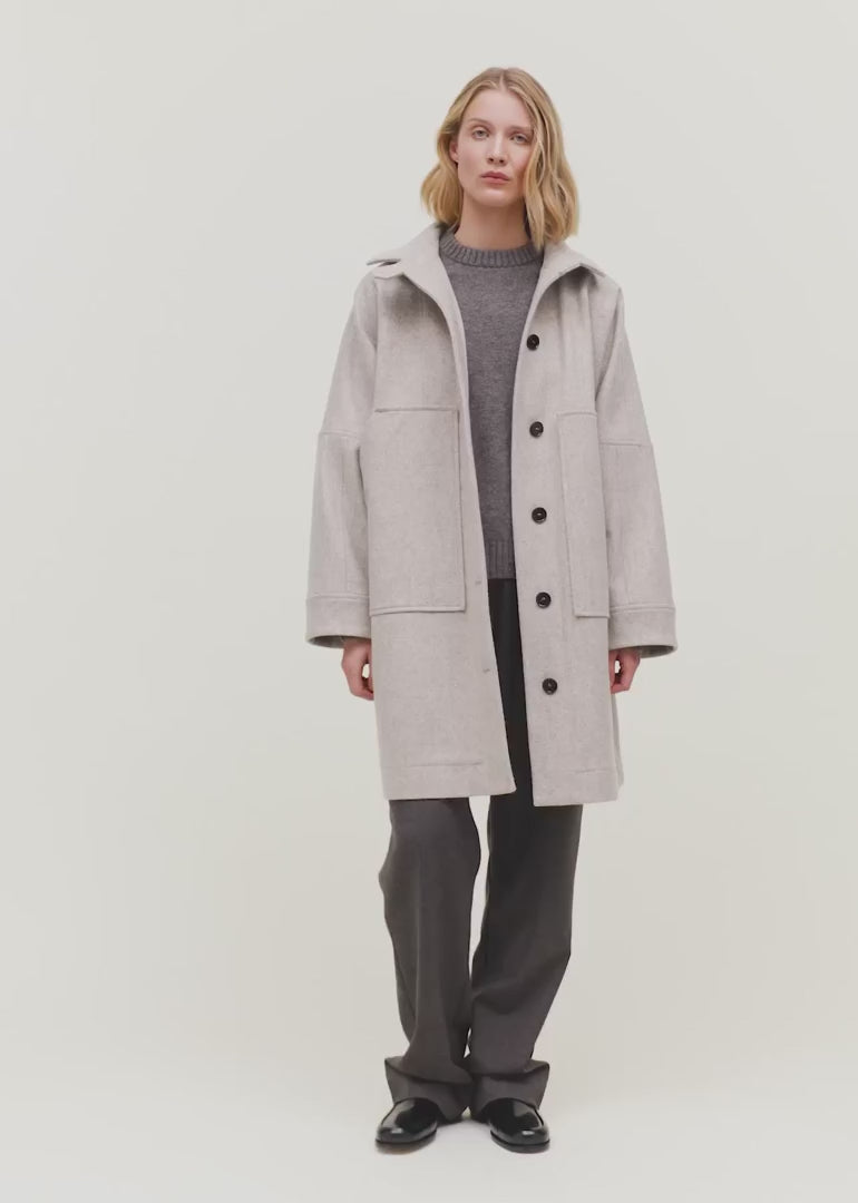 Aiayu skriver; An elegant, premium coat made from classic Loden wool. Tailormade in an oversized fit with a uniform-inspired silhouette featuring handcrafted horn buttons, and delicate details such as roomy, architectural sleeves and decorative strap details, giving the coat a modern twist.