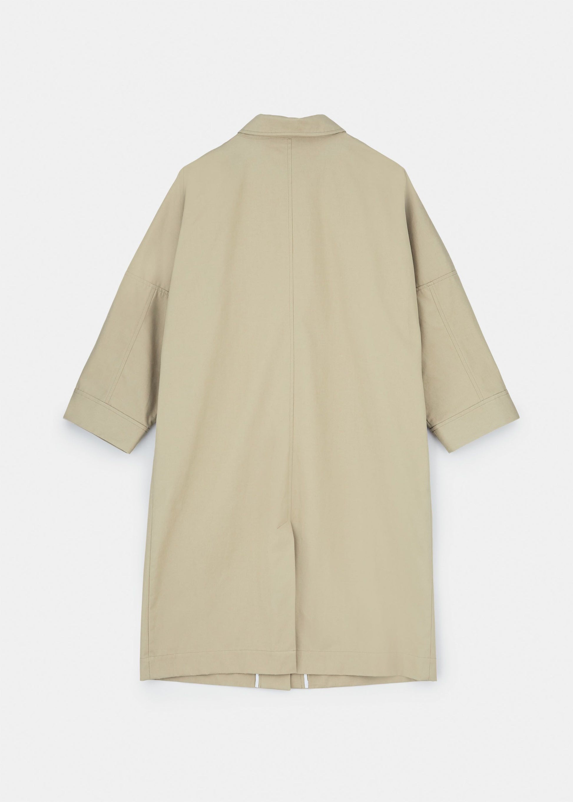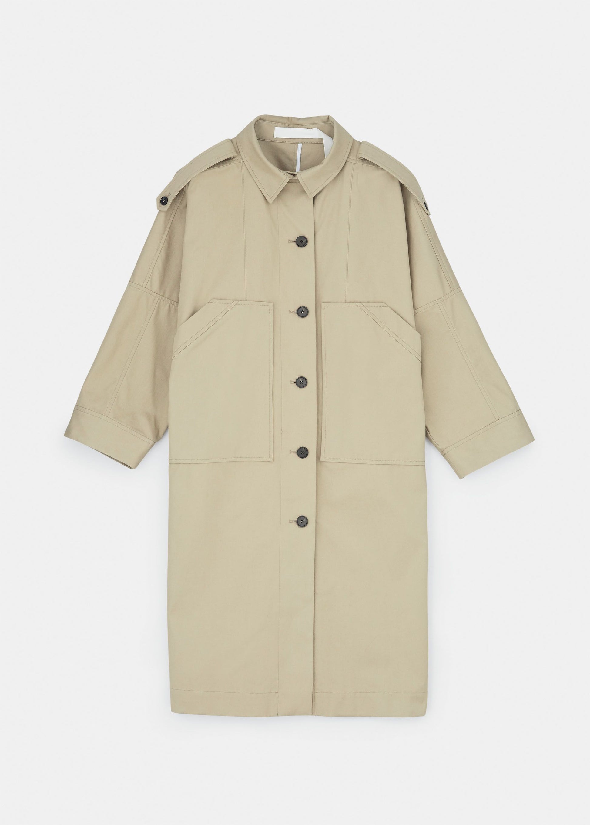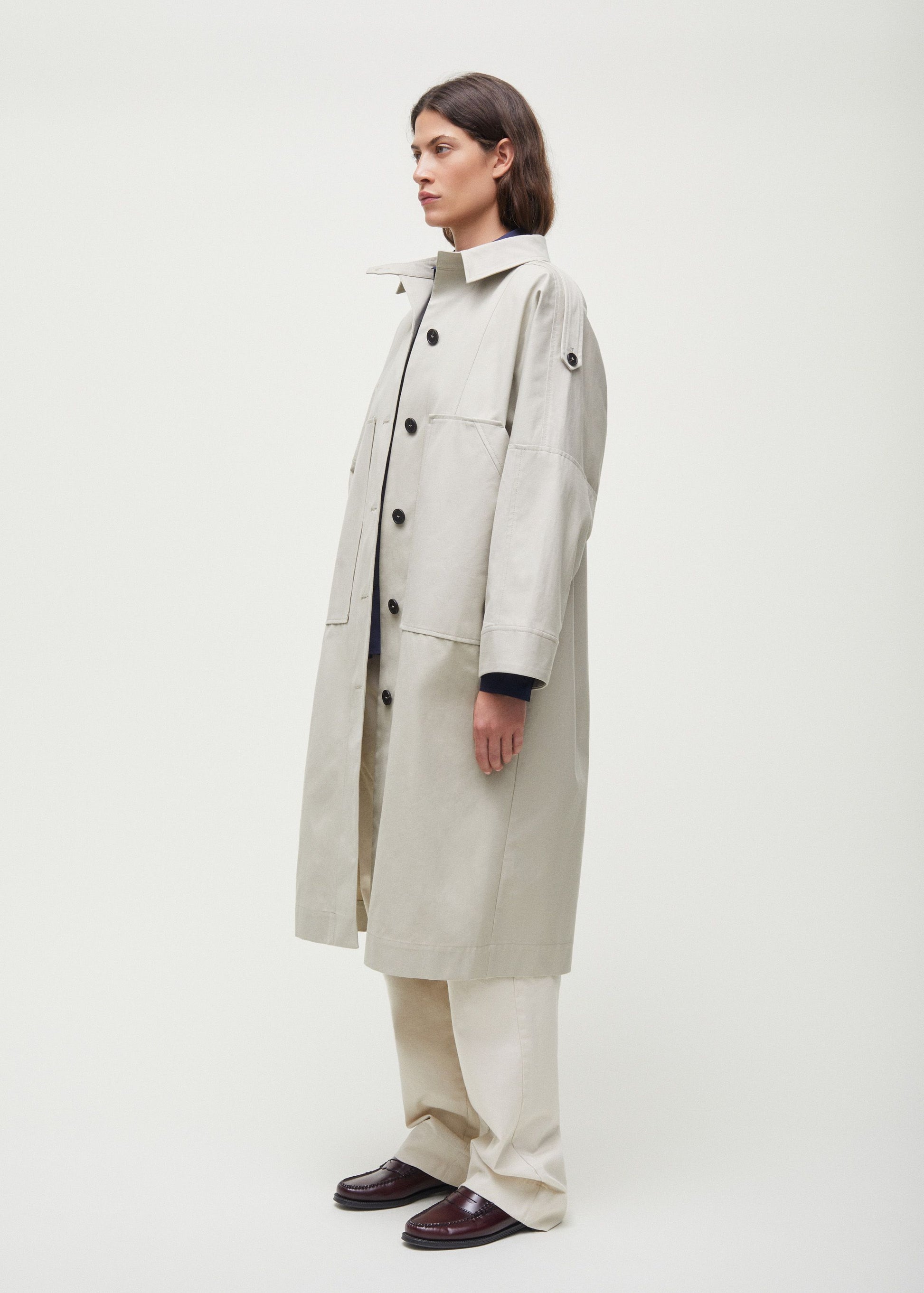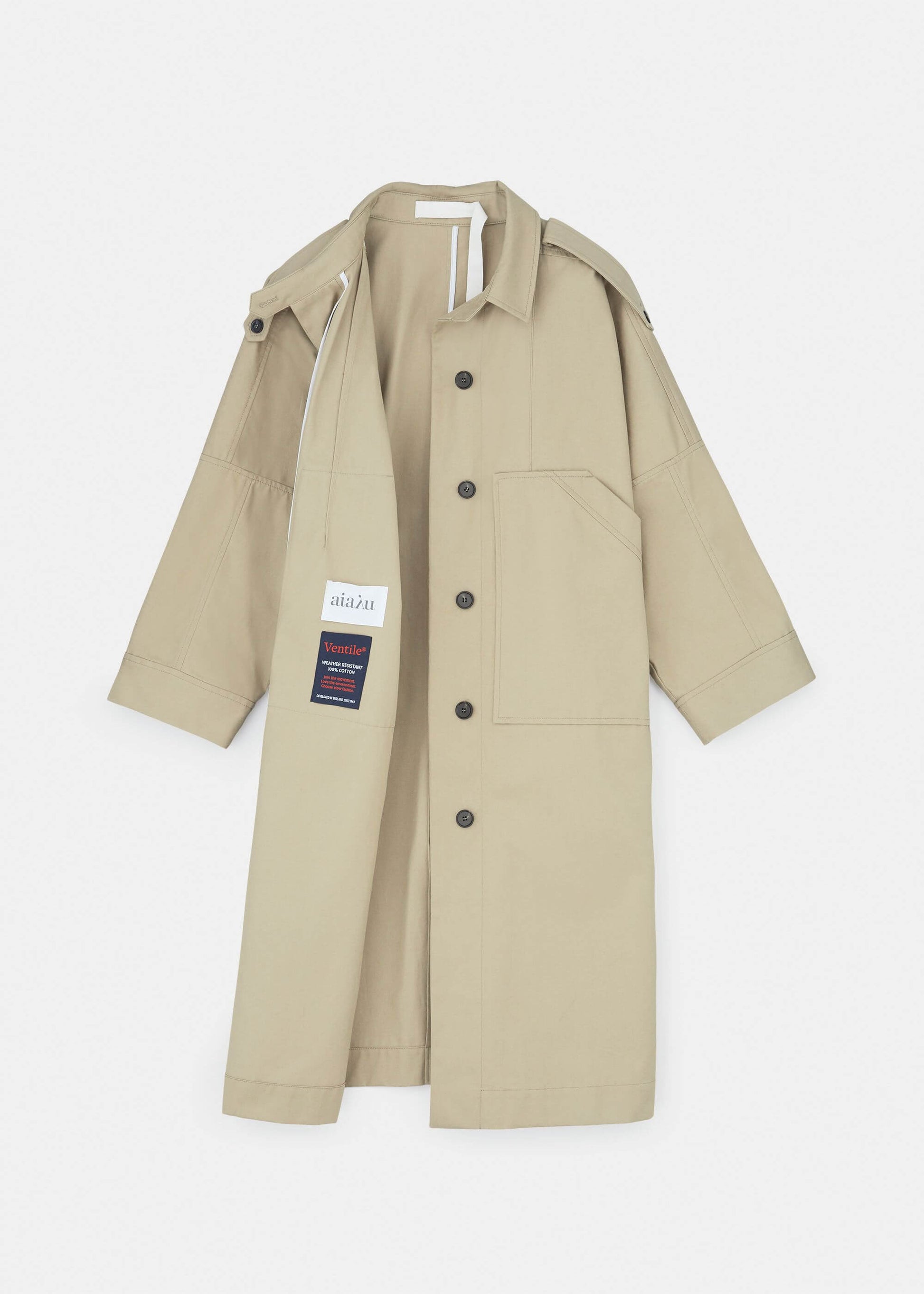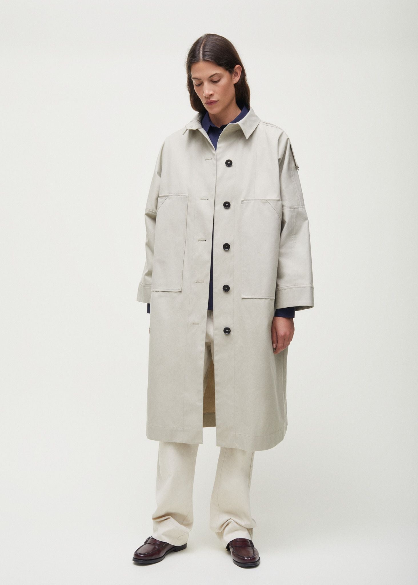 Aiayu skriver; Jean is the ultimate coat. Made in weather-resistant Ventile fabric, this piece is crafted for perennial wear with a high collar, convenient side pockets, strap detailing on the sleeves, and a classic back slit.