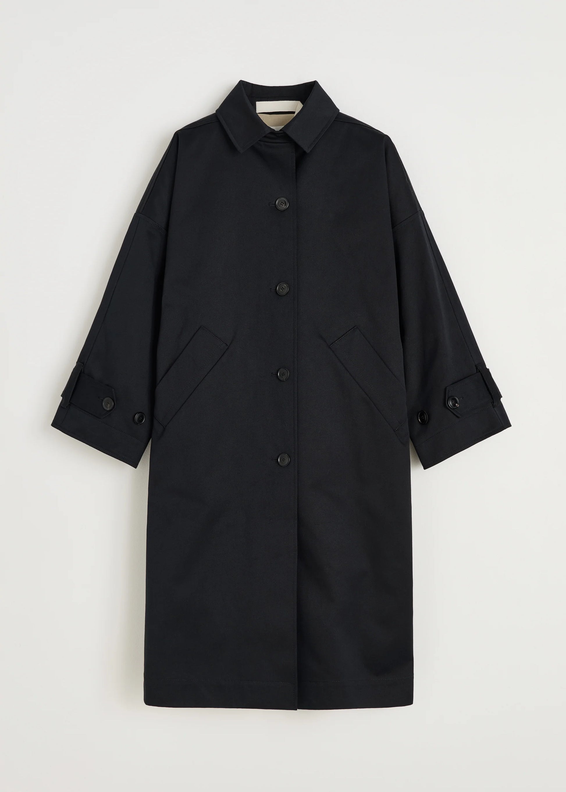 Aiayu skriver; An elegant coat made from organic cotton twill with a natural wind repellent coating. Tailored in an oversized fit with a workwear-inspired silhouette, featuring a delicate collar with button closure, dropped shoulders, piped pockets and adjustable straps at the sleeves.