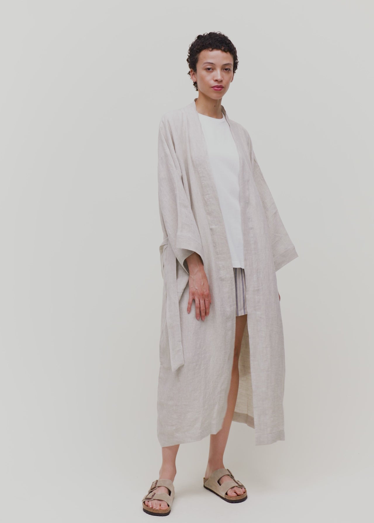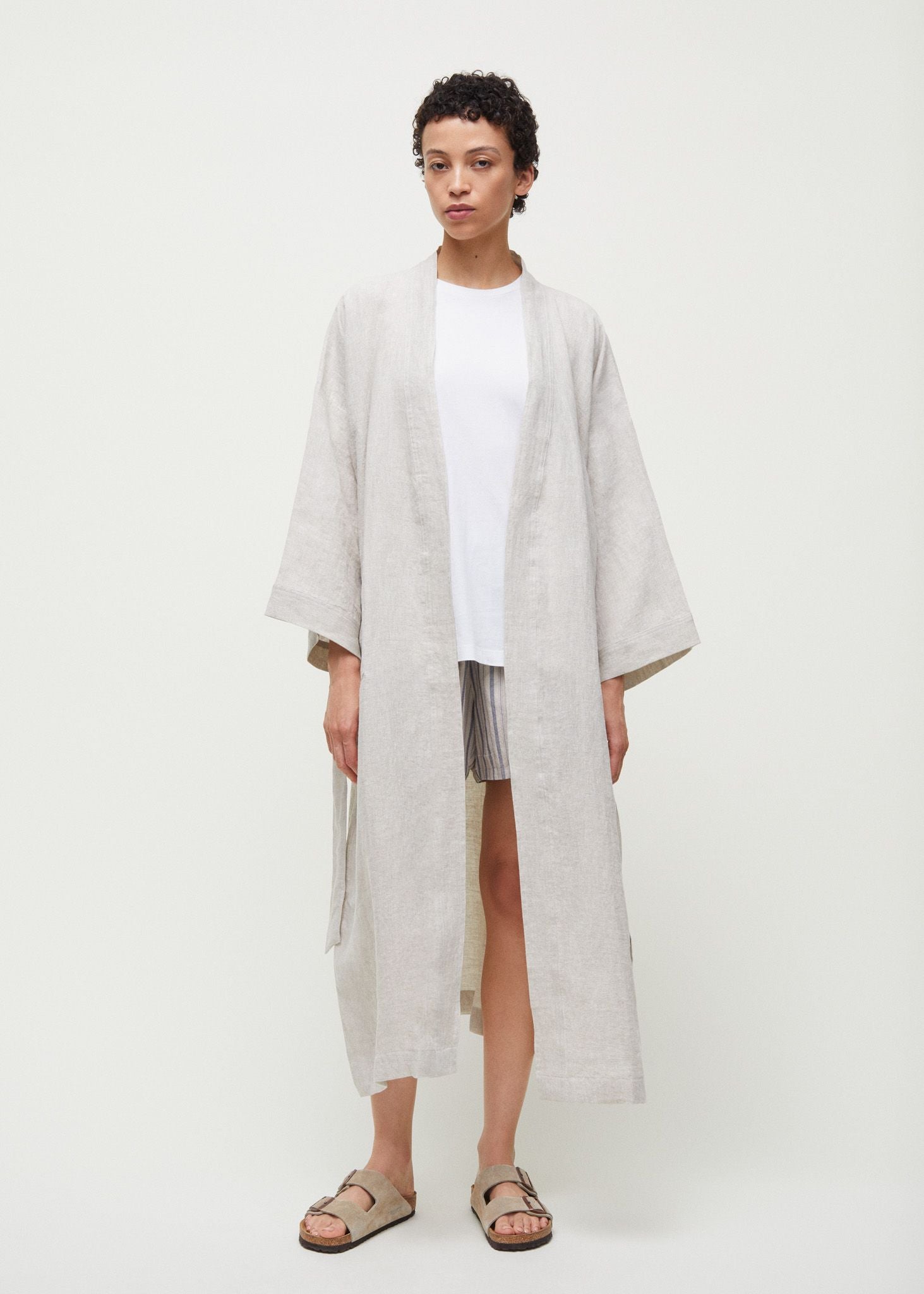 Aiayu skriver; Classic unisex robe with oversized, architectural sleeves and dropped shoulders. Features two outside pockets and a tie belt. Made from 100% European linen that is light and breathable, yet incredibly durable.