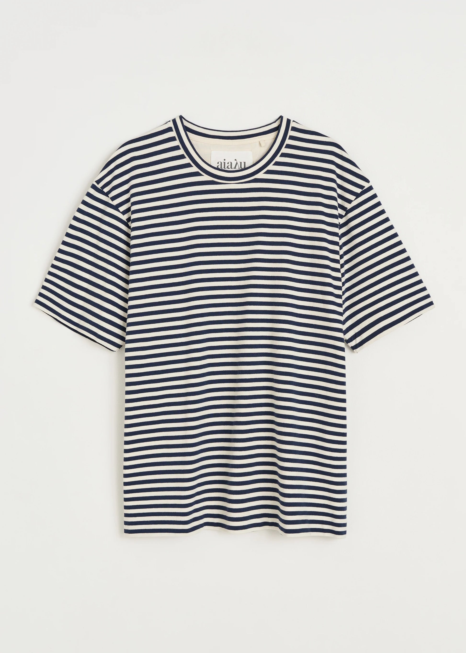 Aiayu skriver; A classic t-shirt made from a heavy blend of soft recycled and organic cotton jersey. Designed with inspiration from classic menswear t-shirts, it features a slightly oversized and regular fit with a round neckline, short sleeves and an embroidered aiayu logo at the back.