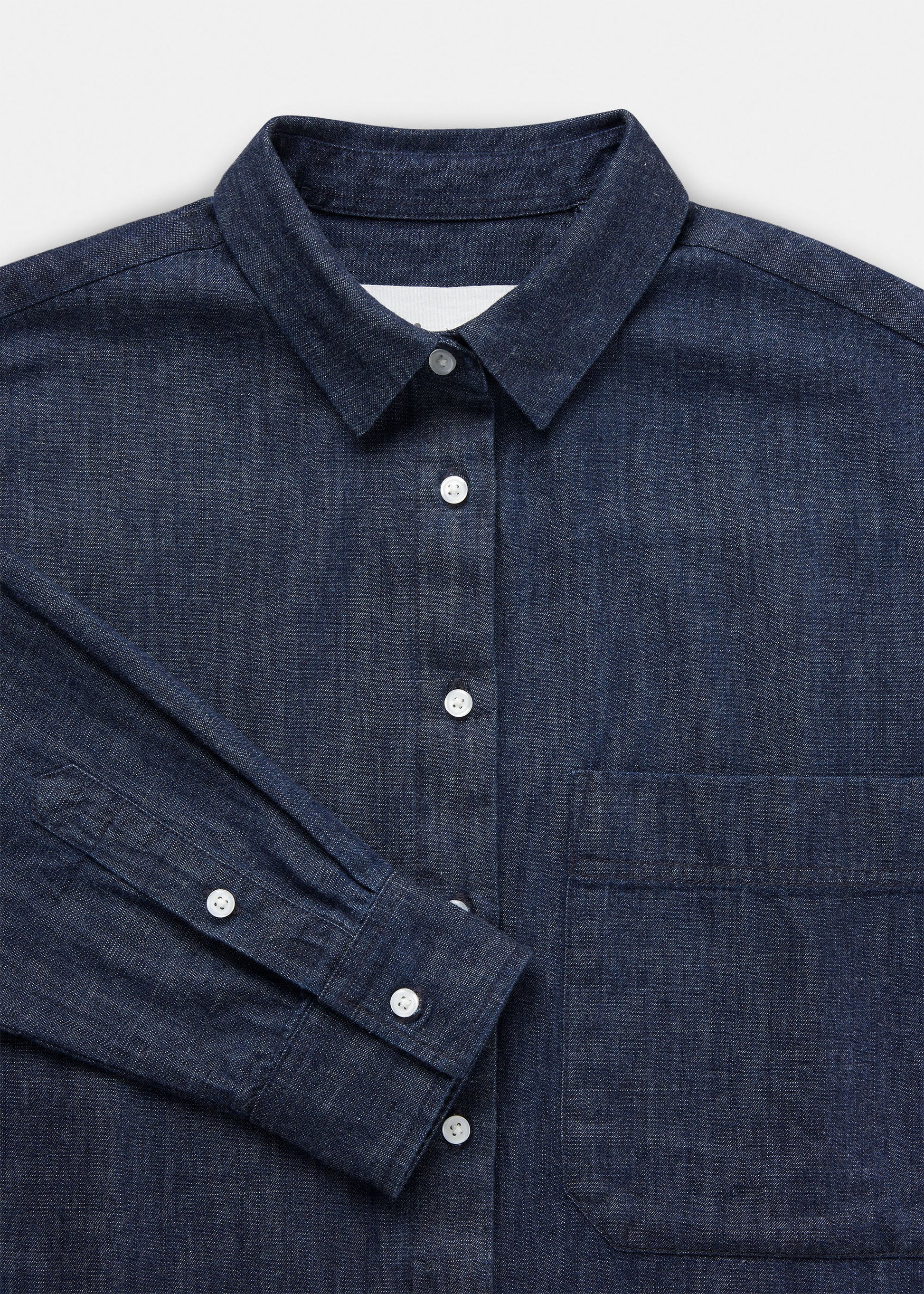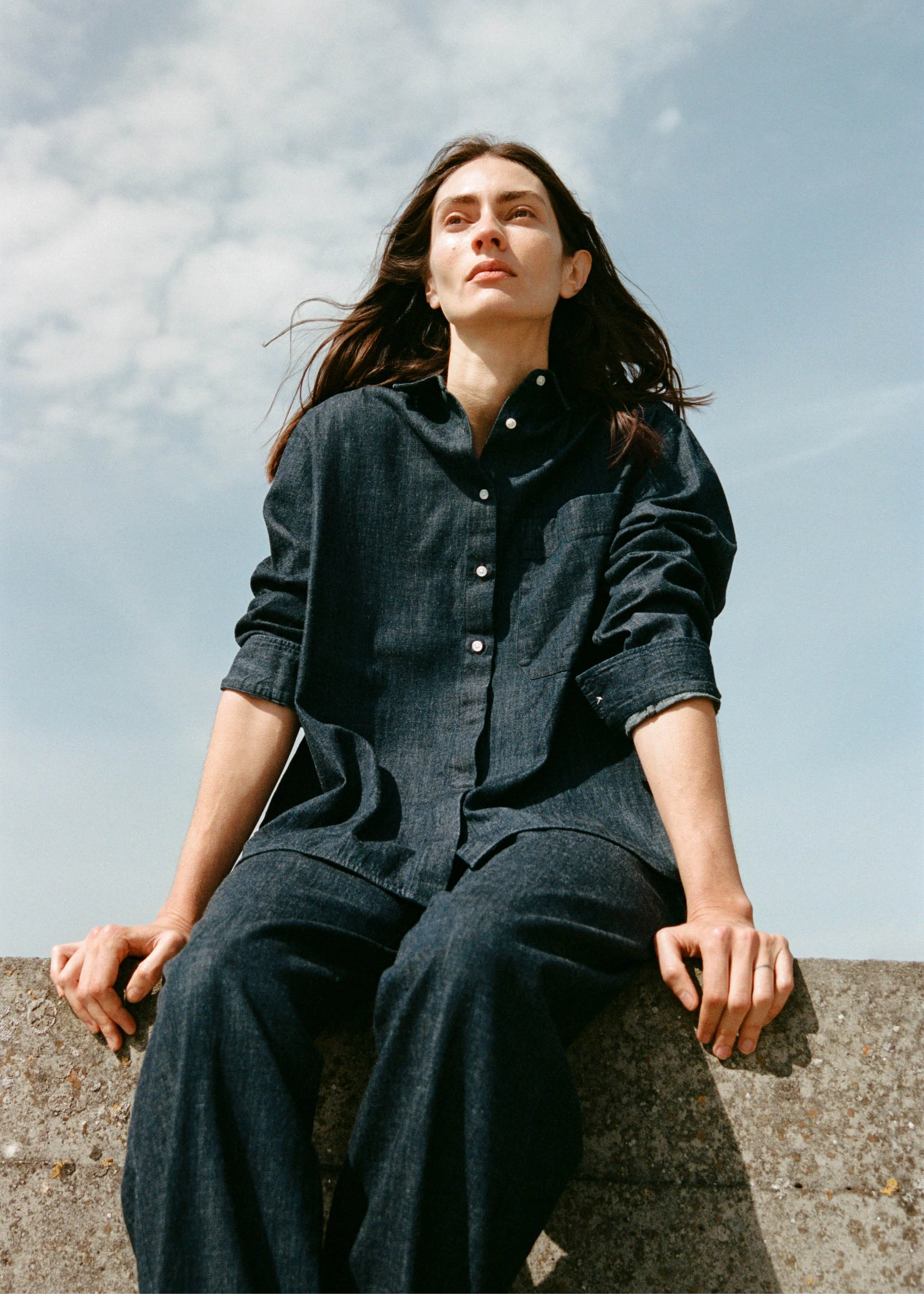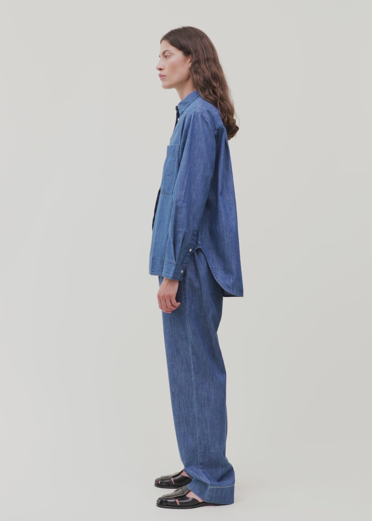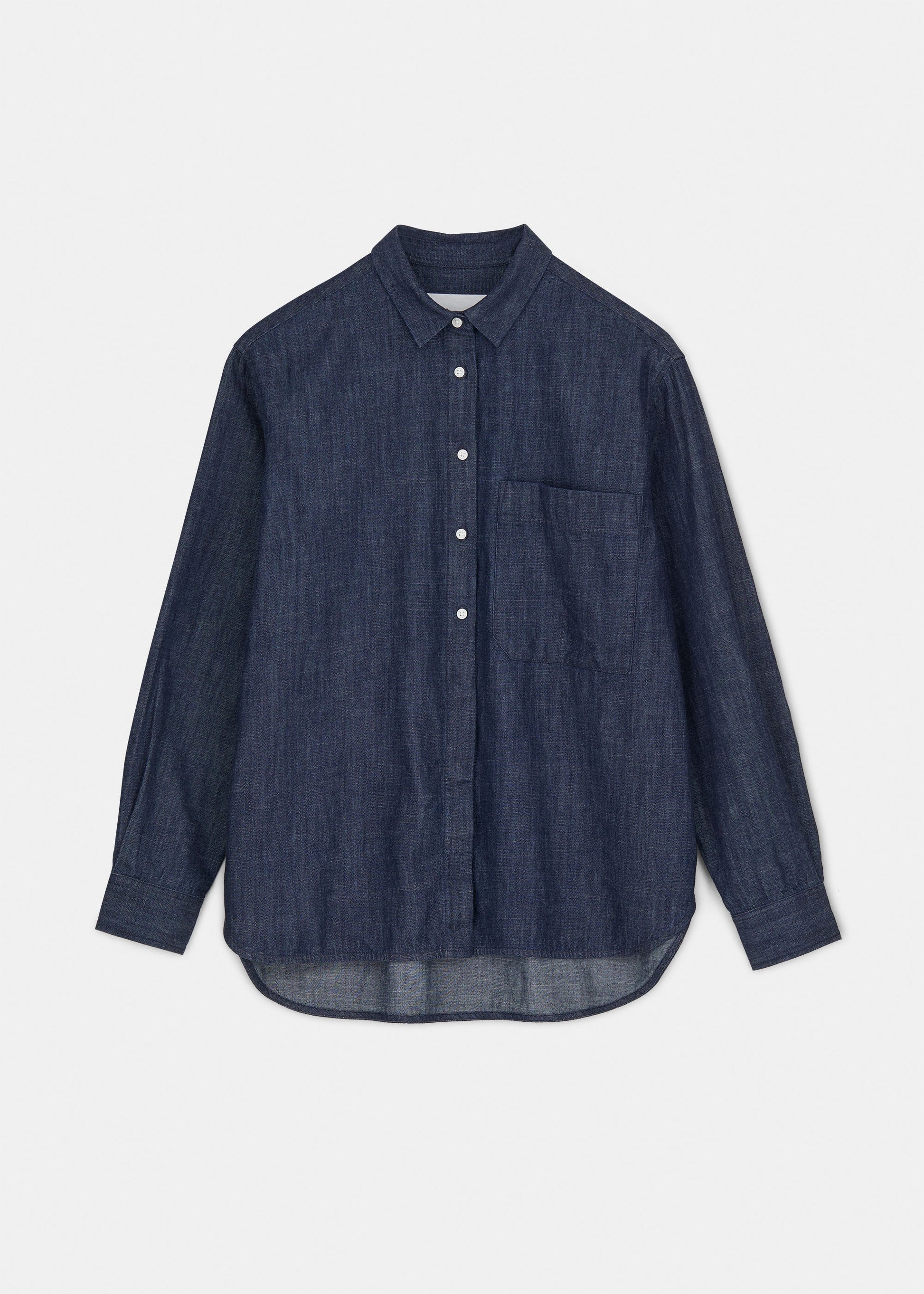 Aiayu skriver; Lynette Shirt is one of our signature shirts - a timeless, slightly oversized button-down shirt with a dipped back hem. This version comes in a soft, denim-inspired quality for a relaxed look, made from 100% regenerative farmed and organic cotton. The shirt is complemented with mother-of-pearl buttons and a single front pocket. Wear it with Miles Pant Denim as a set, or style it to your liking.