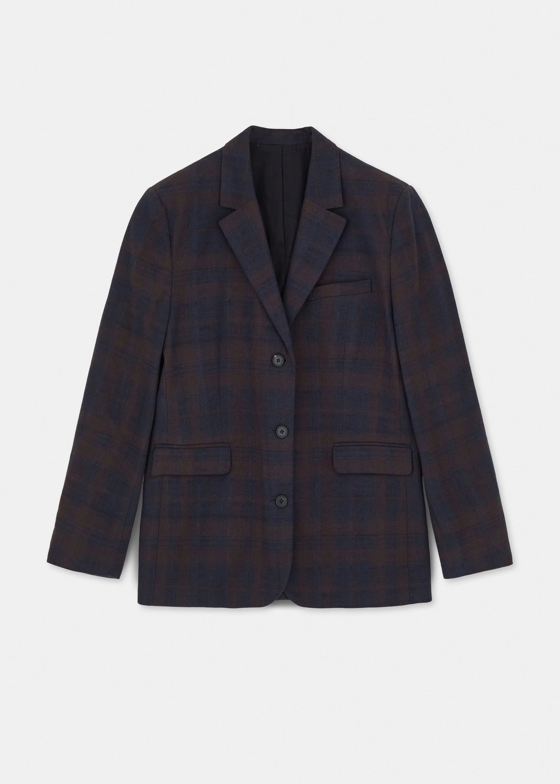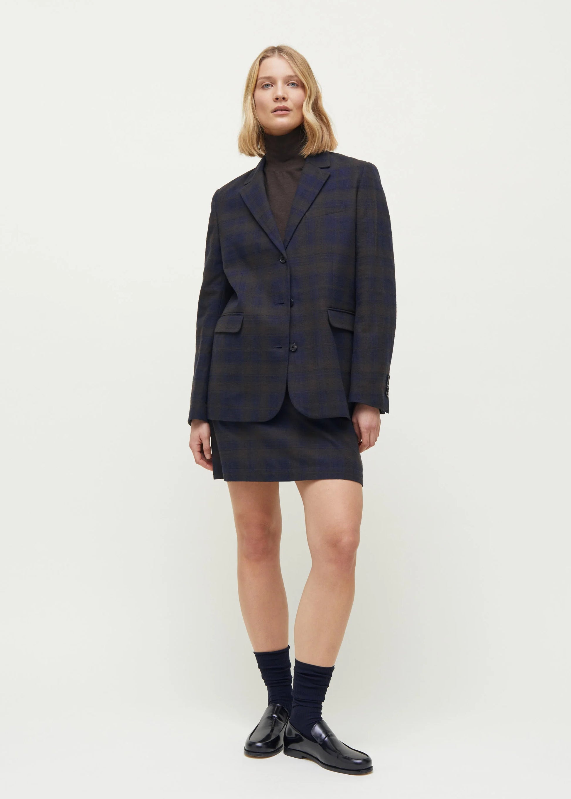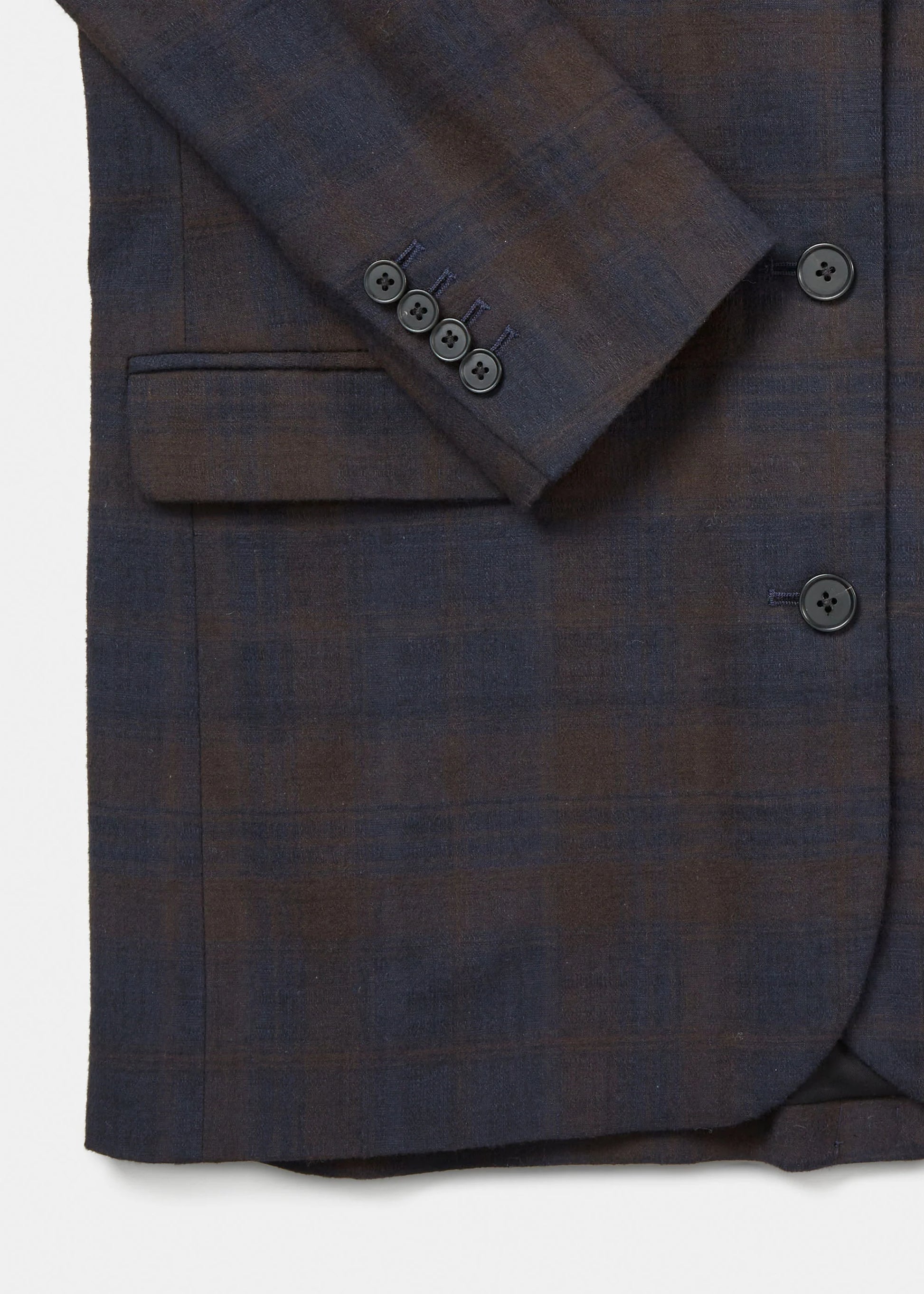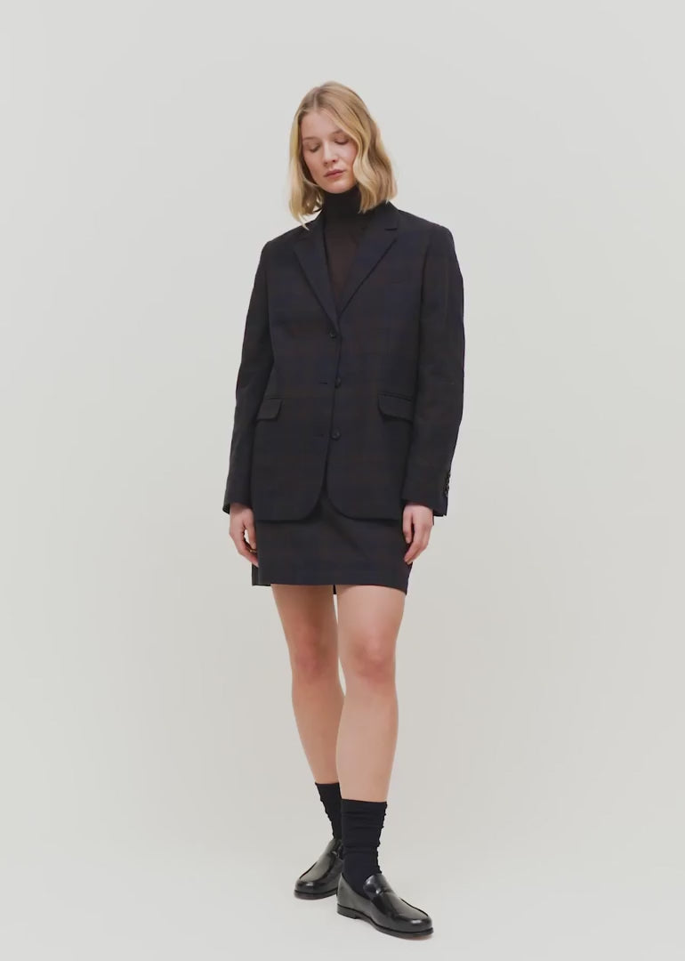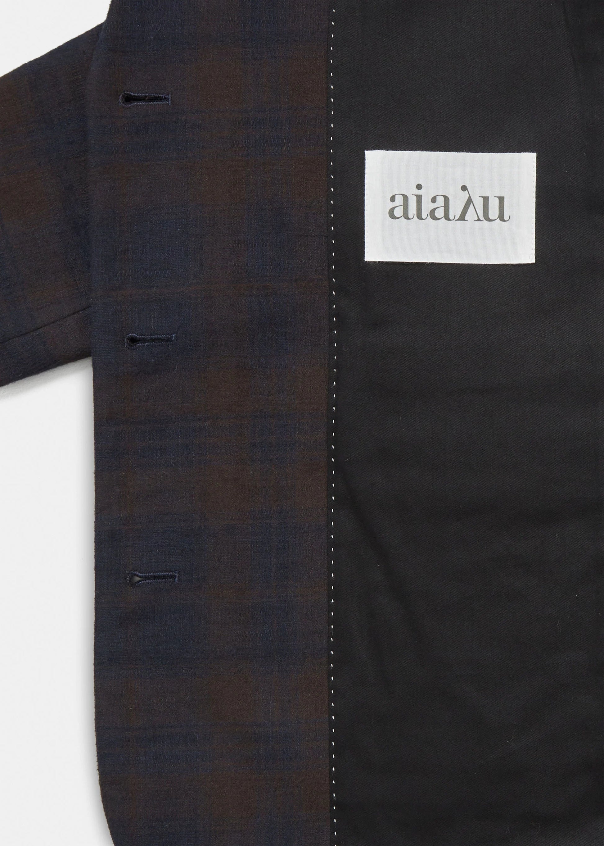 Aiayu skriver; A refined everyday blazer with classic suit detailing and a sleek silhouette with a nostalgic 70s look in a subtle, checkered pattern in navy blue and dark brown tones, tailormade in Europe. Wide lapels, front welt pockets, subtle back slit, and slightly padded shoulders for a streamlined look.