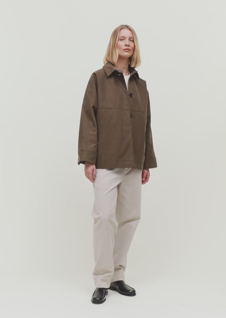 Organic cotton coated with olive oil for a natural and slightly patinated wax finish. Naturally breathable and light, the wax adjusts to ambient temperature, becoming softer in warm weather and stiffer with more wind-proof qualities in cold conditions.Fabric crafted in the UK with a supplier that is specialized in waxed cotton and weatherproof fabrics, using only responsibly sourced cotton and low impact manufacturing.The waxed cotton fabric will naturally develop creases and lived-in marks over time, adding character to each piece.