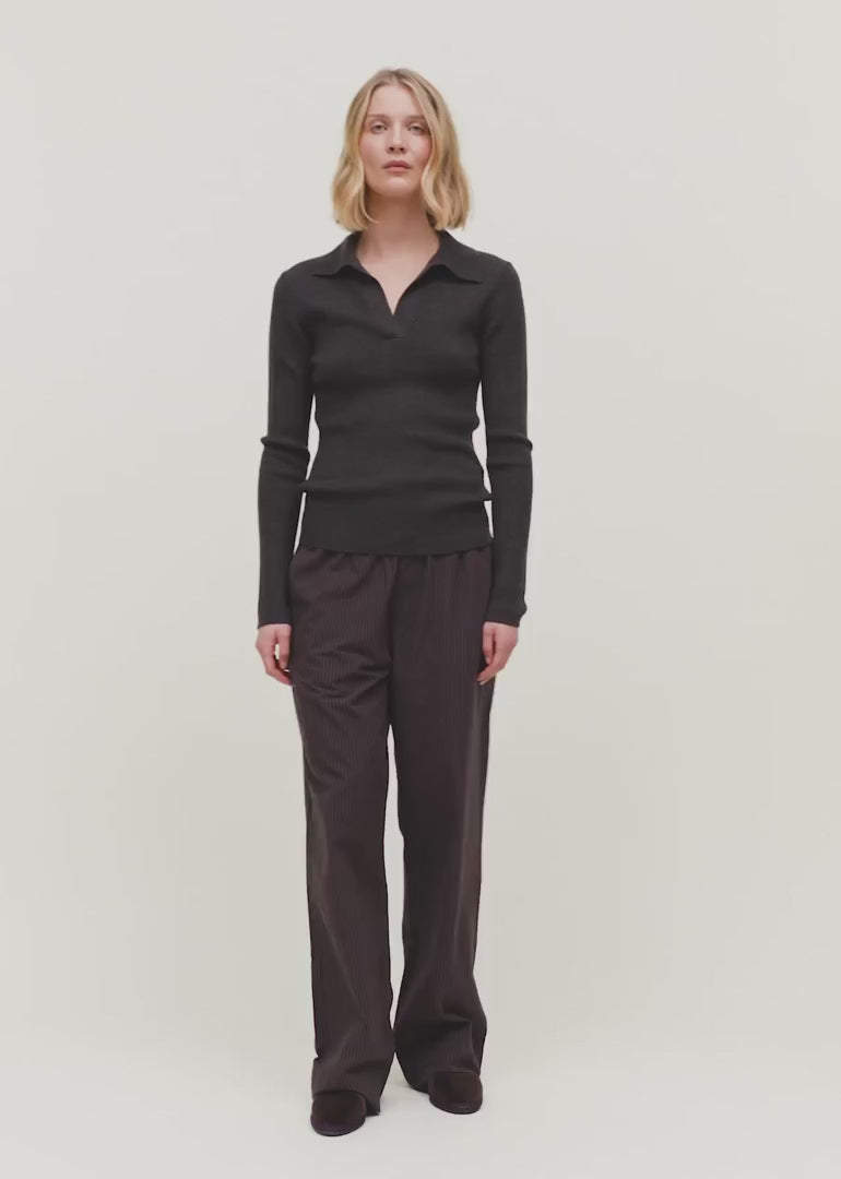 Aiayu skriver; A refined, ultra-soft blouse made from exclusive merino wool with an elegant ribbed pattern in a warm dark brown tone. Made in a slim fit with decorative details like a loose collar, long sleeves and ribbed edges, that completes the look.