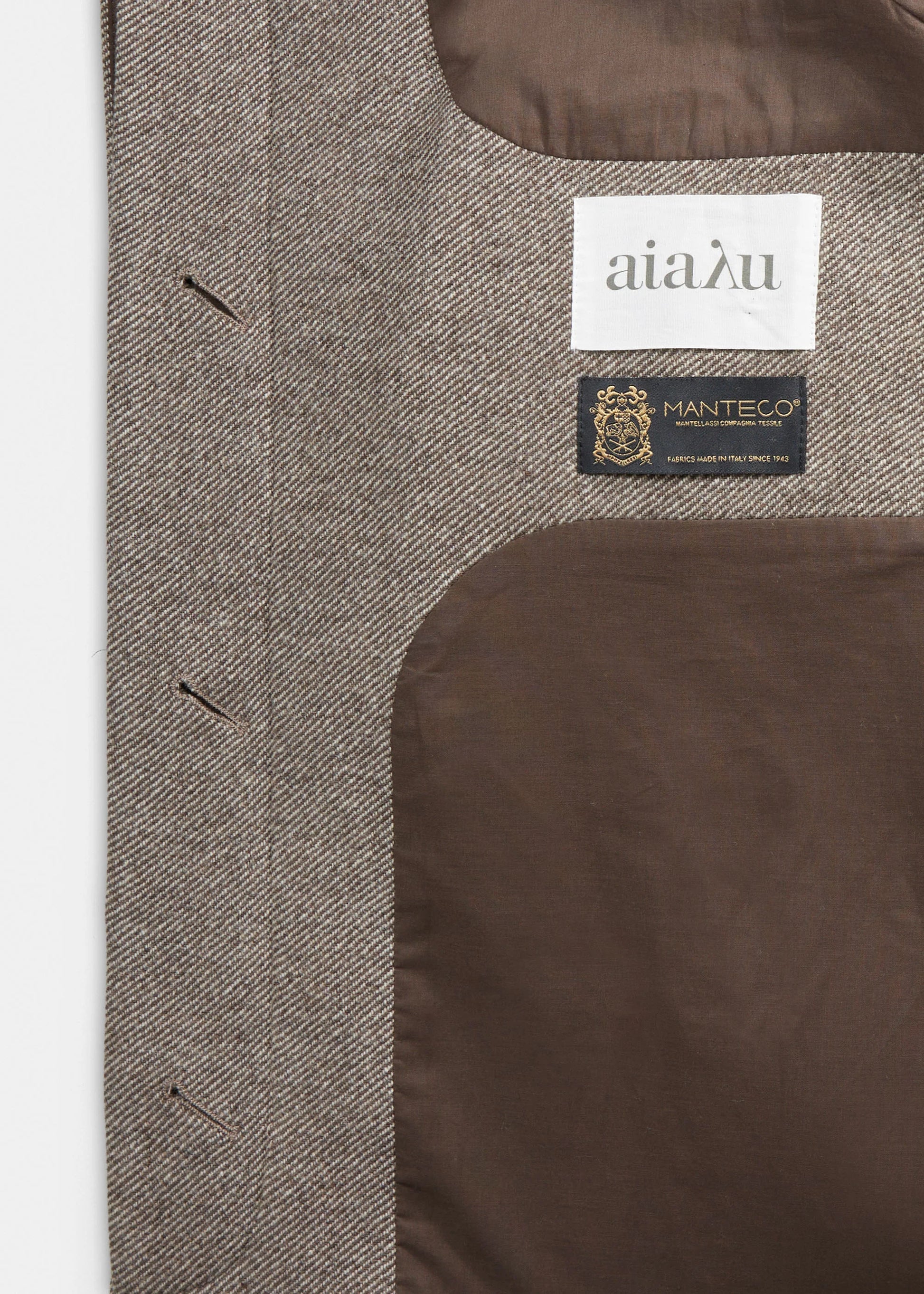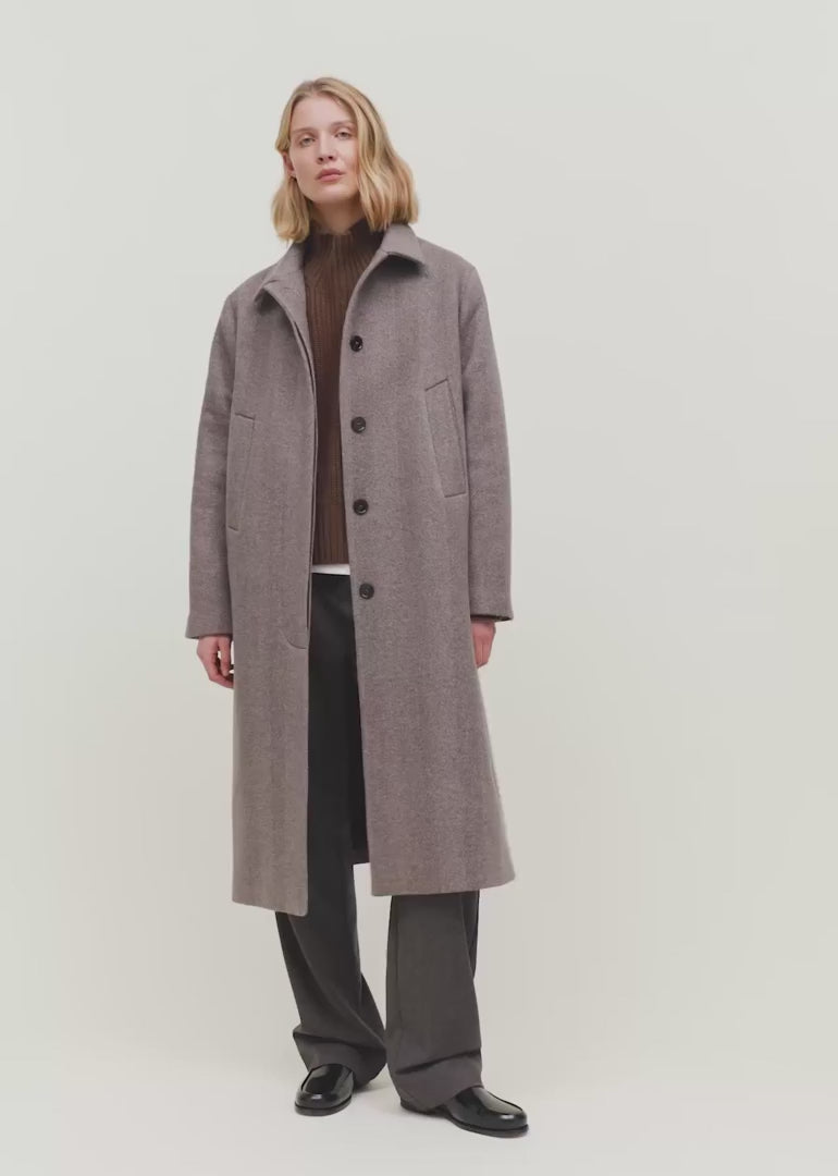 Aiayu skriver; The Noah Coat is an exclusive outerwear piece made from 100% recycled merino wool. Shaped to a classic straight silhouette with a regular collar, high side pockets, and a mid-calf length, Noah Coat has an exceptionally soft and delicately brushed surface, and a slight pin stripe pattern for a distinctive edge.The recycled wool material is a part of our circular production, where scraps and leftover fabric is beautifully transformed from waste into resources. Only high quality and pure natural fibers are eligible for this purpose, creating new luxury yarns from existing high-end product.