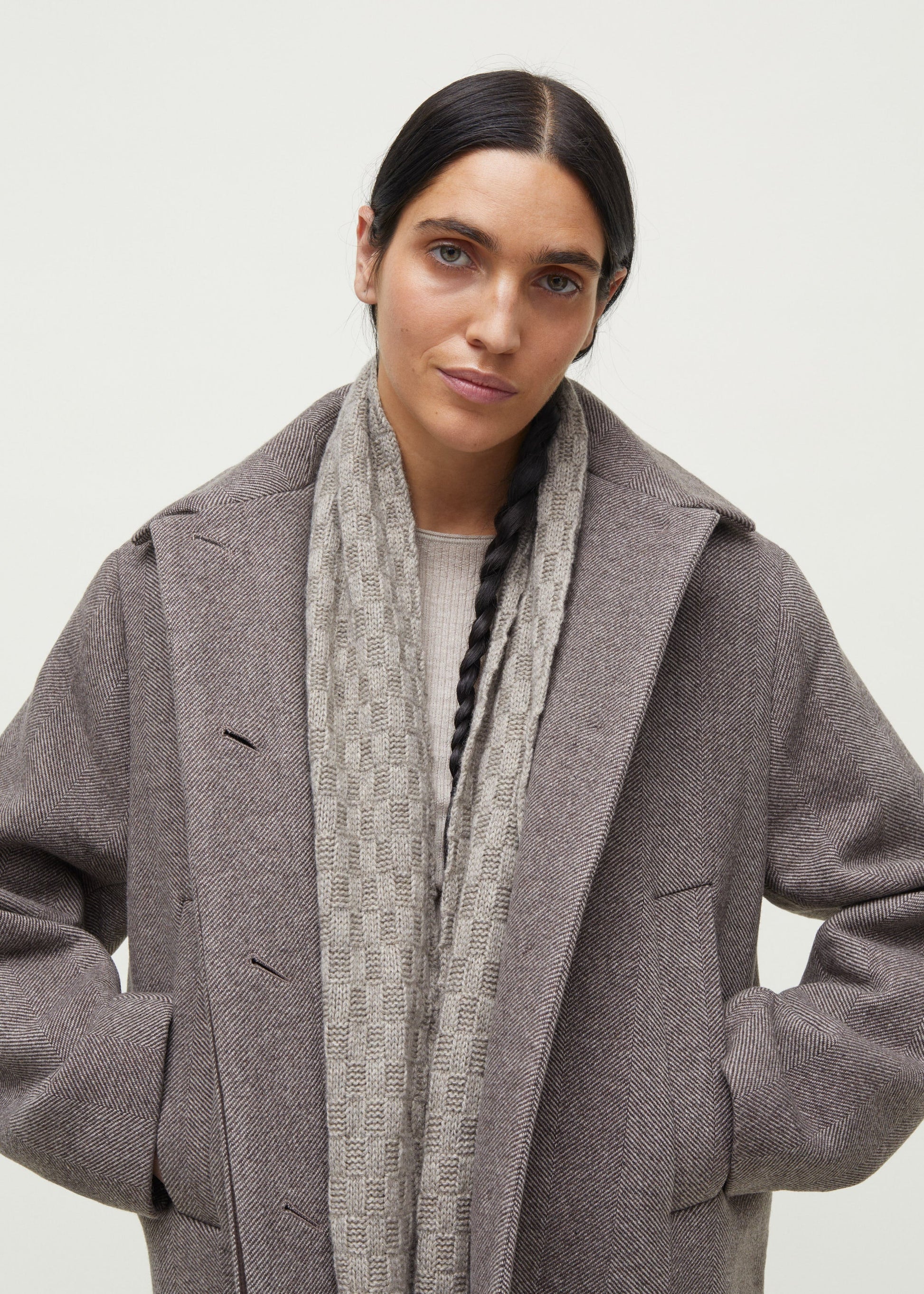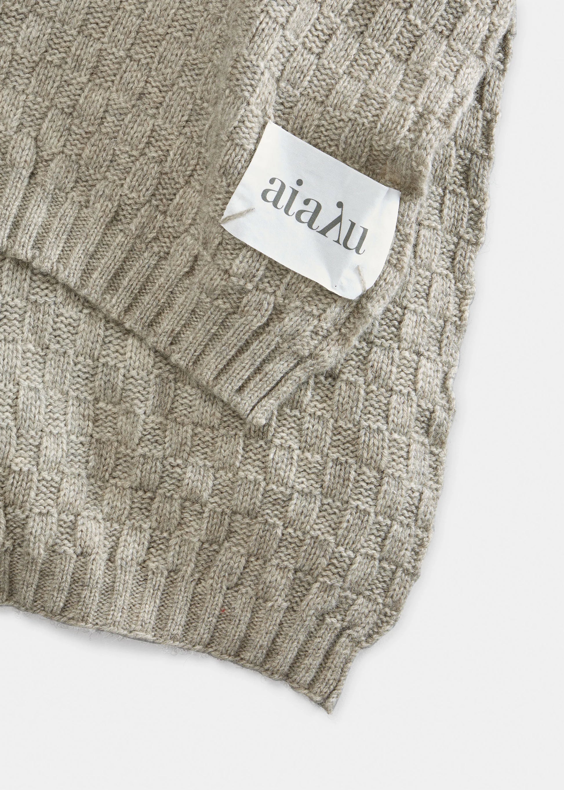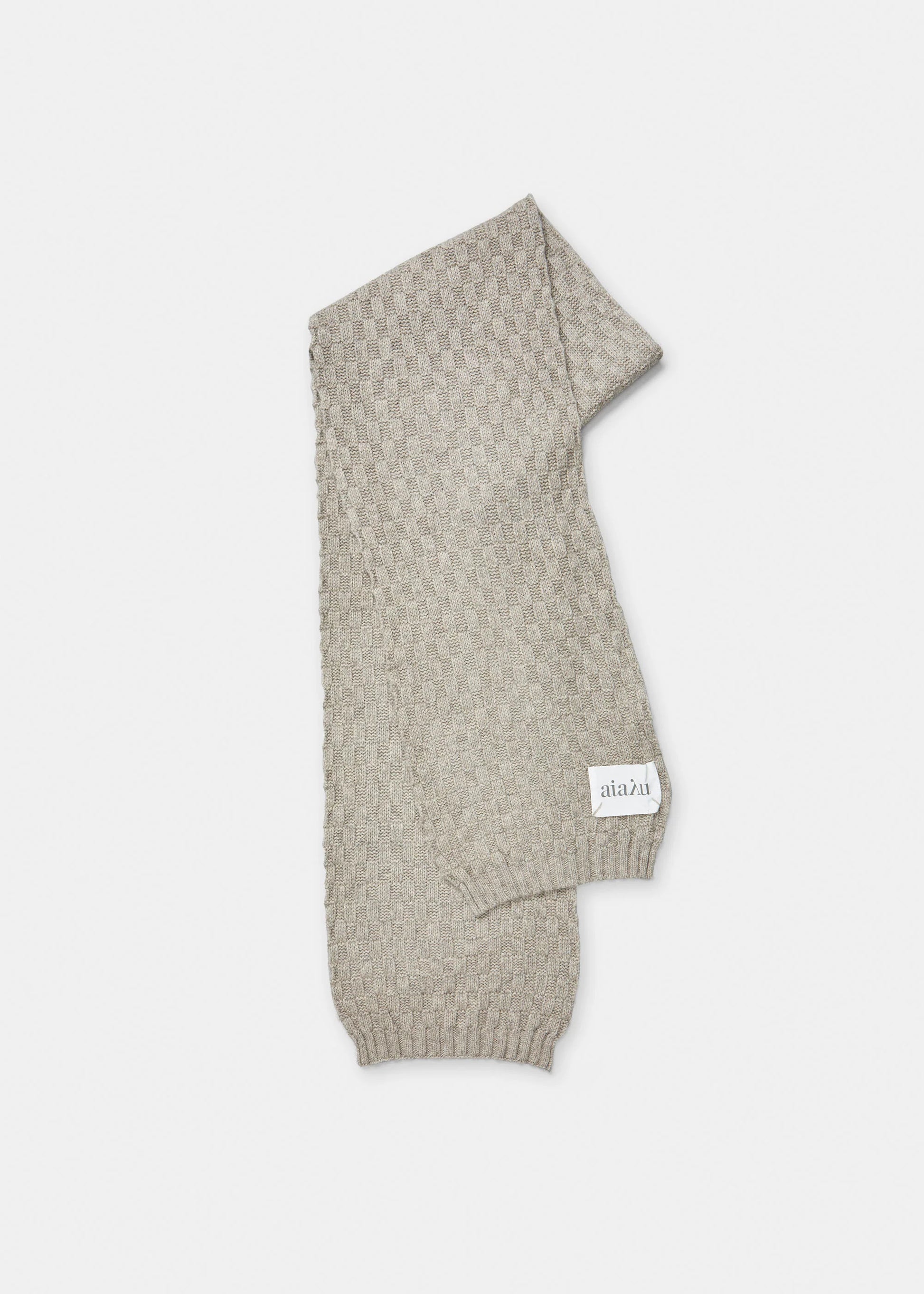Aiayu skriver; A soft, knitted scarf in a square shape with an elegant square knit pattern. The scarf is made from undyed, premium yak wool and features delicate ribbed edges, while the sides maintain a raw, natural finish.