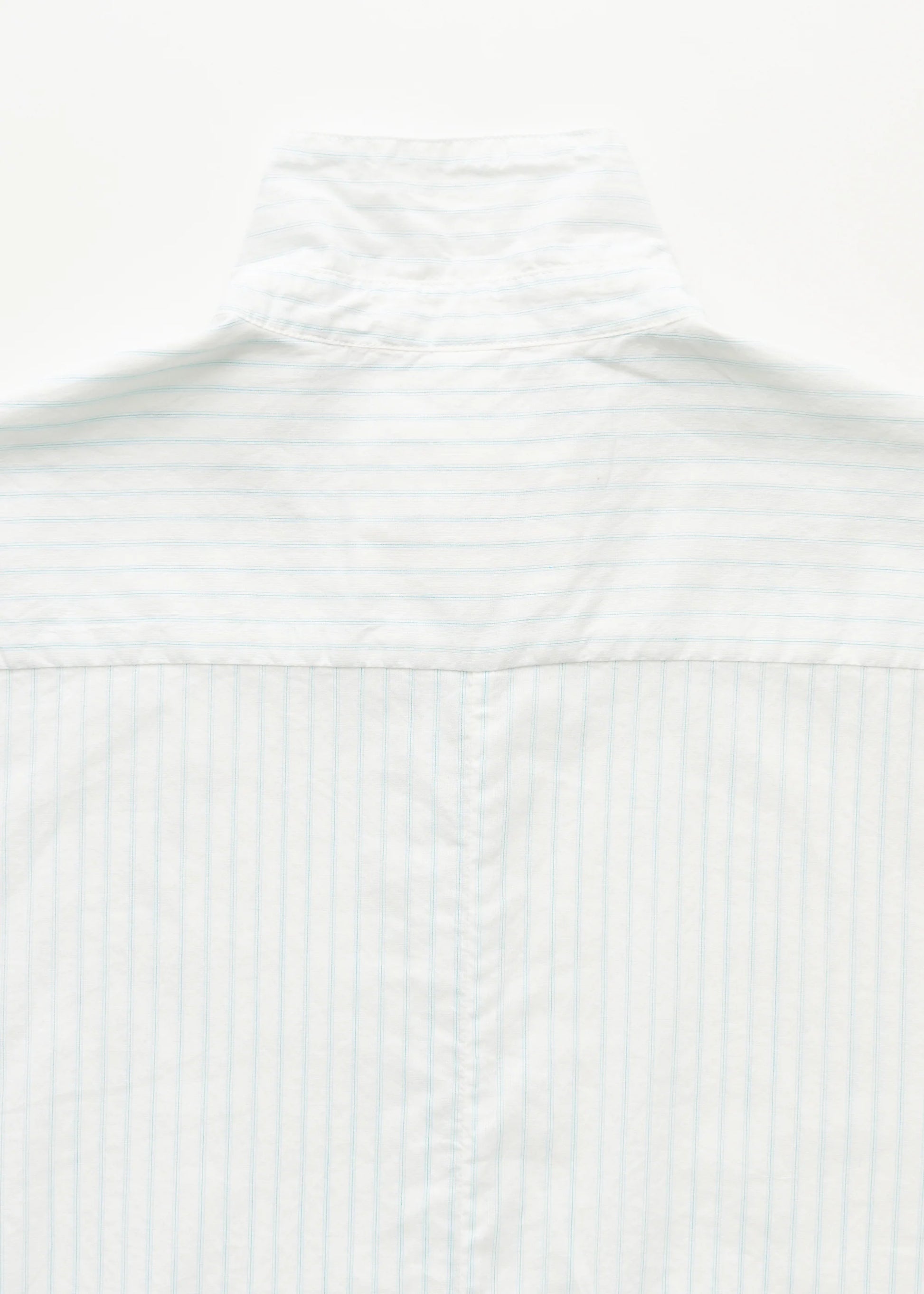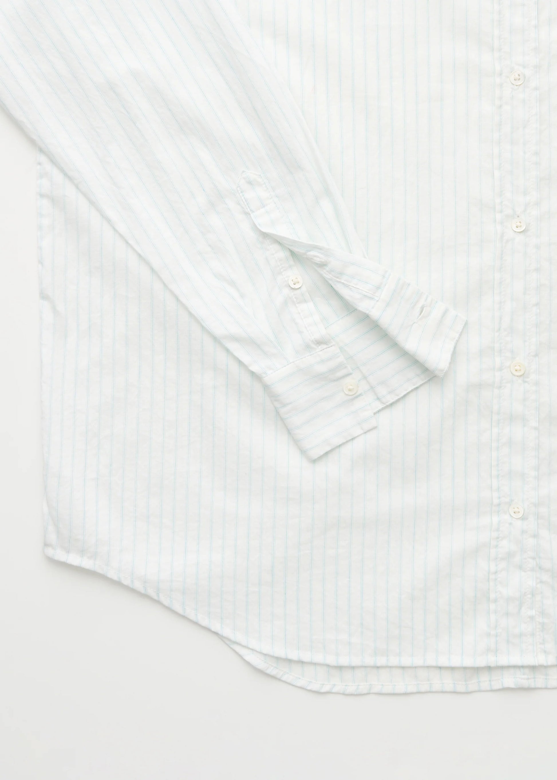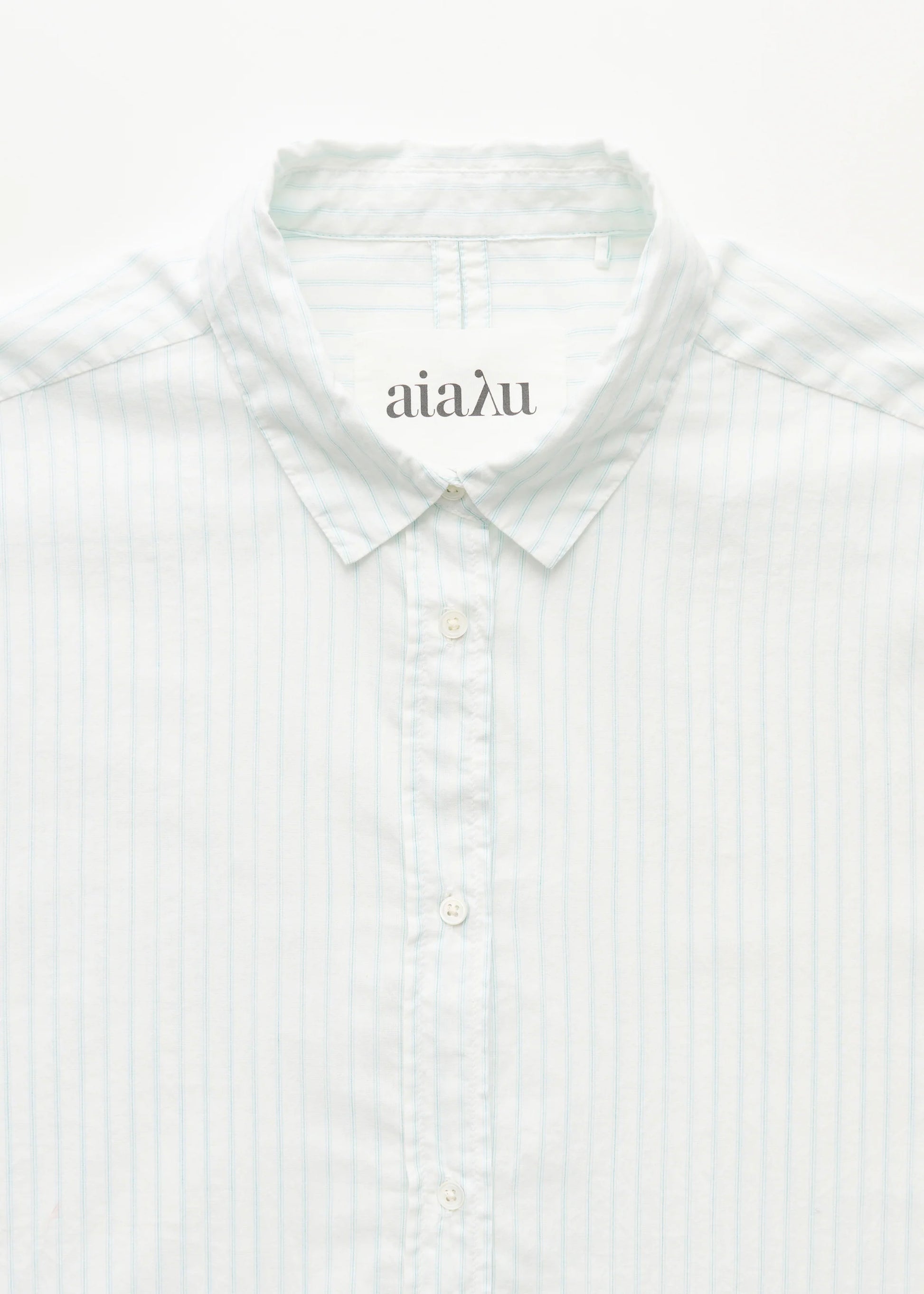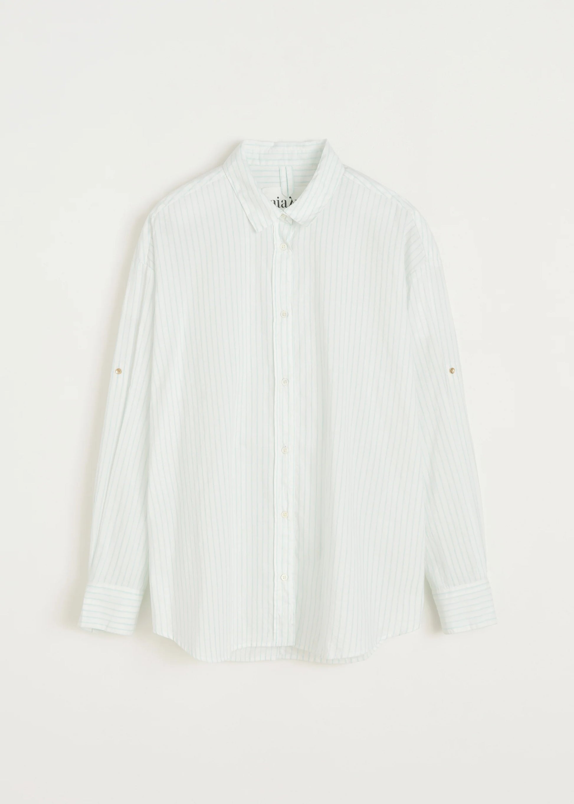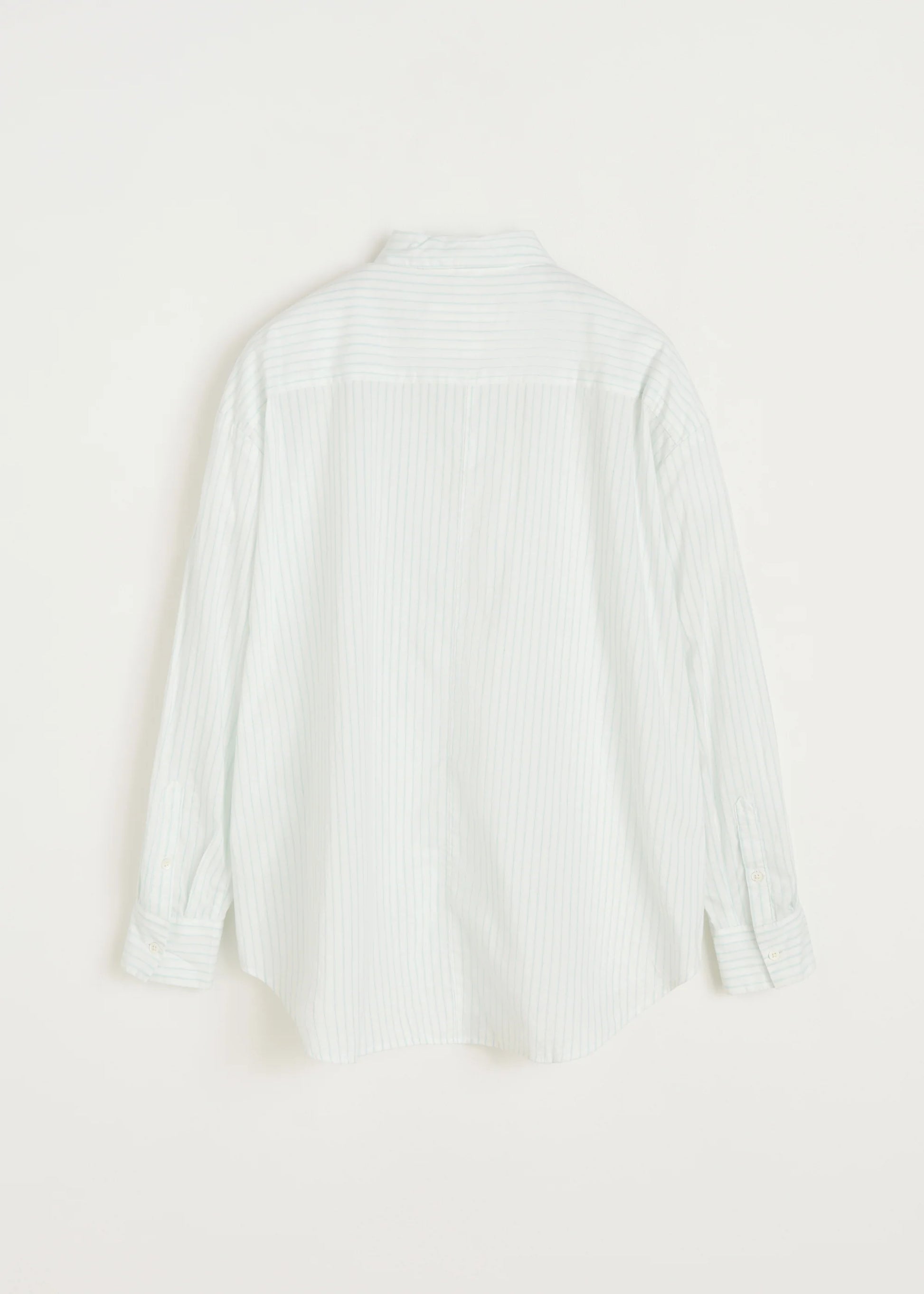 Aiayu skriver; A timeless shirt made from organic cotton poplin with a dainty, thin, mint coloured stripe. Designed in a relaxed, voluminous fit, featuring a detailed curved and slightly lowered back hem, mother-of-pearl buttons and a sleeve closure, allowing the shirt to be easily worn with rolled-up sleeves.