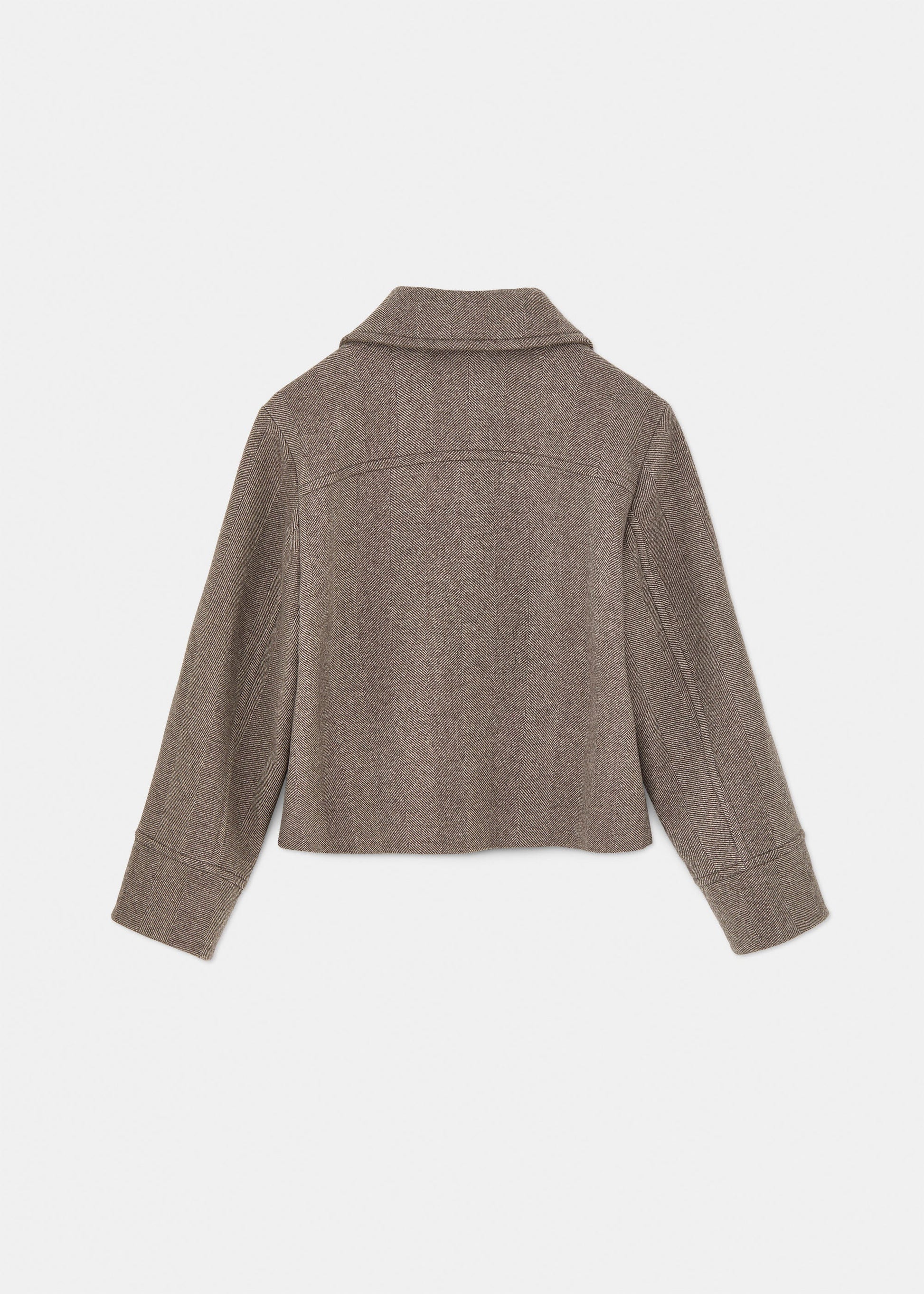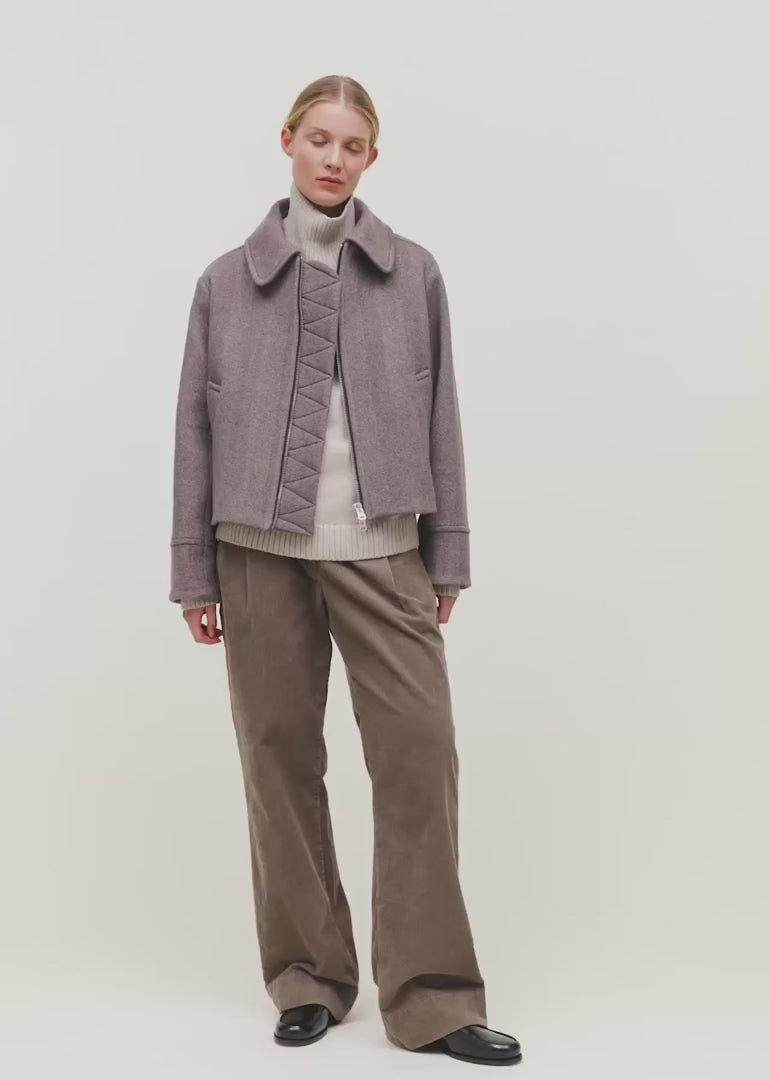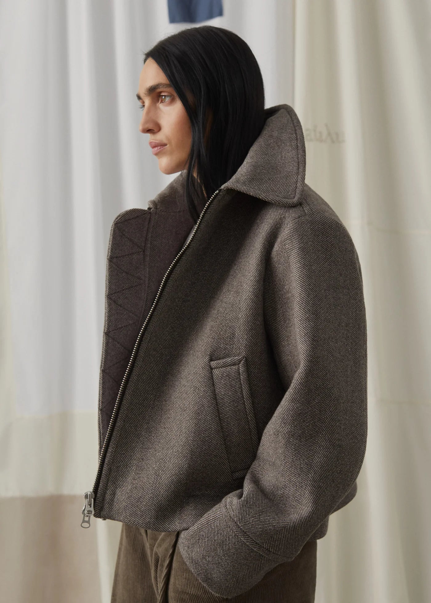 Aiayu skriver; A short, chic bomber jacket made from recycled wool from Manteco. Designed in a regular fit with a biker-inspired silhouette and distinctive details such as a voluminous collar, decorative contrast, zigzag stitching, and a heavy, silver two-way zip closure.