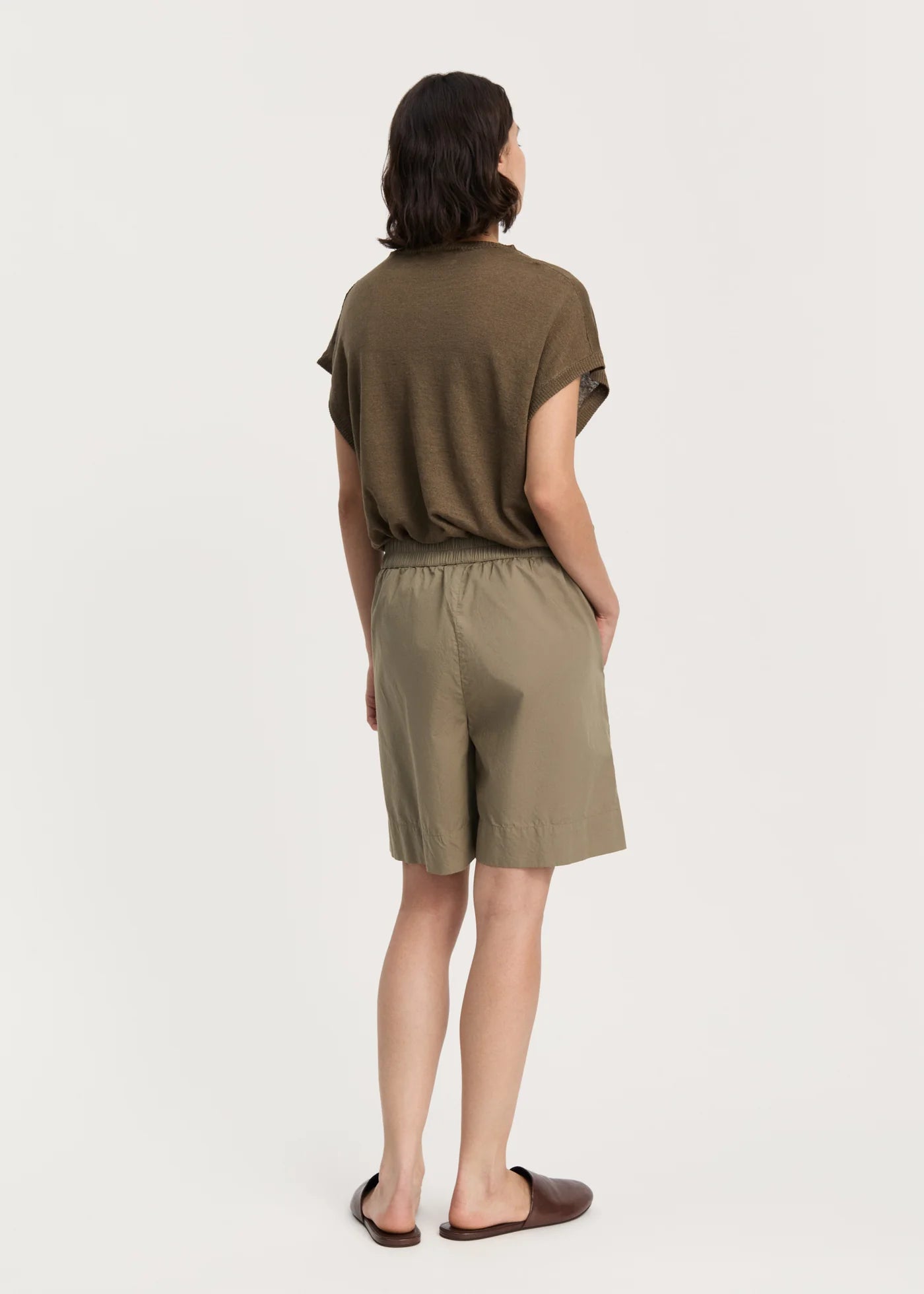 Relaxed fit. True to size - we recommend choosing your normal size. Bermuda fit - end just above the knees. Shorts long has a midrise waist and wide legs.