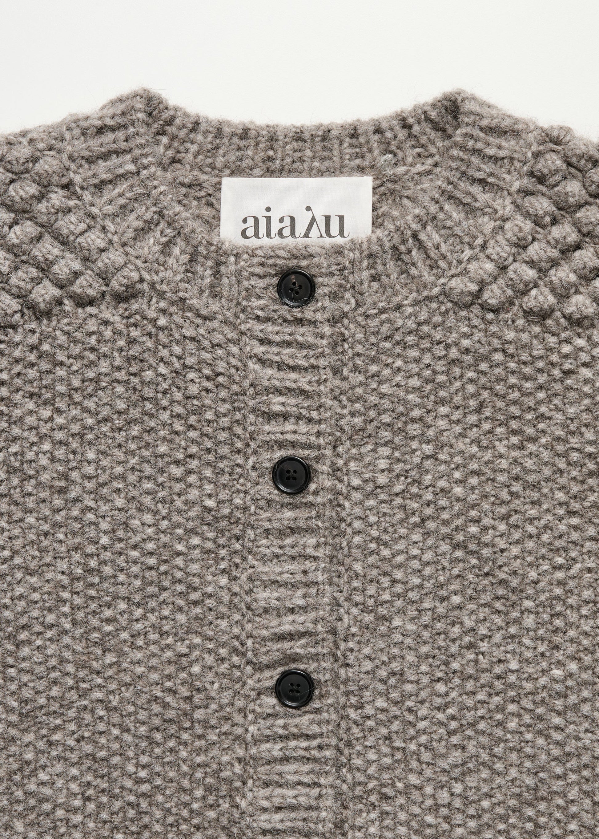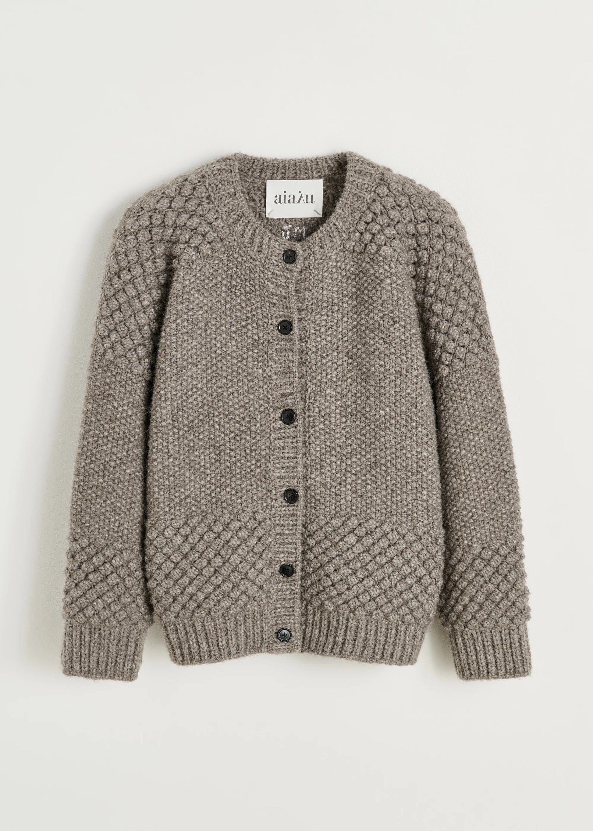 Aiayu skriver; A fluffy, voluminous cardigan made from undyed, soft llama wool. Hand-knitted with a unique structure that combines classic techniques with refined pearl knit and delicate mega-pearl details. Designed in an oversized fit with dropped shoulders and handmade horn buttons.