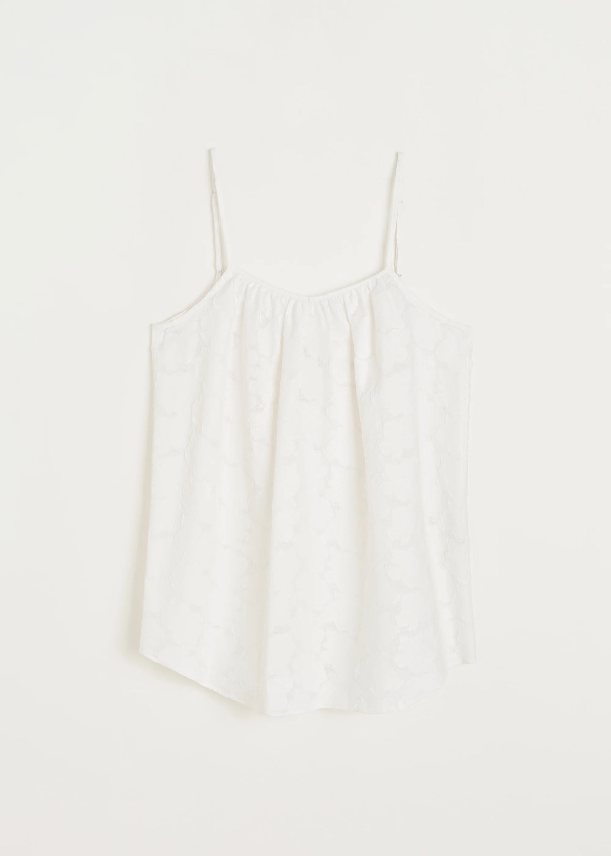 Aiayu skriver; A feminine top made from organic cotton in a slightly transparent jacquard, creating an elegant floral pattern. Designed in a relaxed fit with a simple ruched detail that adds volume, it features a back tie and adjustable thin shoulder straps.