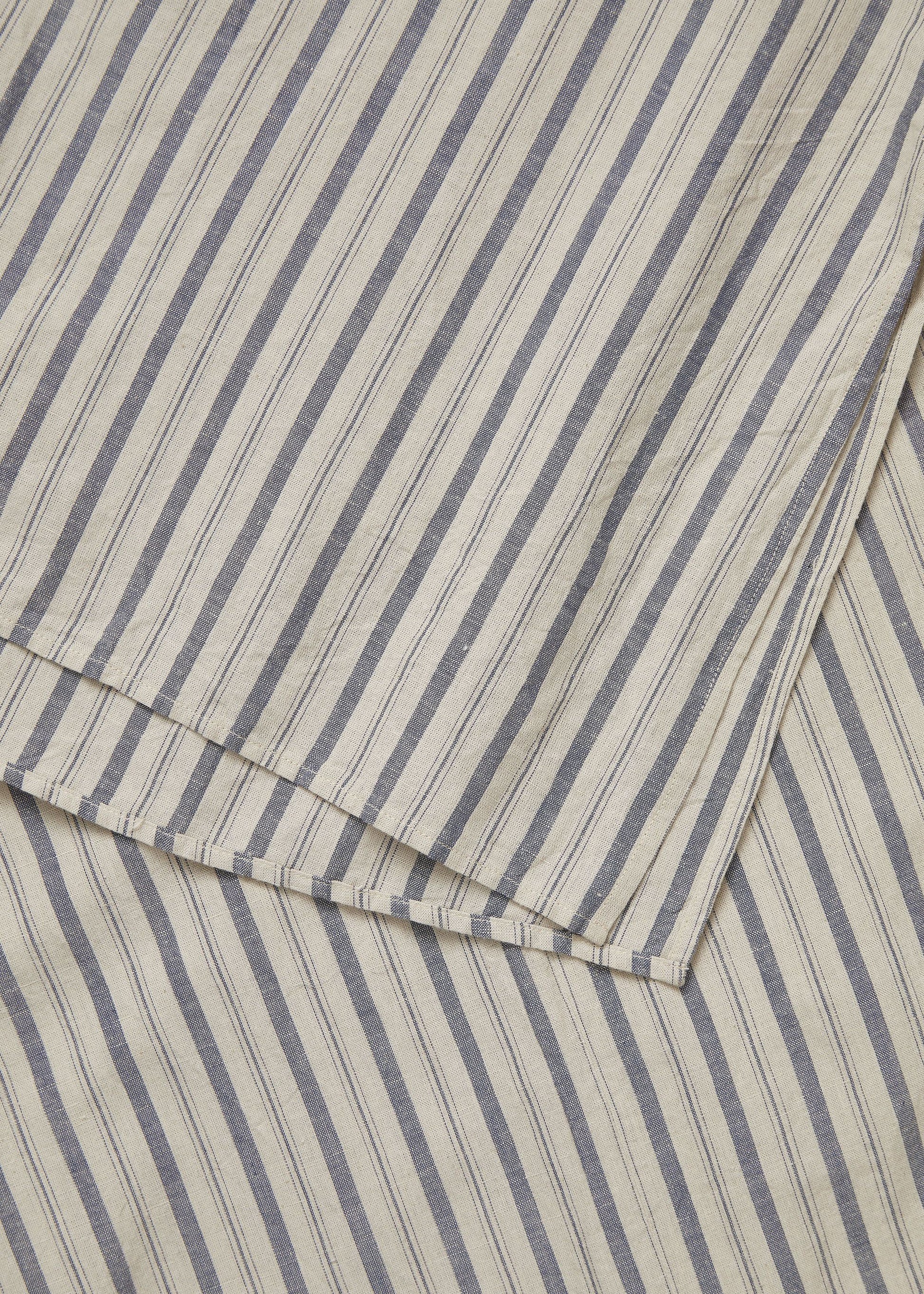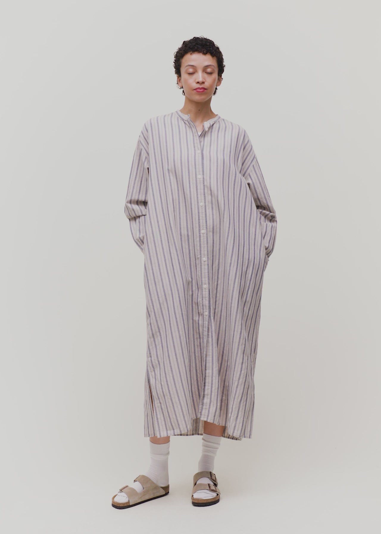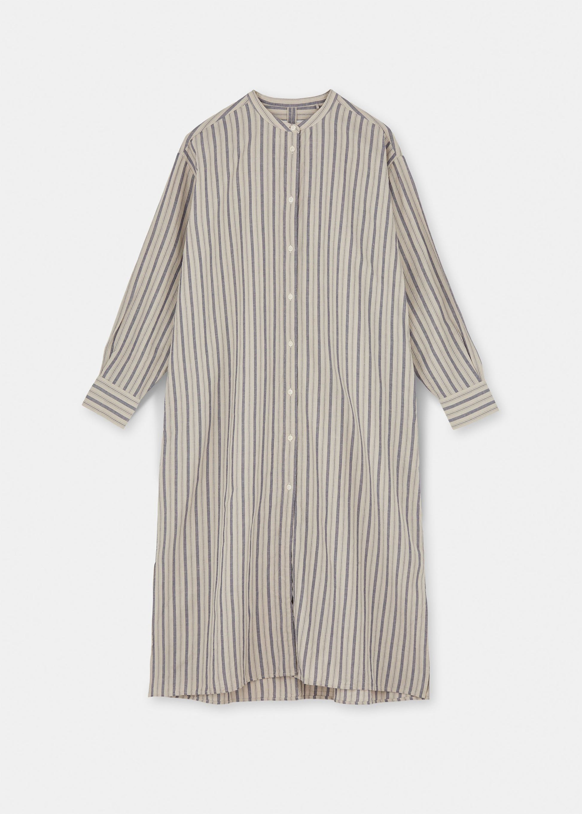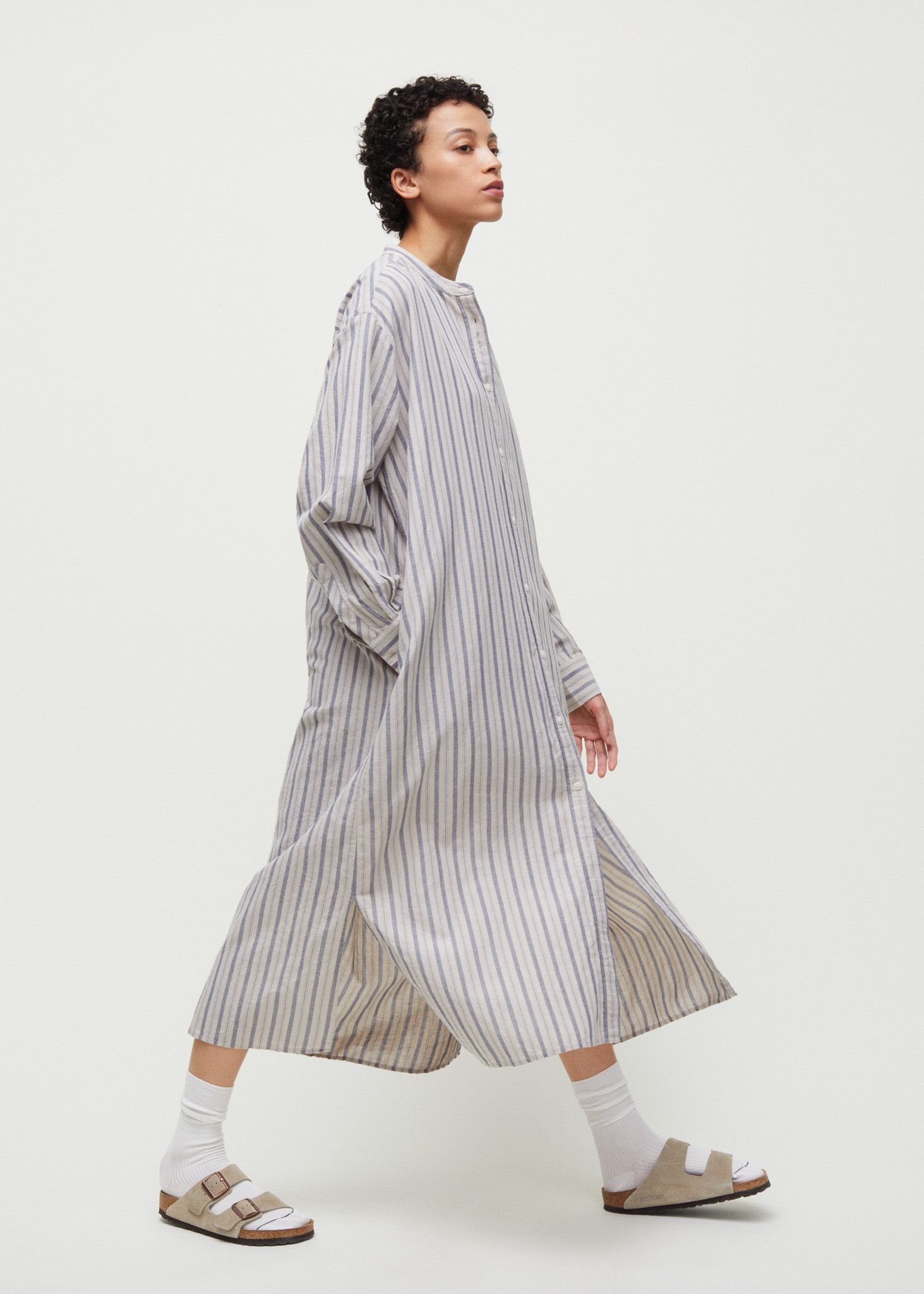 Aiayu skriver; Summer robe Lucca is an above ankle-length shirt dress with a standing-collar made in a soft and durable organic cotton and linen mix. The dress has regular shirt sleeves with cuffs, a straight fit with side seam pockets and slits. It is finished with natural Corozo buttons made from nutshell.