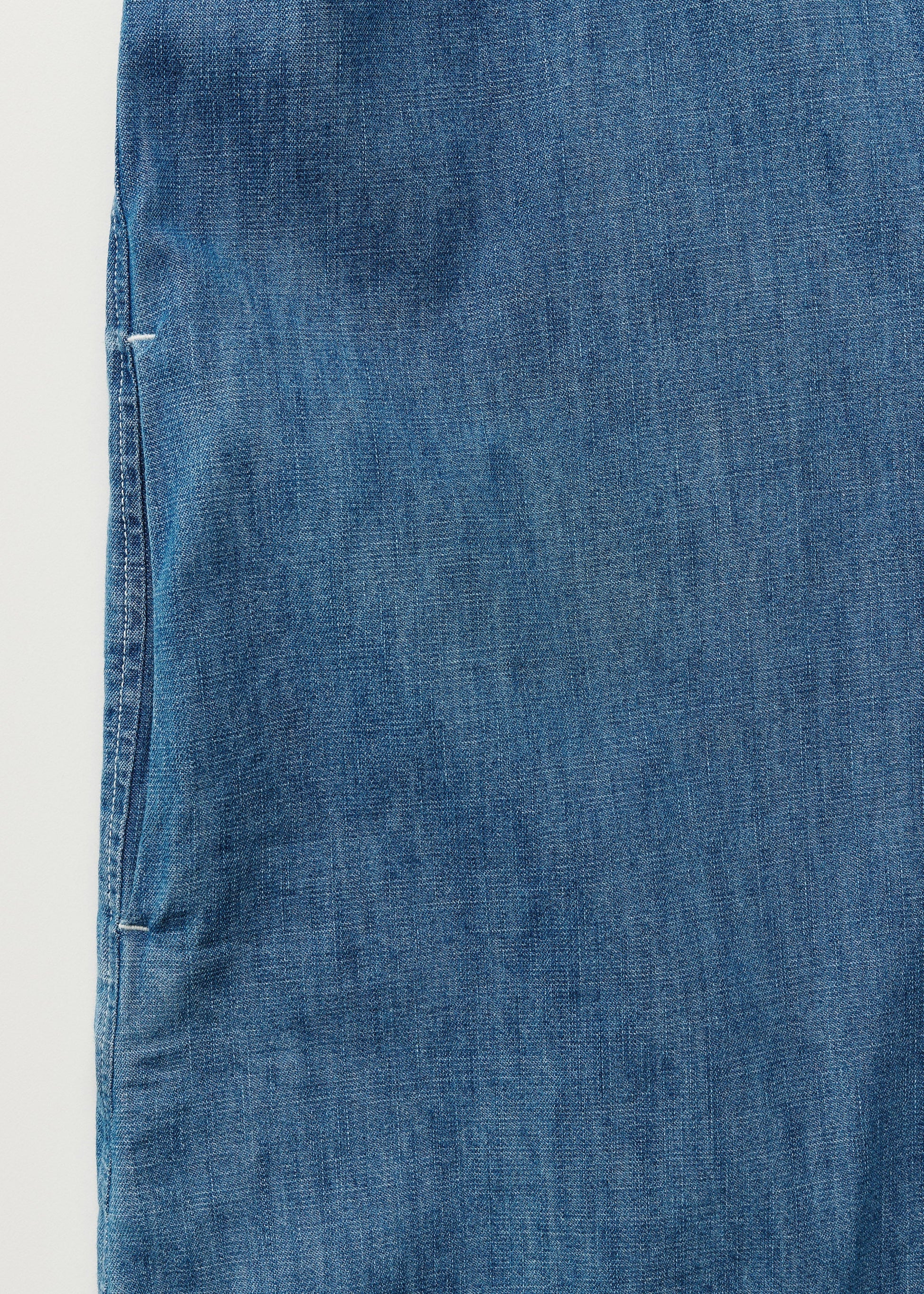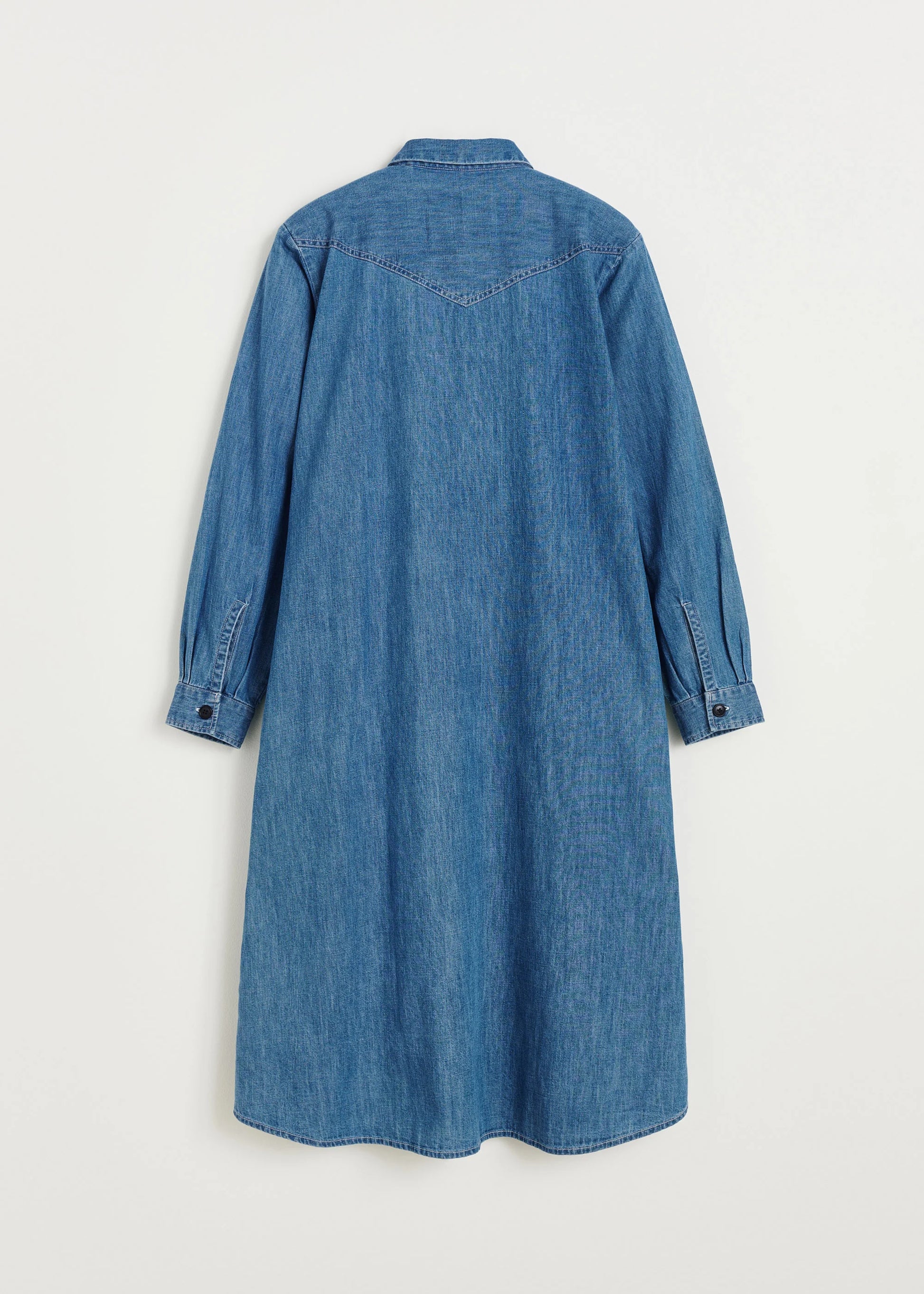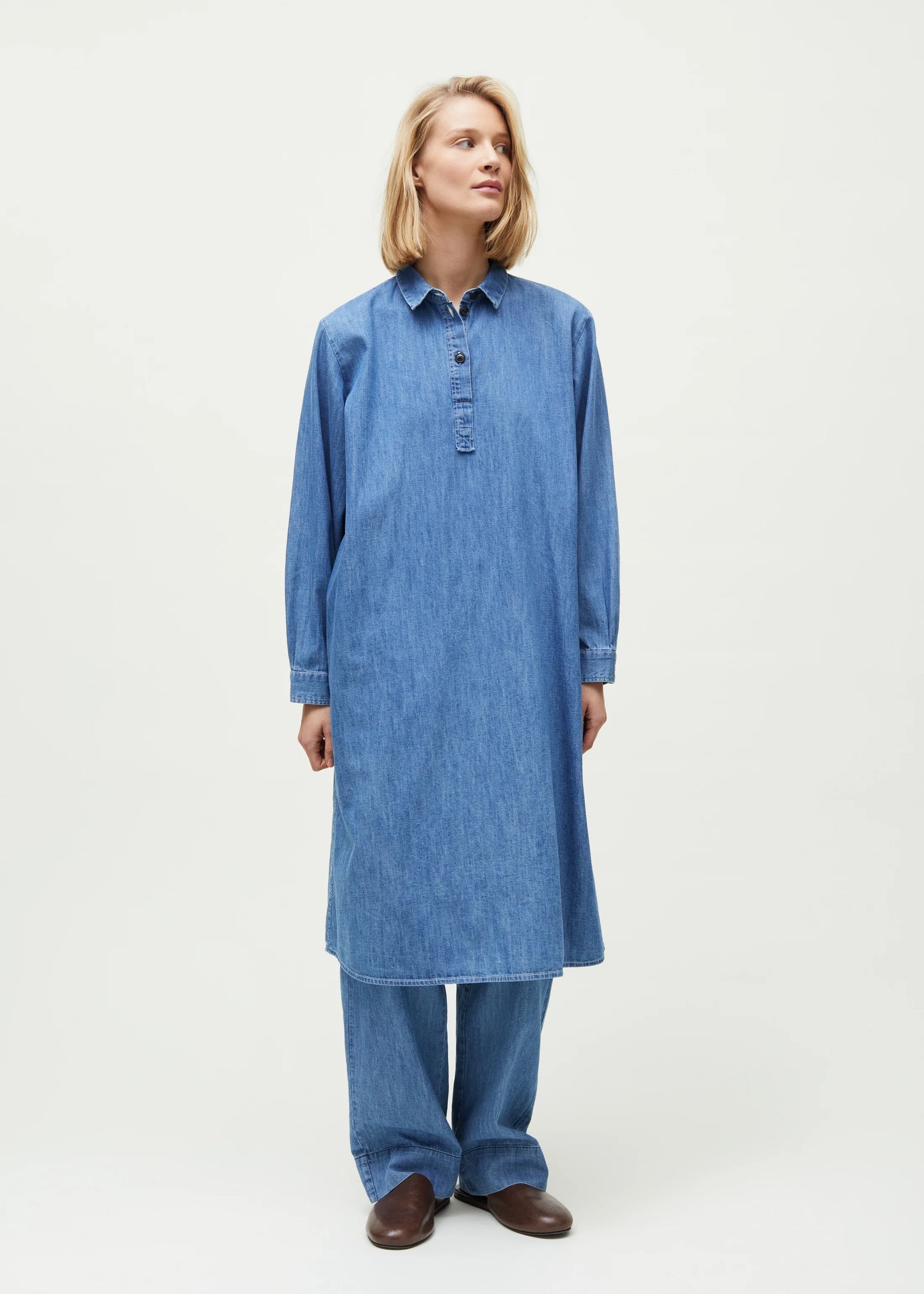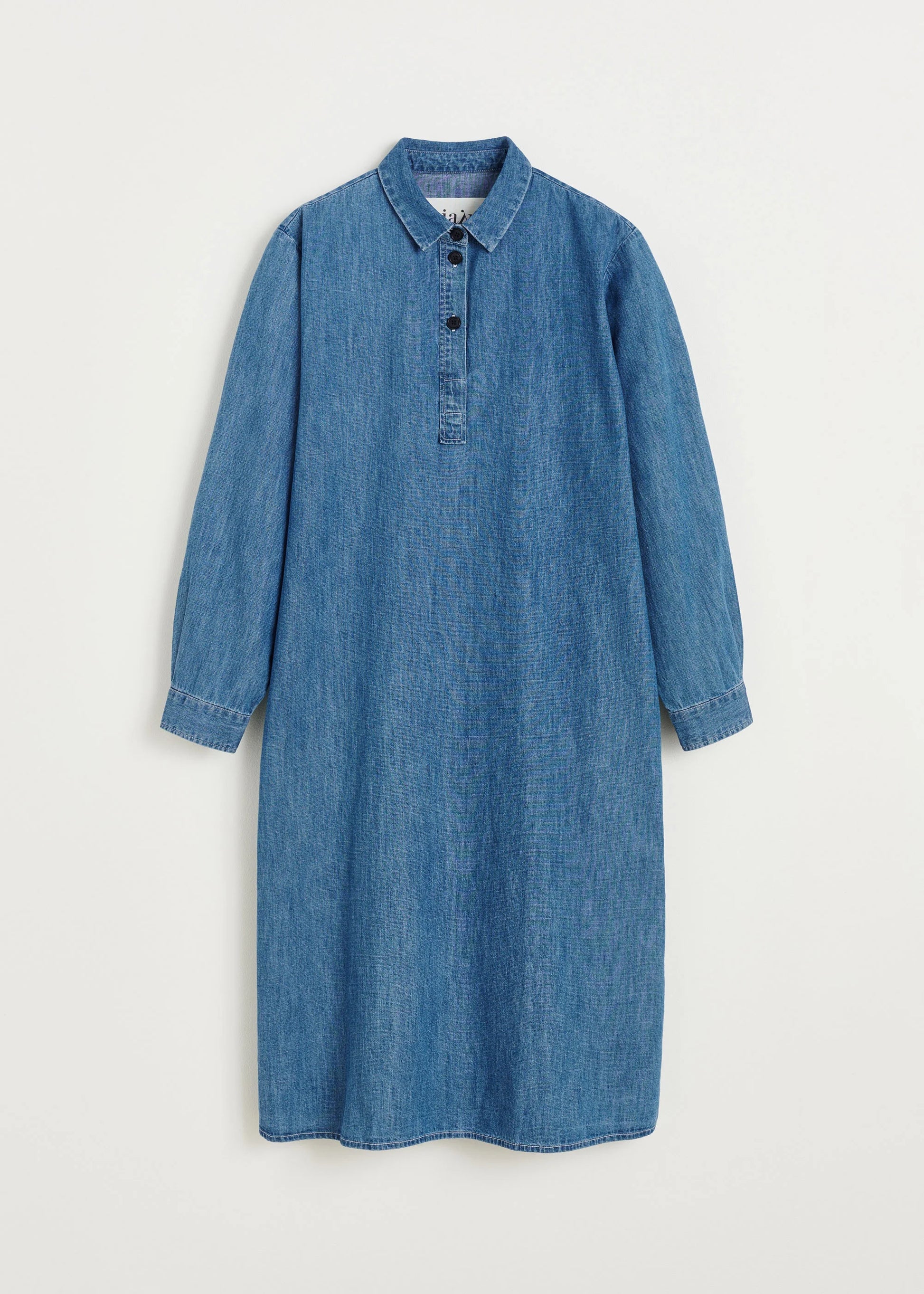 Aiayu skriver; A soft, elegant denim dress made from organic cotton. The dress is designed in a relaxed fit and features distinctive details such as a polo fastening, cuffs, side pockets, and an oversized yoke on the back.