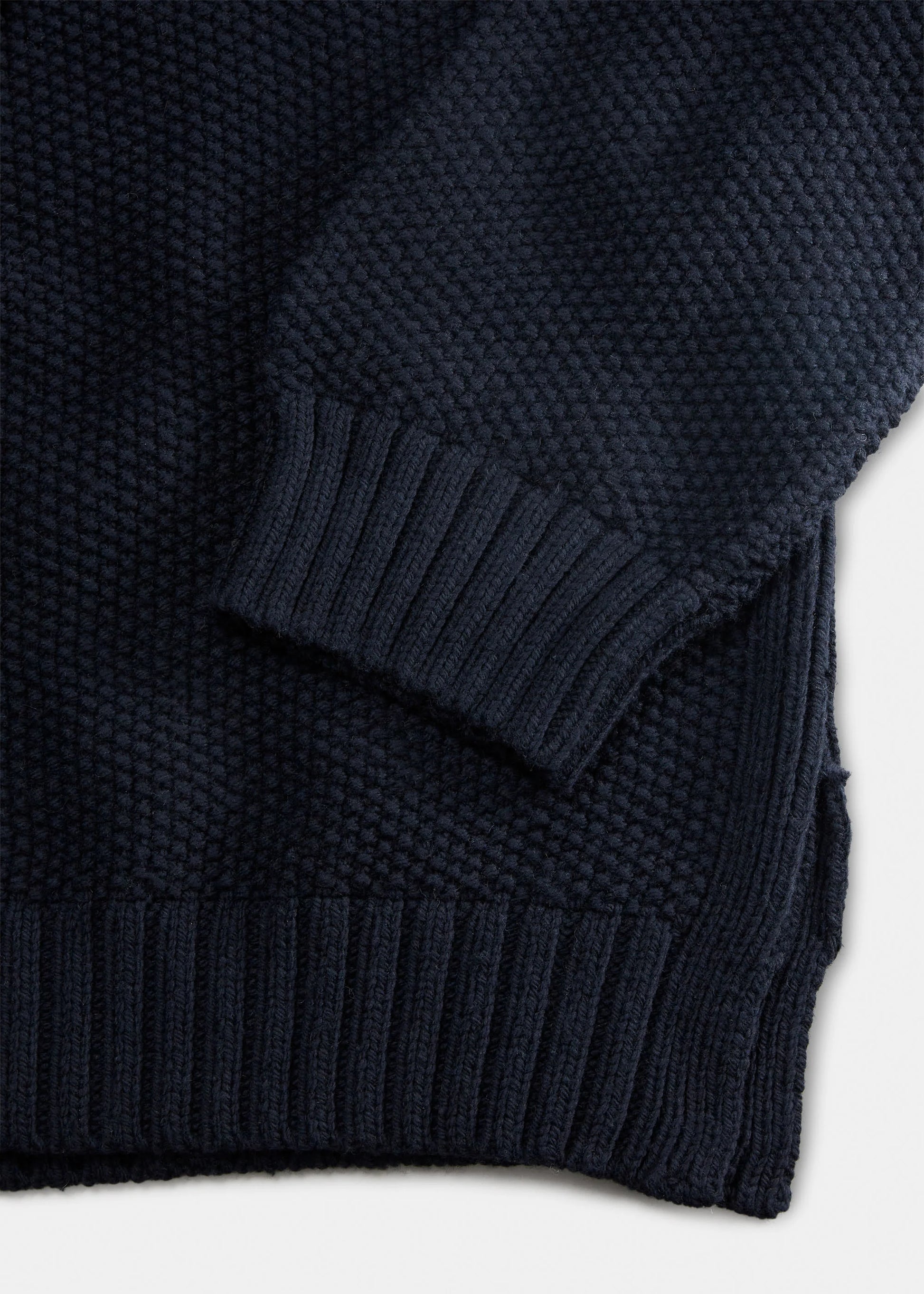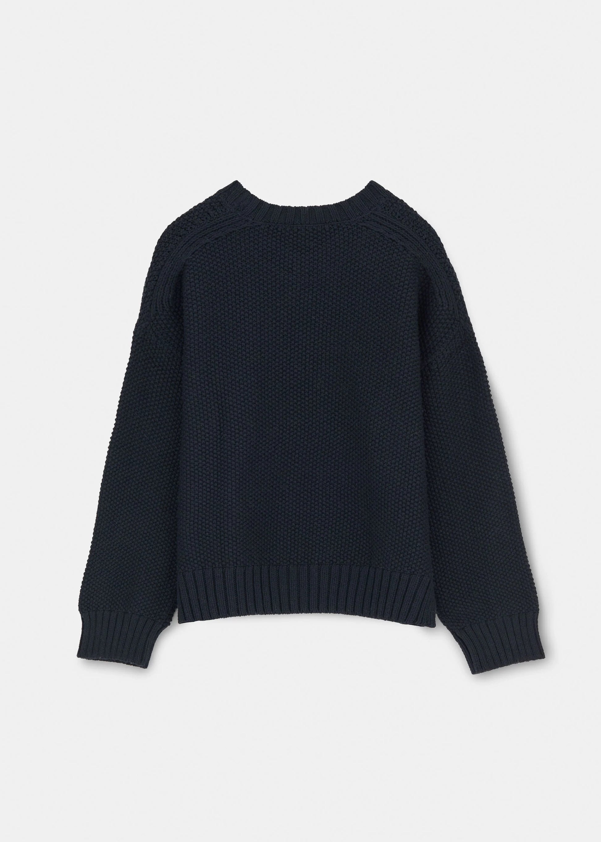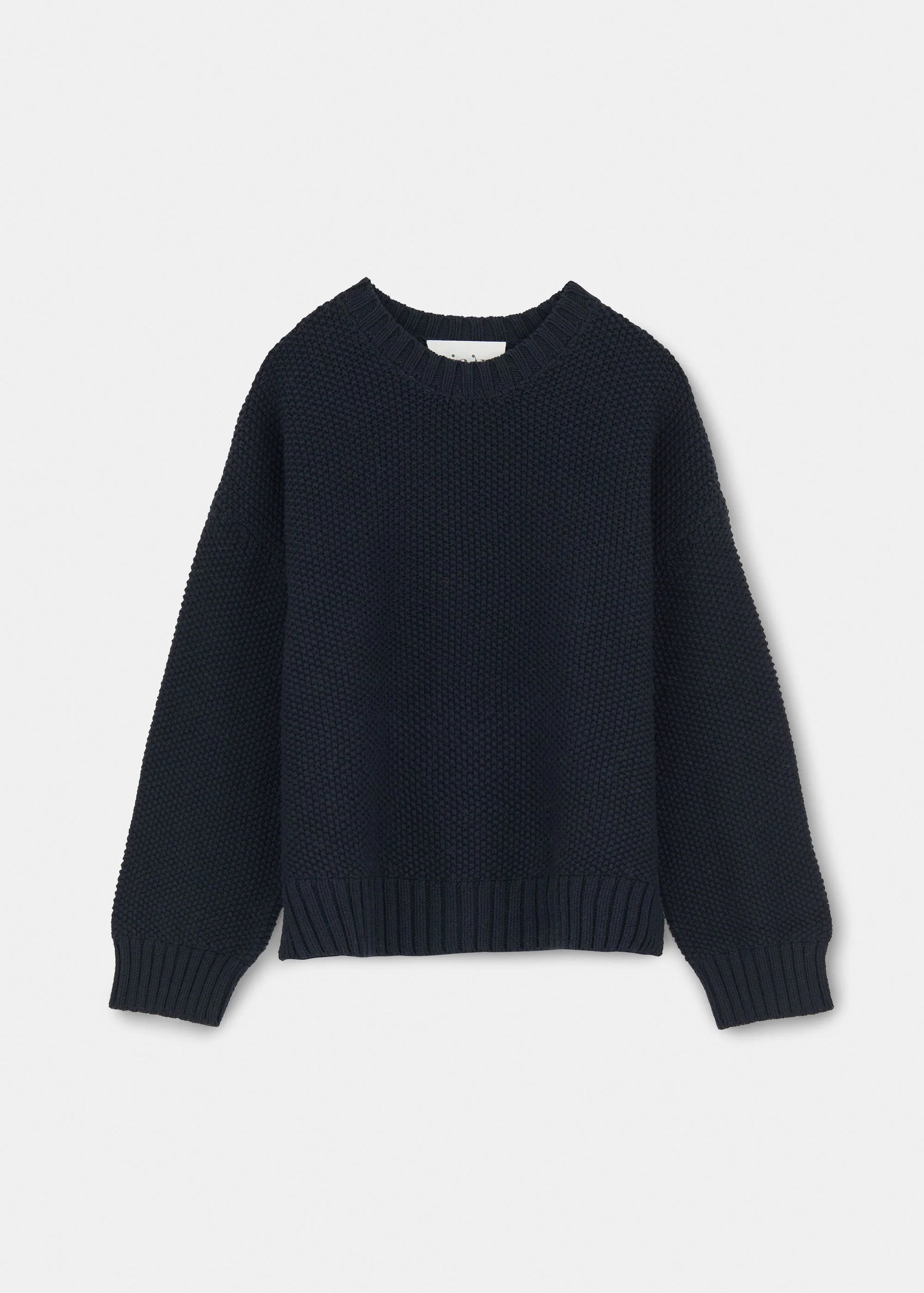 Aiayu skriver; A delicate sweater made from soft, thick highland wool. Designed in a boxy fit with an elegant pearl knit and ribbed edges, providing a refined look. Finished with a round neckline, dropped shoulders, and high side slits.