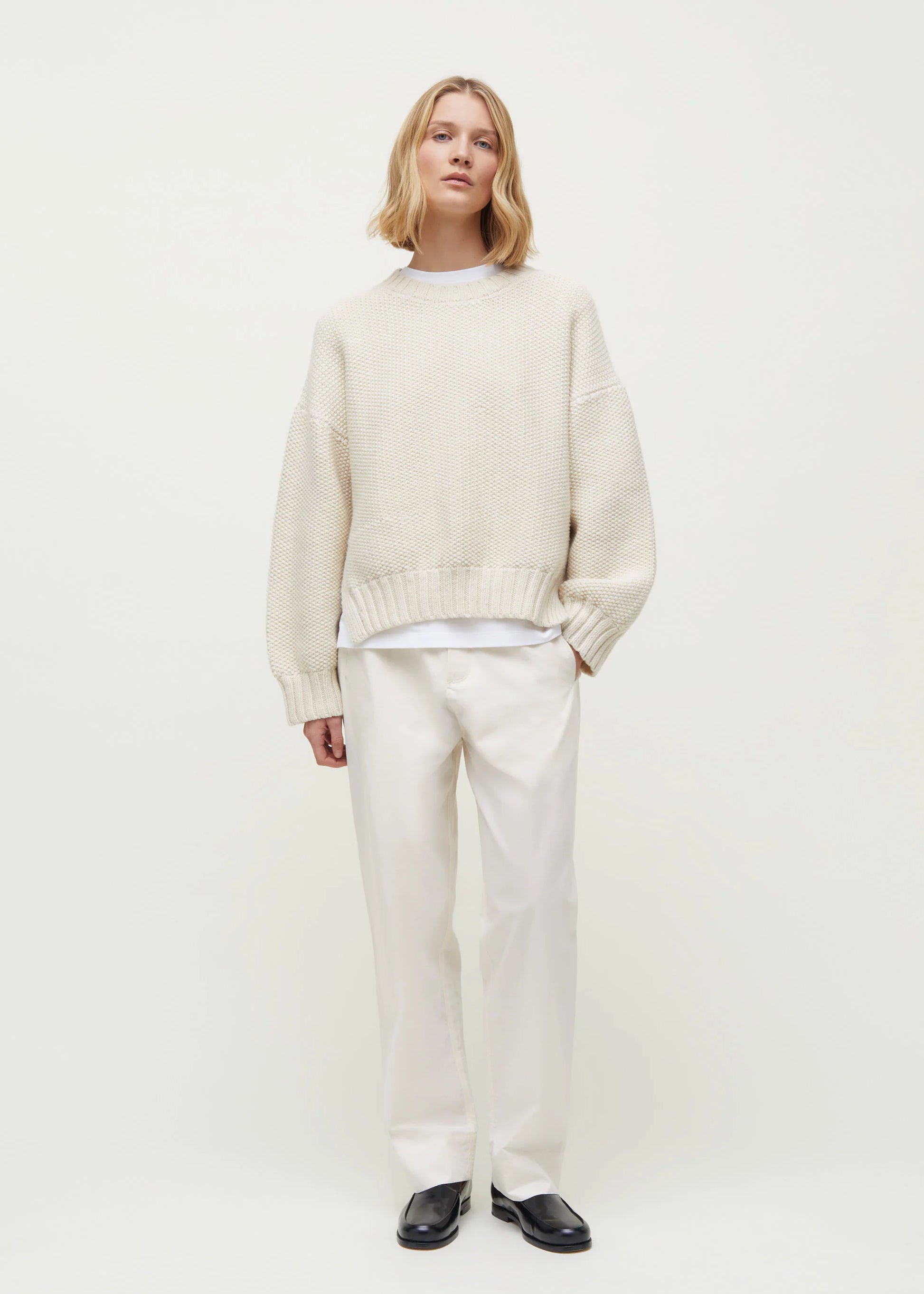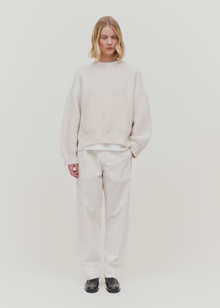 Aiayu skriver; A delicate sweater made from soft, thick highland wool. Designed in a boxy fit with an elegant pearl knit and ribbed edges, providing a refined look. Finished with a round neckline, dropped shoulders, and high side slits.