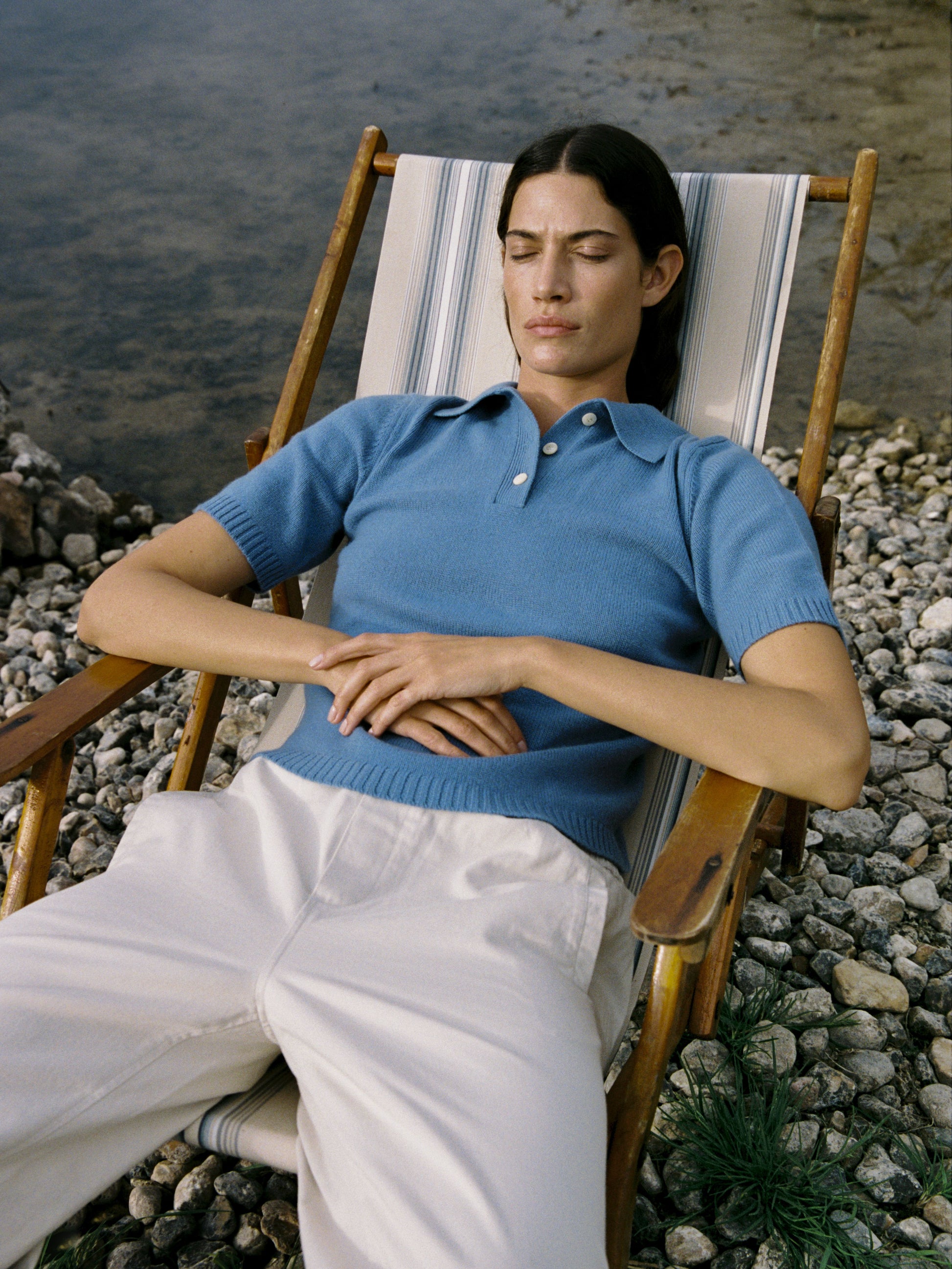 Aiayu skriver; Vida is a refined 100% cashmere polo neck t-shirt. It is incredibly soft and plush, with a slightly dense texture. Vida has a classic fit and is complemented a button closure, a thin polo collar and ribbed detailing.