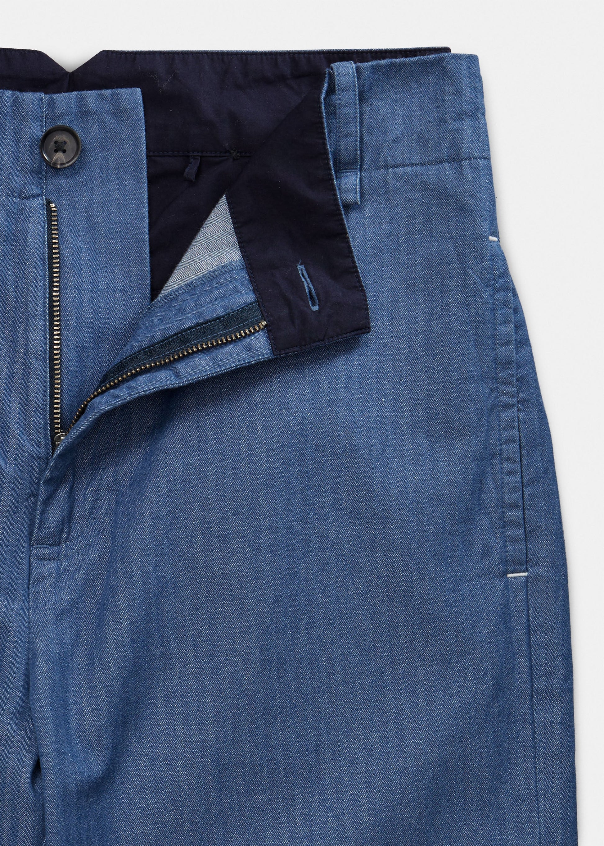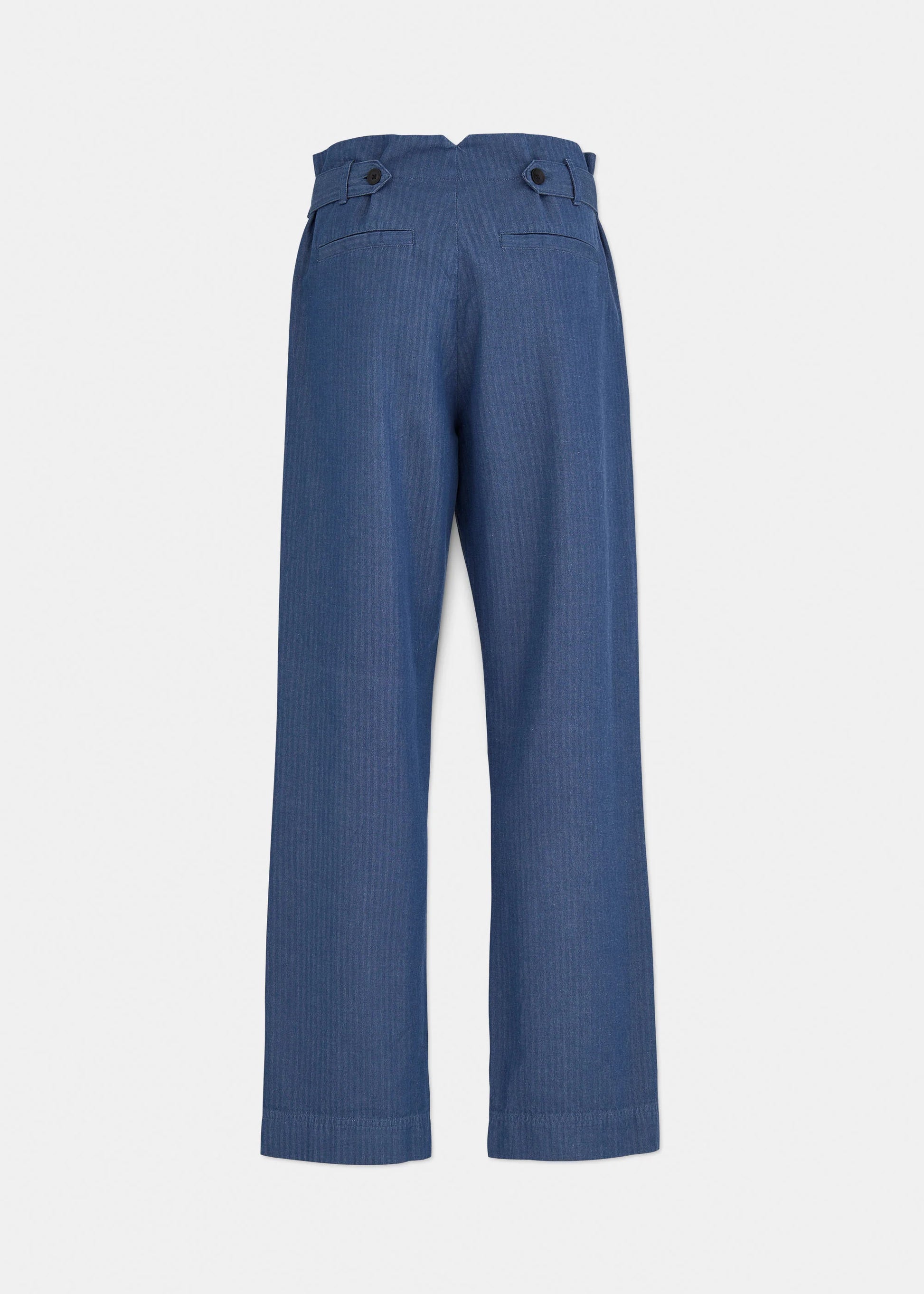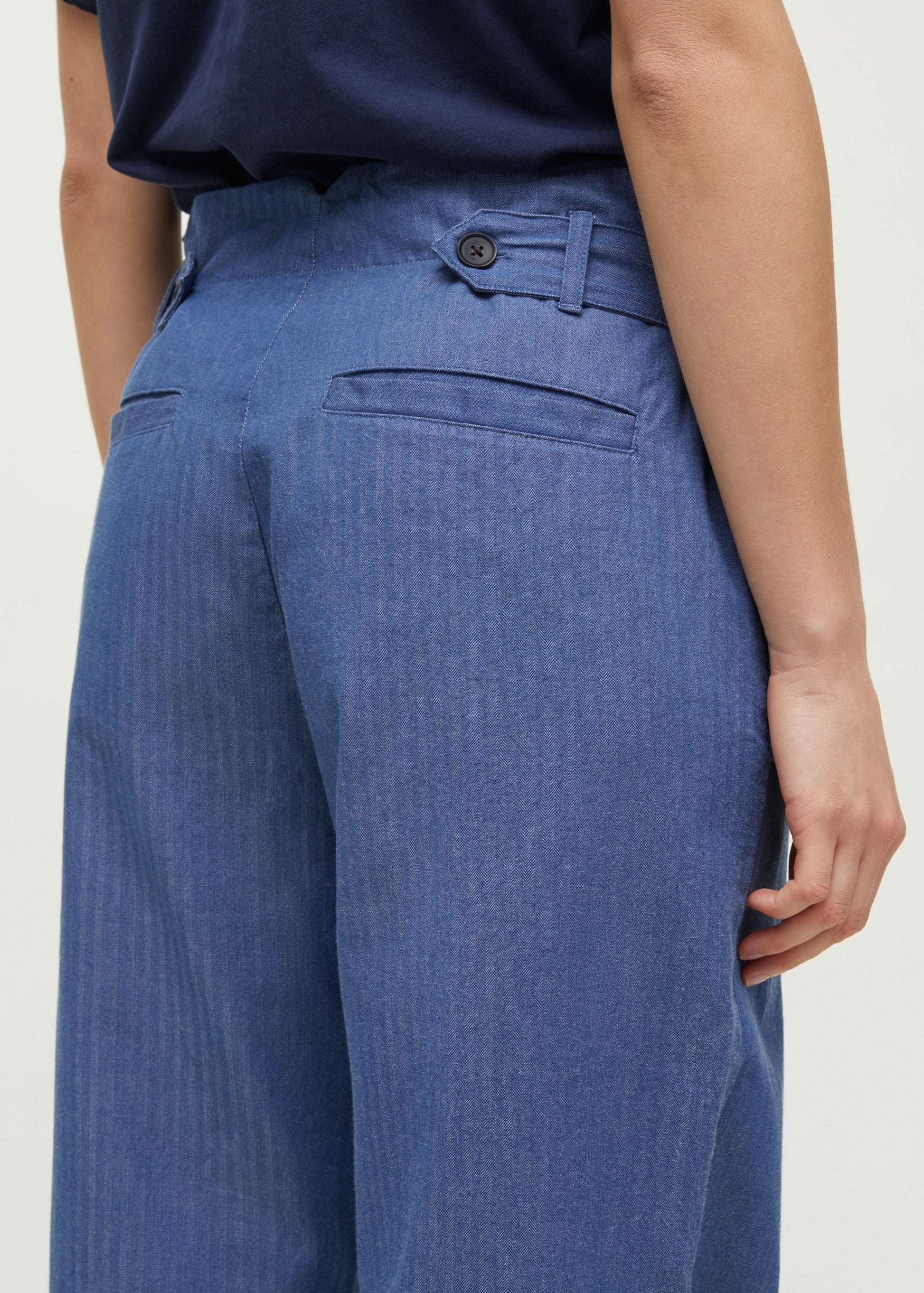 Aiayu skriver; A pair of refined trousers with straight legs and a high waist, made from organic cotton in a herringbone weave. Detailed with adjustable straps at the waist, welt pockets, and a delicate V-detail at the back.