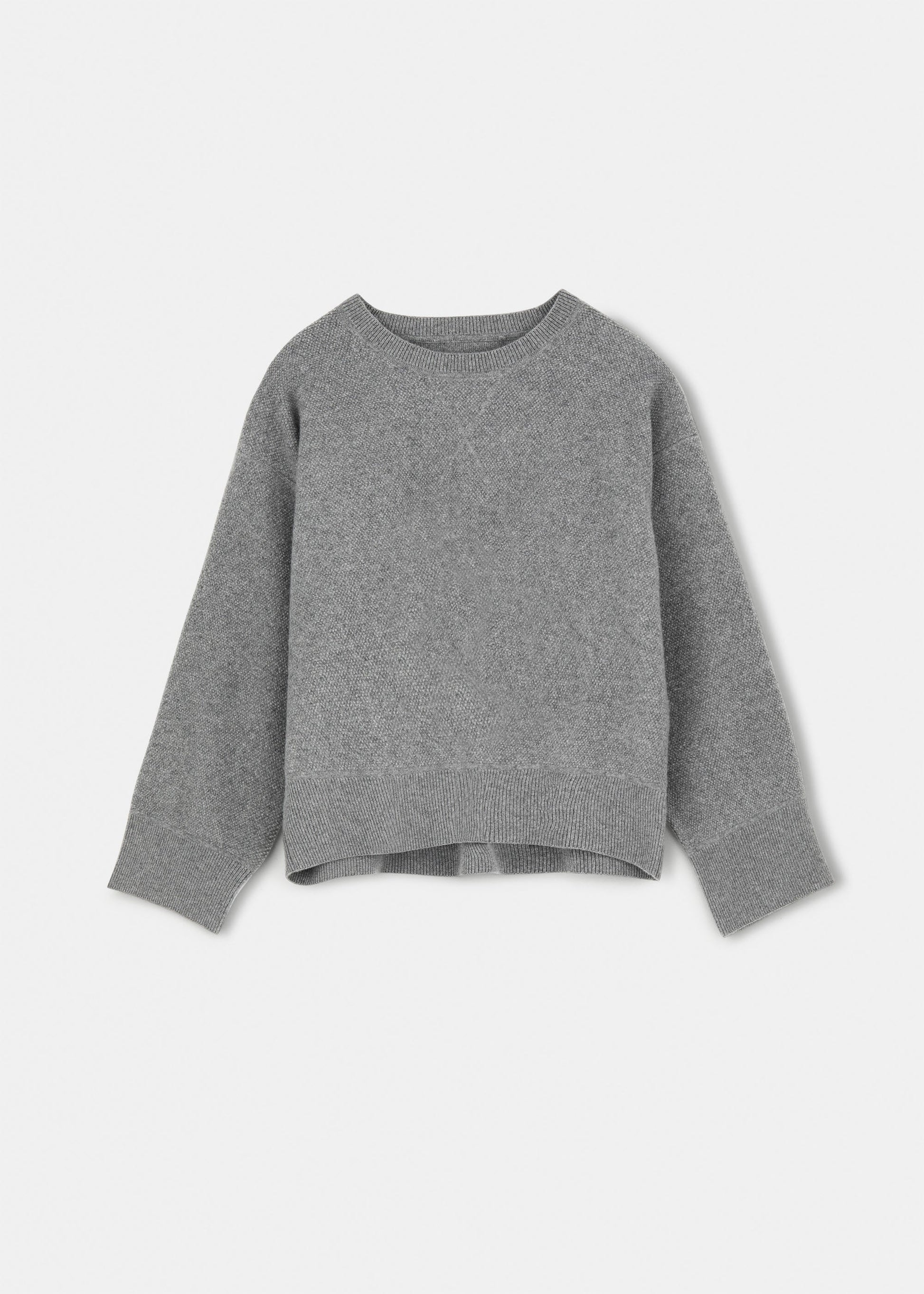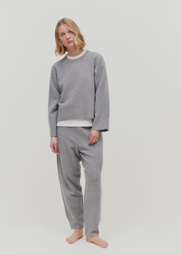 Aiayu skriver; An exceptionally soft sweater made from a premium blend of wool and cashmere in a warm, light gray tone. Designed in a boxy fit with a modern cropped silhouette, featuring an sporty terry knit pattern with ribbed edges and overlock seams.