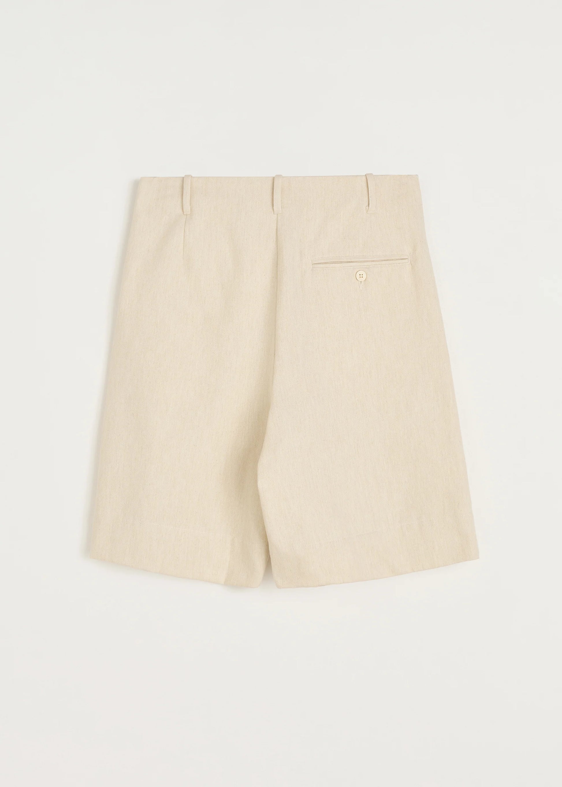 Aiayu skriver; Bermuda-inspired shorts with a tailored look, made in heavy 100% organic Chetna cotton. Willy features an invisible waistband with belt loops, slanted pockets and pleat detailing. Willy comes with contrast-coloured handmade horn buttons.