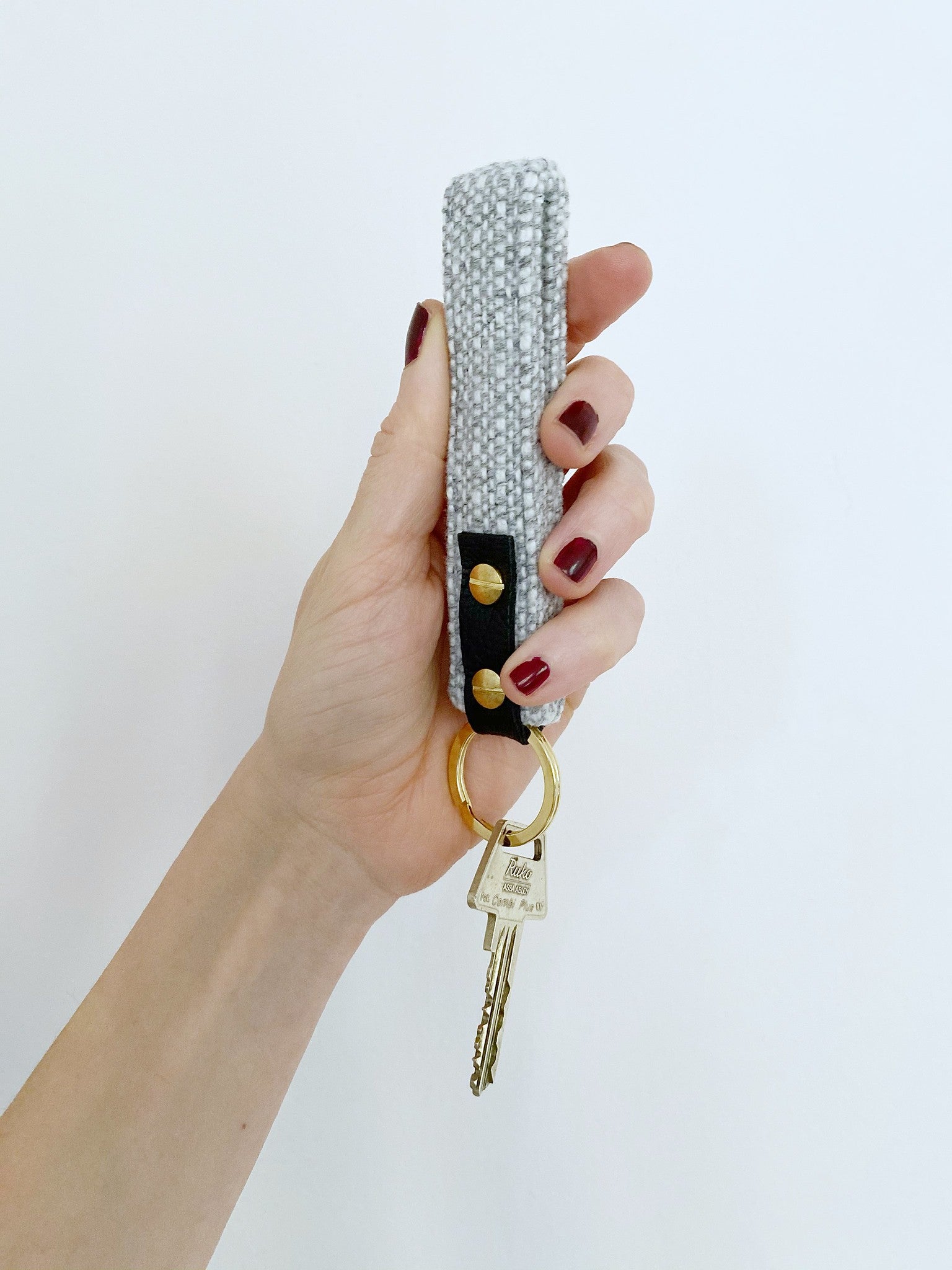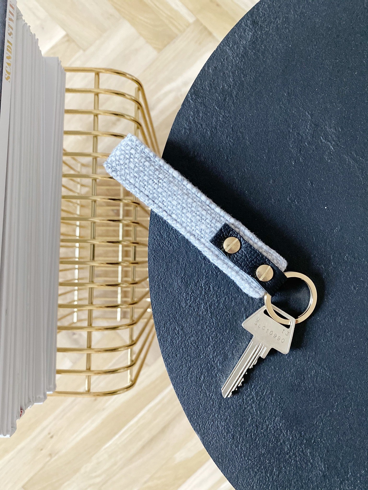 Nøgleringen er syet i en eksklusiv kombination af gråt, kraftigt stof og sort skind.